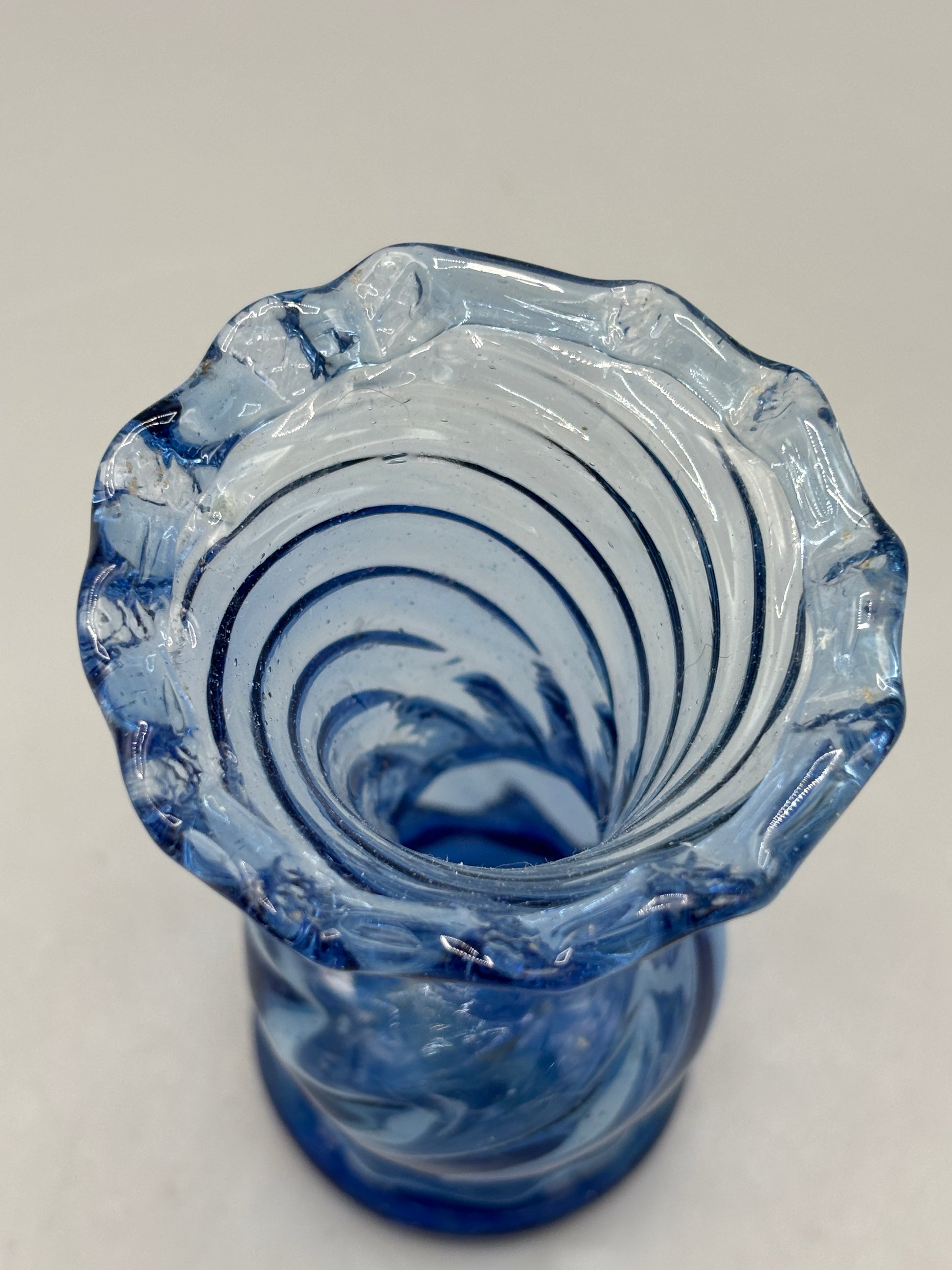 Blue Swirl ruffled flower bud vase that is small but stunning. This shade of blue looks great in any light. This shows no cracks or chips.