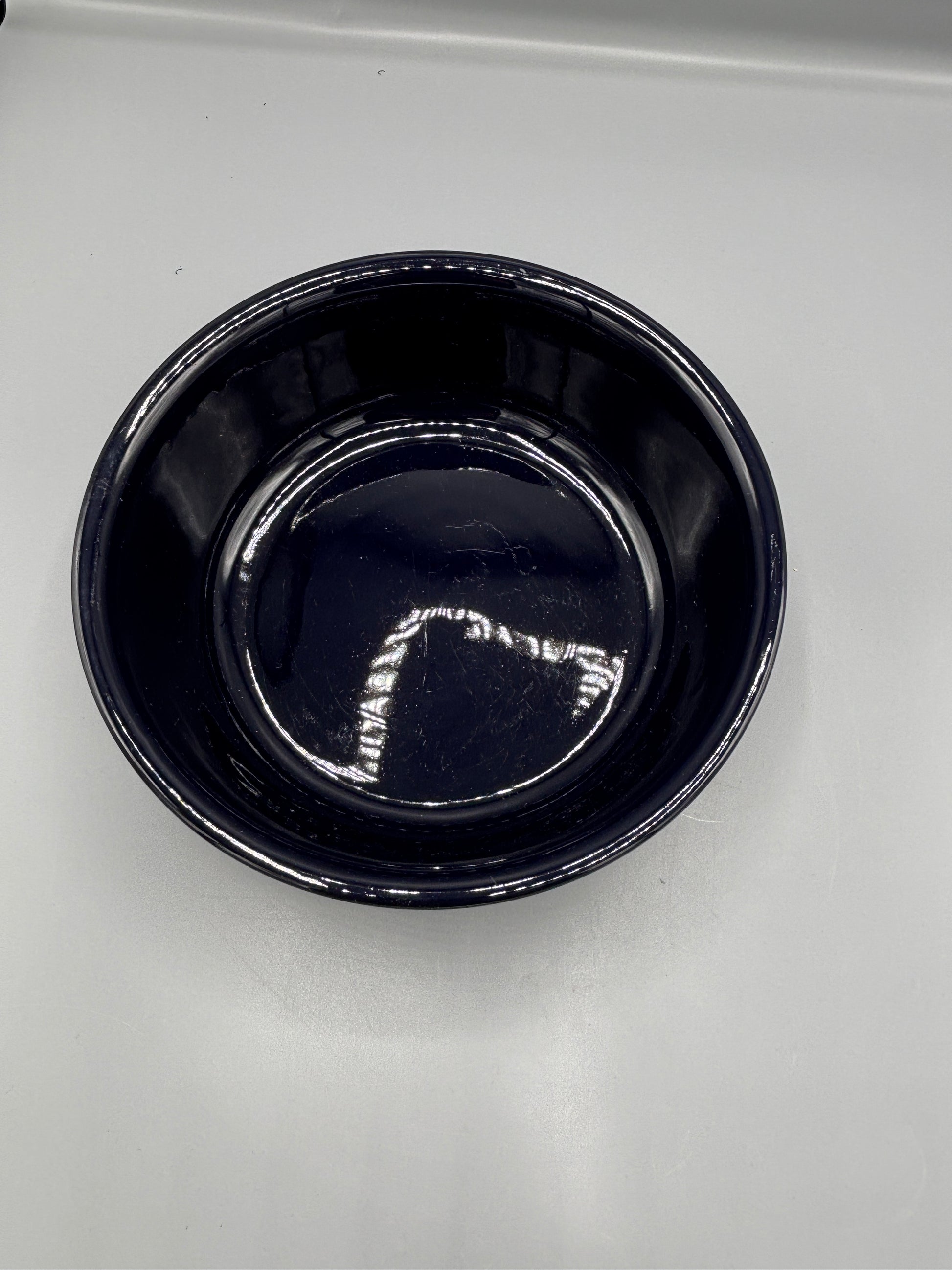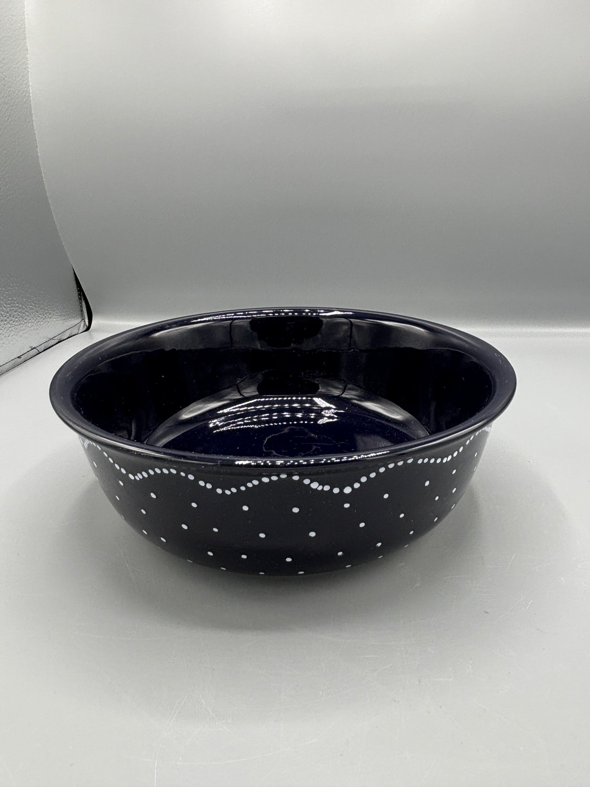 Ceramic serving bowl that has a lovely shade of blue and Polka dots. This is a large bowl and does show some scratches, refer to pictures details.