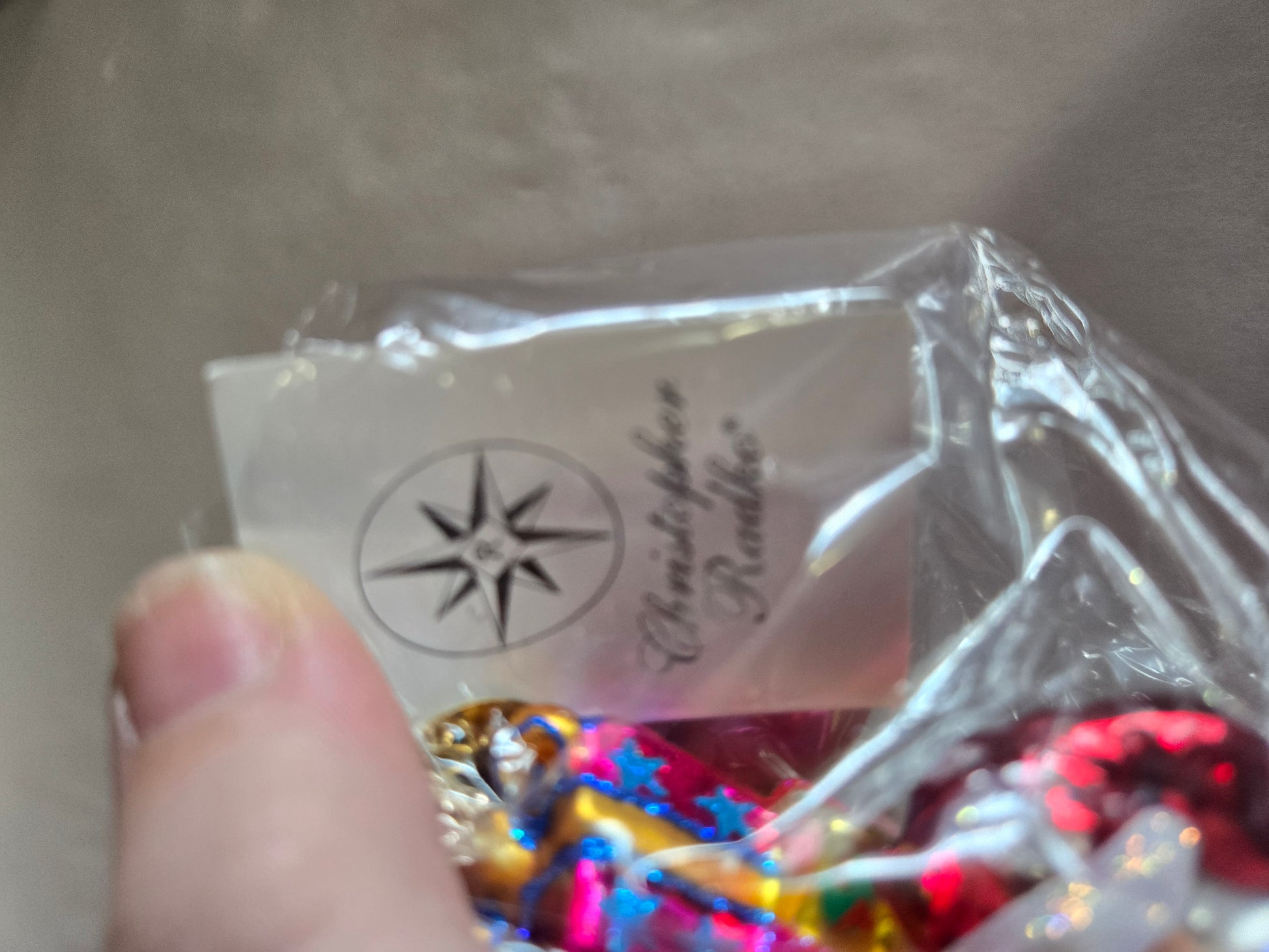 Celebrate the season with this Christopher Radko collectible featuring a jolly Santa laden with wrapped gifts. Pristine condition with original packaging, sealed plastic casing, and intact tags. This charming piece measures 6 inches tall by 2.5 inches wide, making it an ideal addition to any curated holiday collection or display.