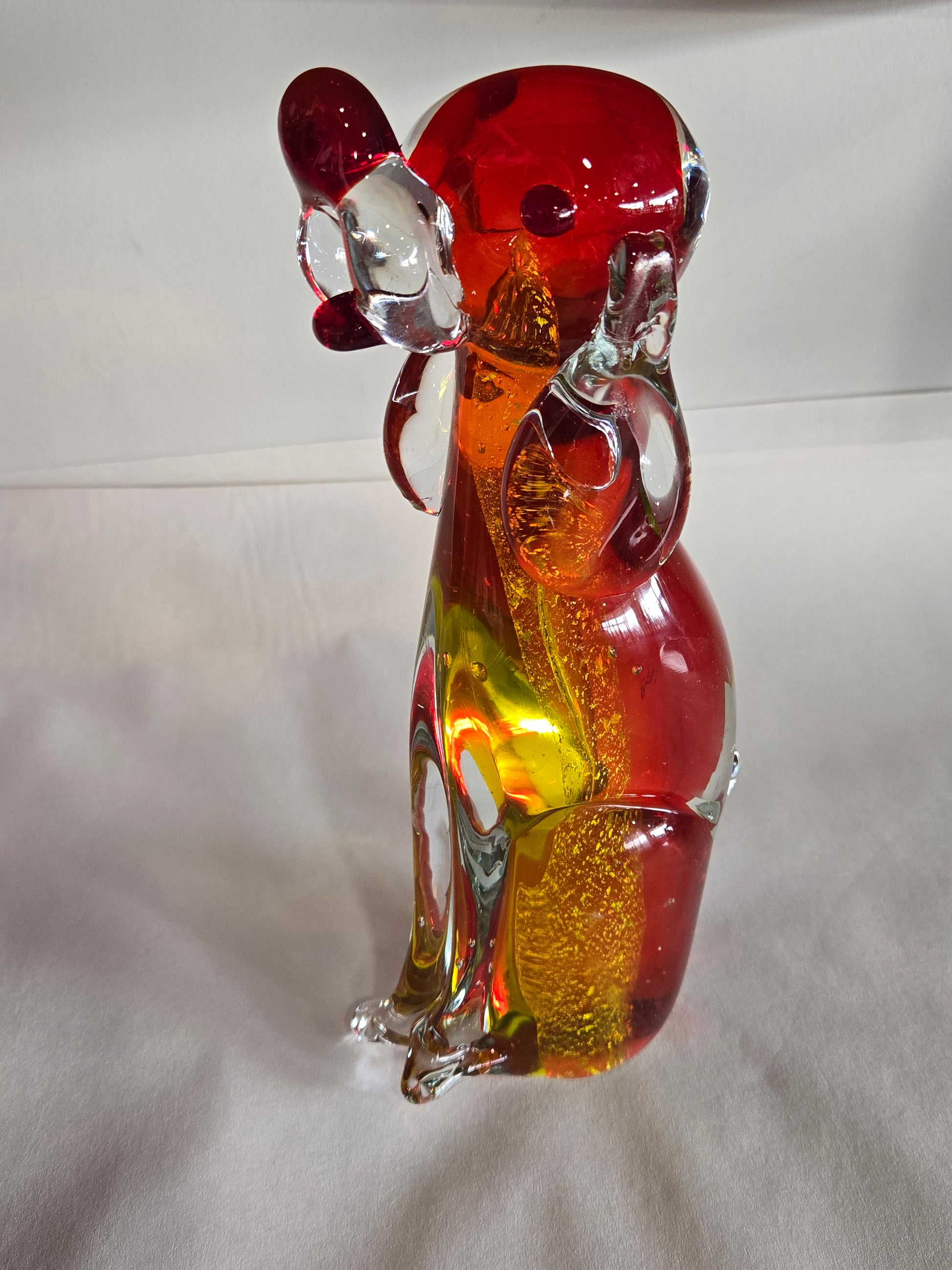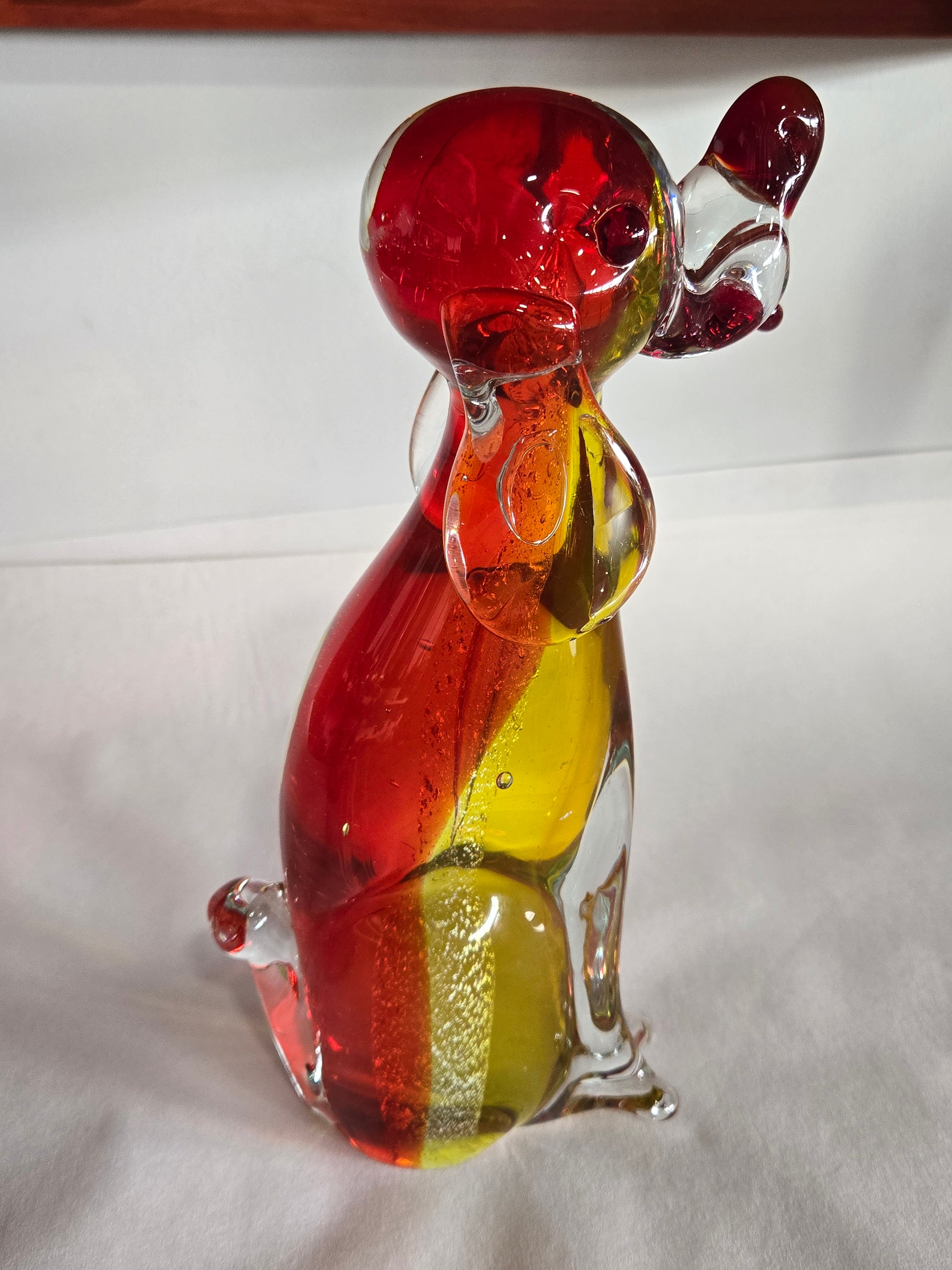 This striking Murano glass canine sculpture showcases the artistry of traditional Venetian glassmaking with its vibrant, multi-hued palette. A distinctive feature emerges under black light, when the piece emits an enchanting glow—perfect for collectors seeking conversation-starting décor. Standing 10 inches tall and 5 inches wide, this handcrafted figurine brings sophisticated color and luminous character to any display. Note: The piece exhibits surface characteristics or flea bites consistent with authentic artisanal glass production.