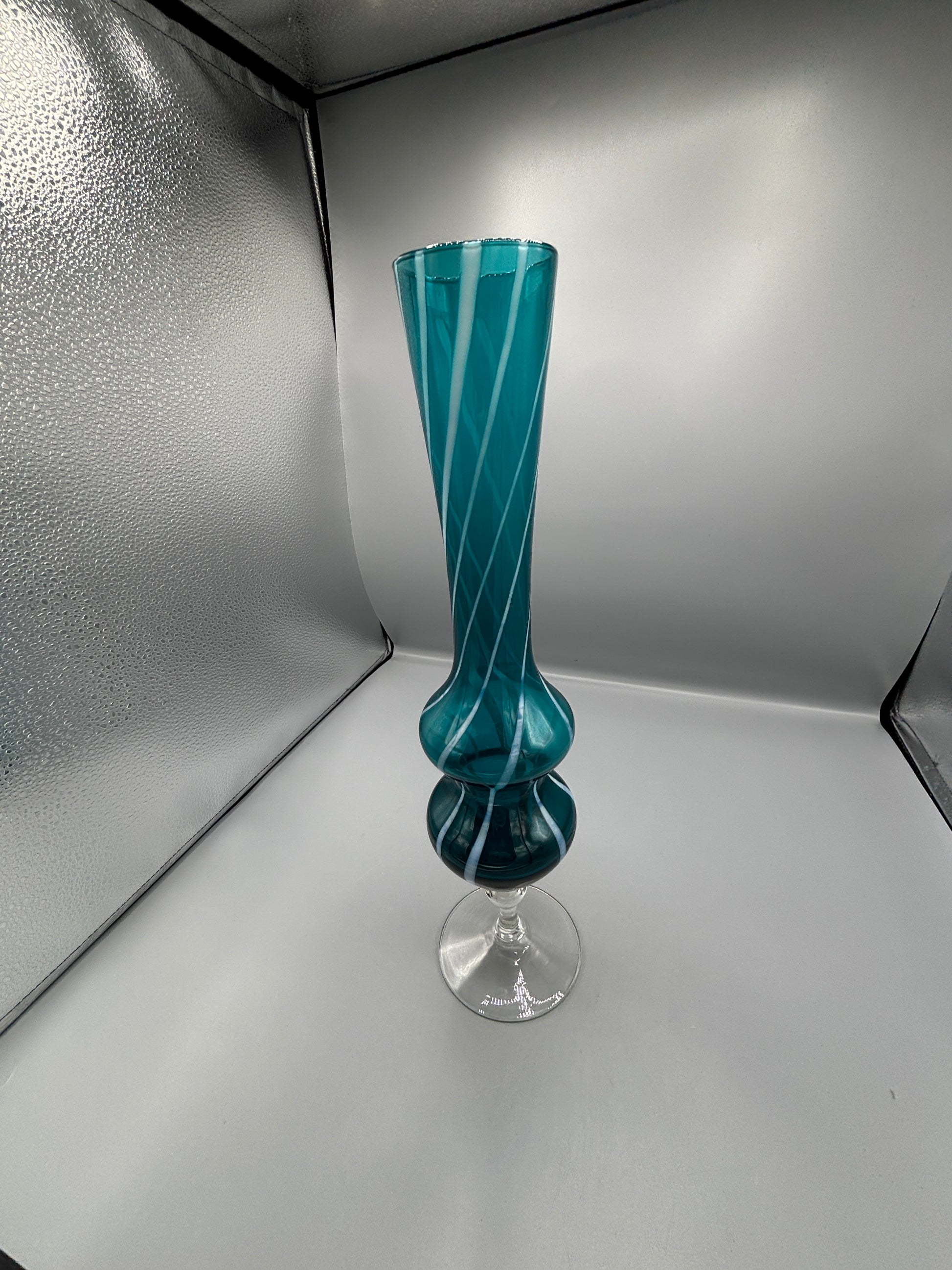 Fall blue & white swirl vase that makes a statement in any room. This is a tall vase that is lovely all year. Has flaw of 1 circle on white swirl