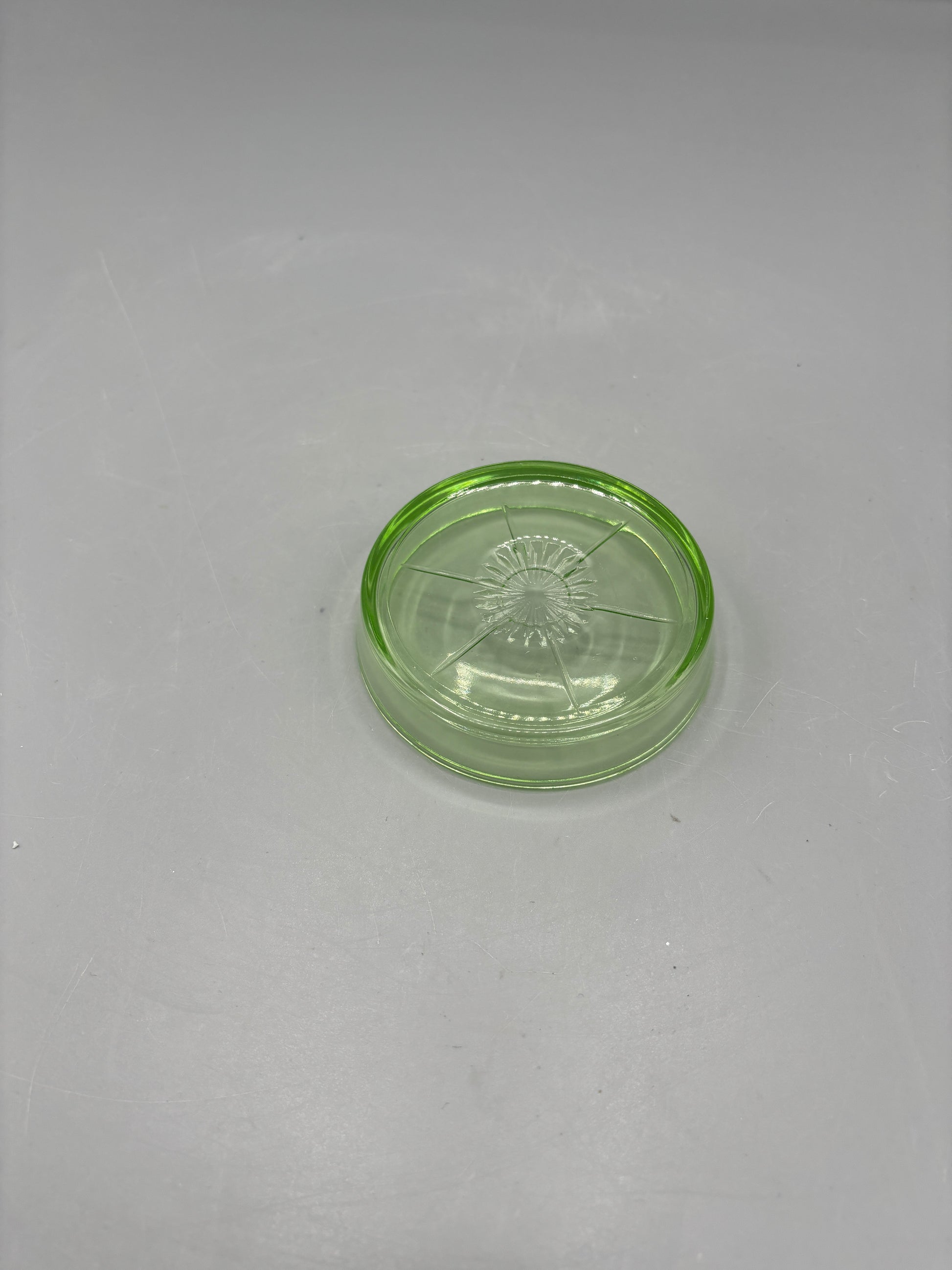 The perfect piece for the collector without a lot of space! This uranium coaster is made by Federal Glass and features the makers mark right in the center. Although the mark is faint, you can see the shield with the capital F in the center. There is one very small chip to the bottom rim.