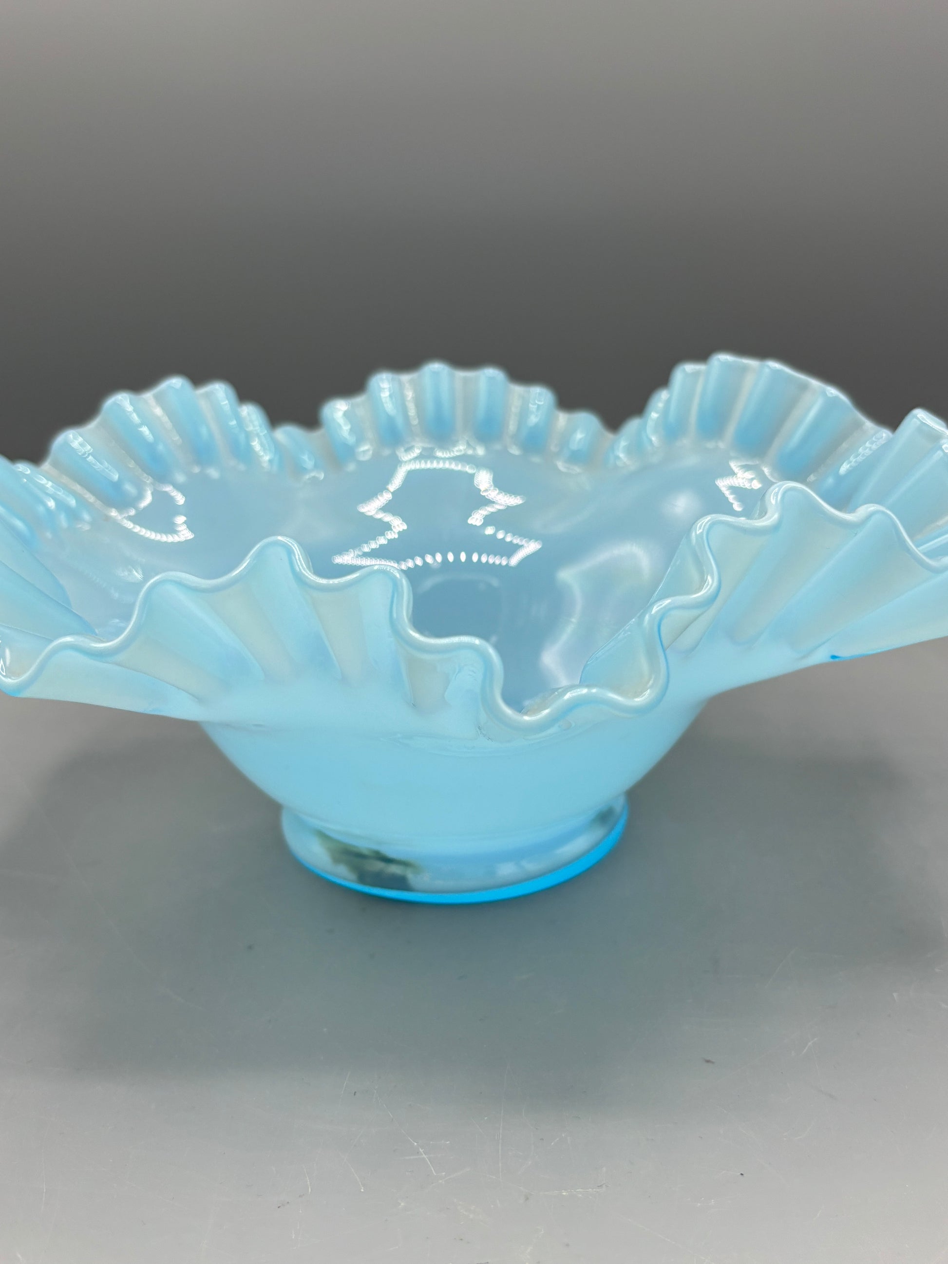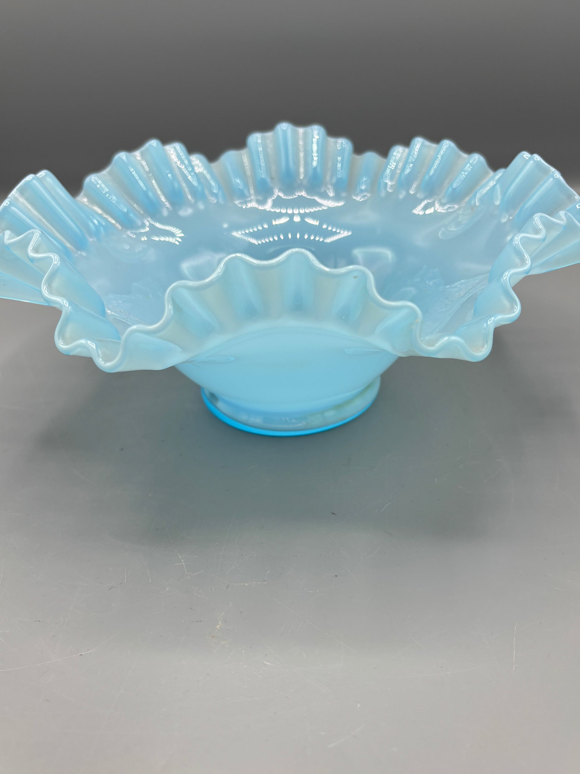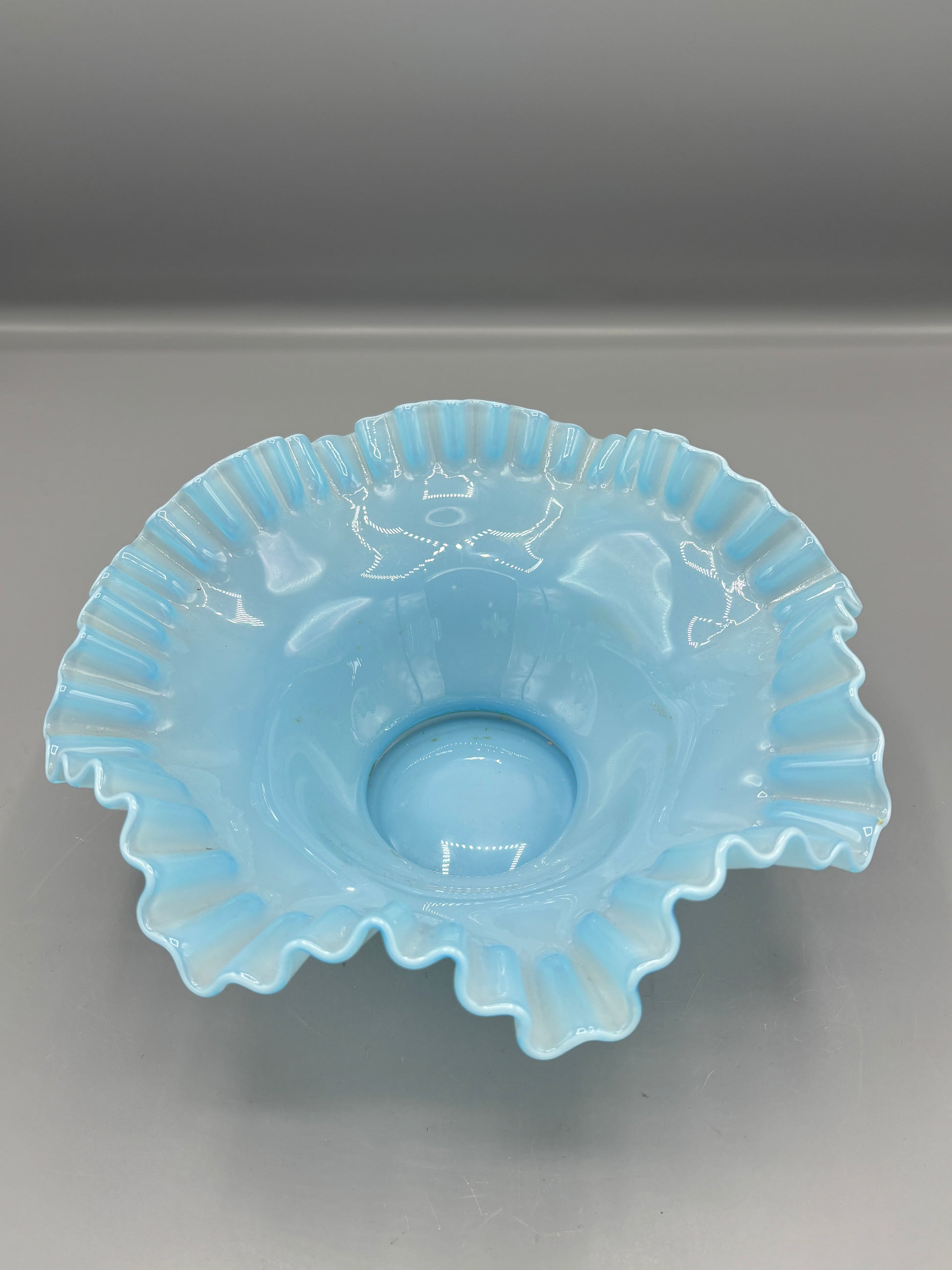 Fenton Double Crimped ruffle console bowl that is a lovely shade of blue. The details on this bowl is captivating. Refer to pictures to admire the beauty.