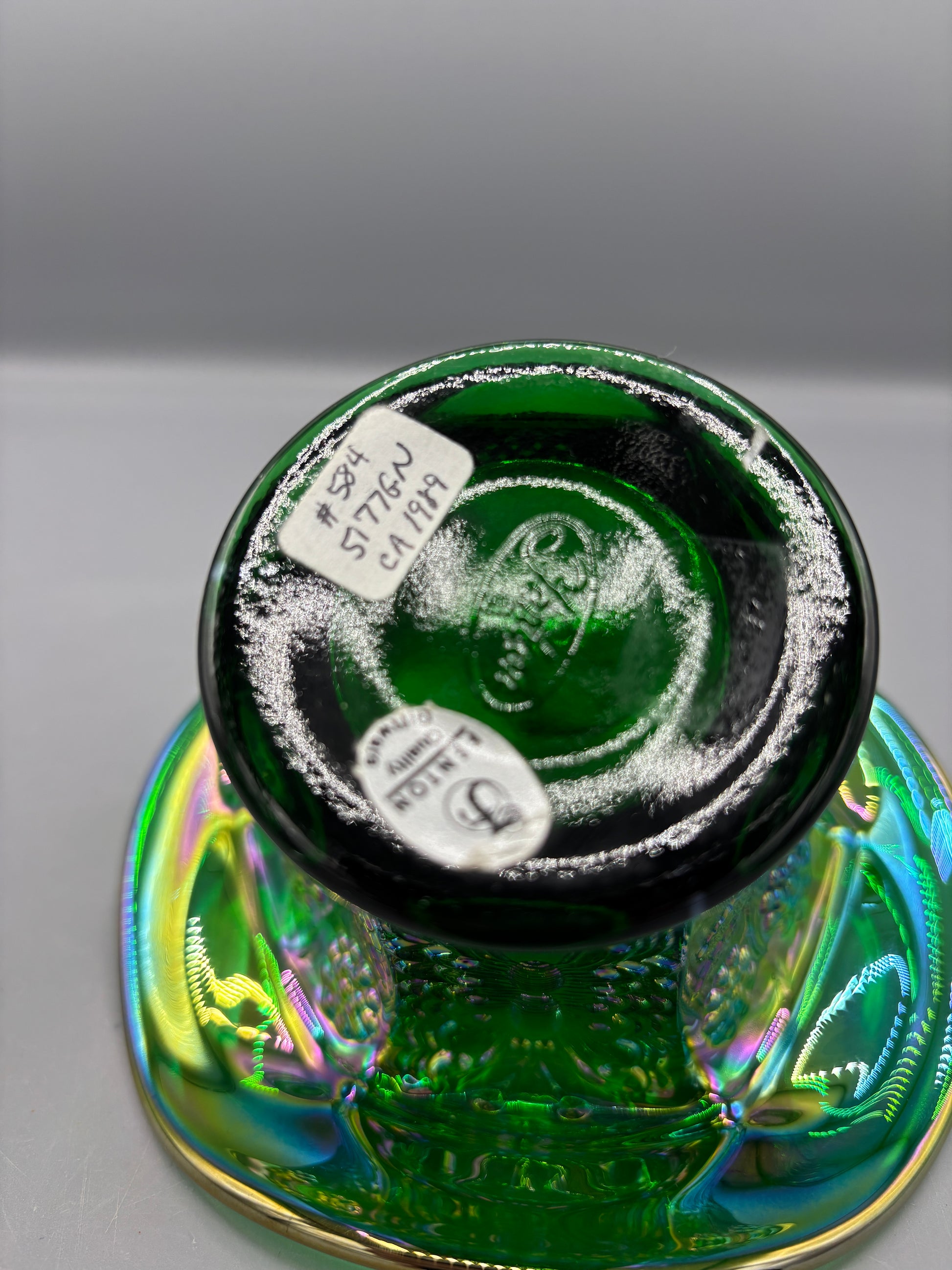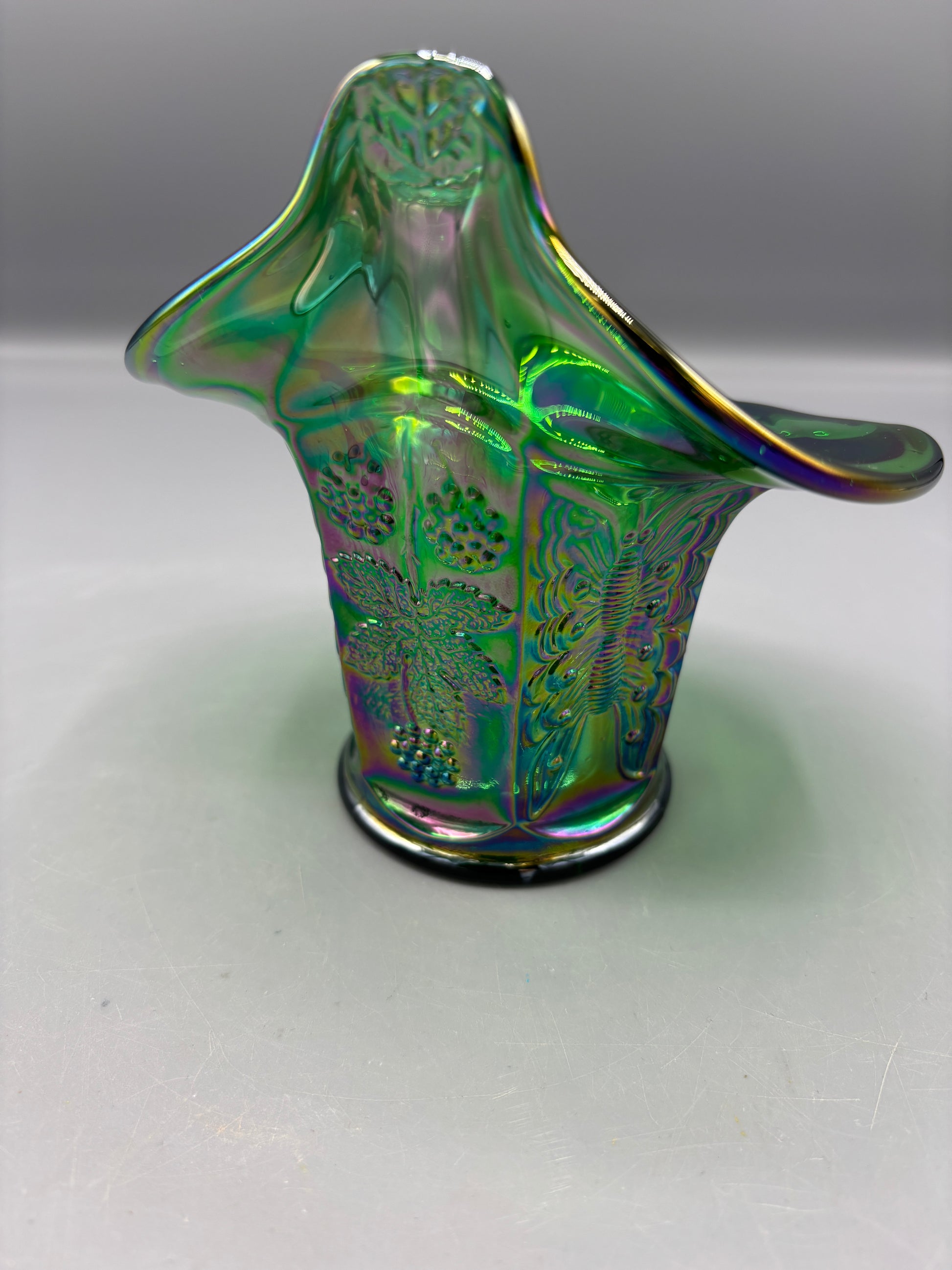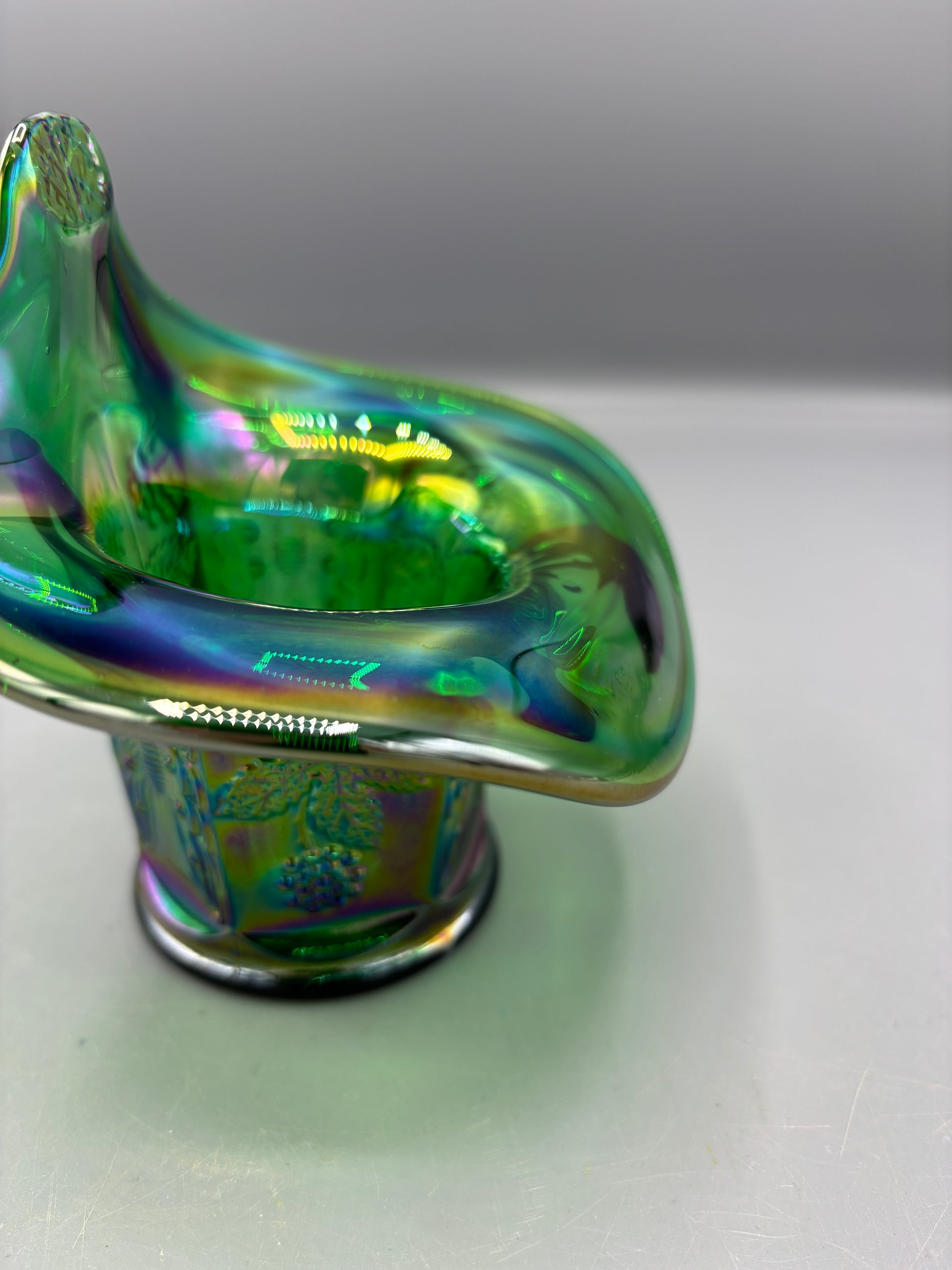 This exquisite Fenton carnival glass bowl showcases the coveted iridescent emerald green finish that defines the golden age of American glassmaking. The ruffled rim creates an elegant silhouette, while the lustrous surface displays the signature rainbow iridescence characteristic of authentic carnival glass. Measuring 4½ inches wide by 5 inches tall, this vintage piece serves as both a functional serving vessel and a striking decorative accent. A testament to Fenton's craftsmanship and the enduring appeal of carnival glass collecting.