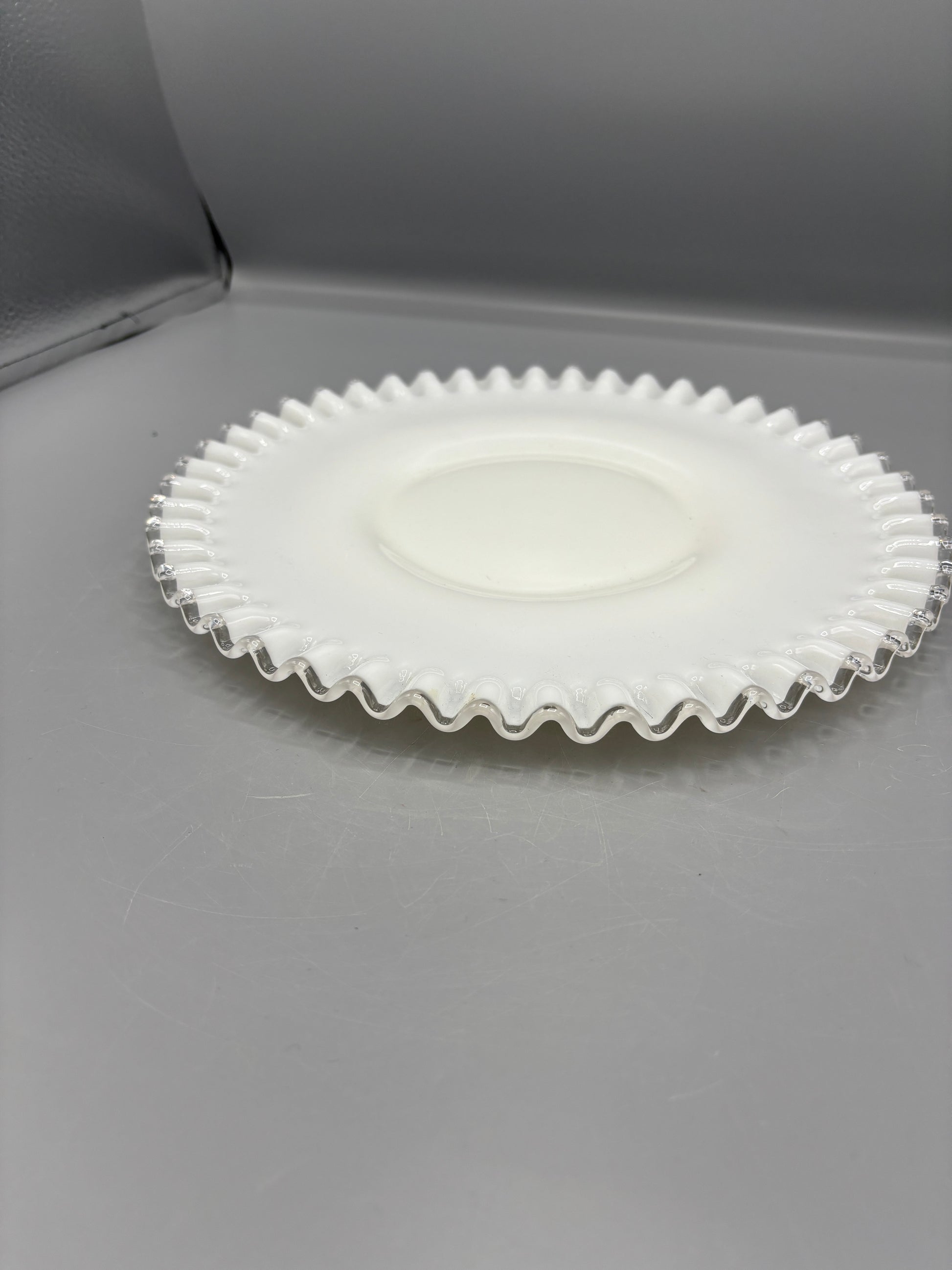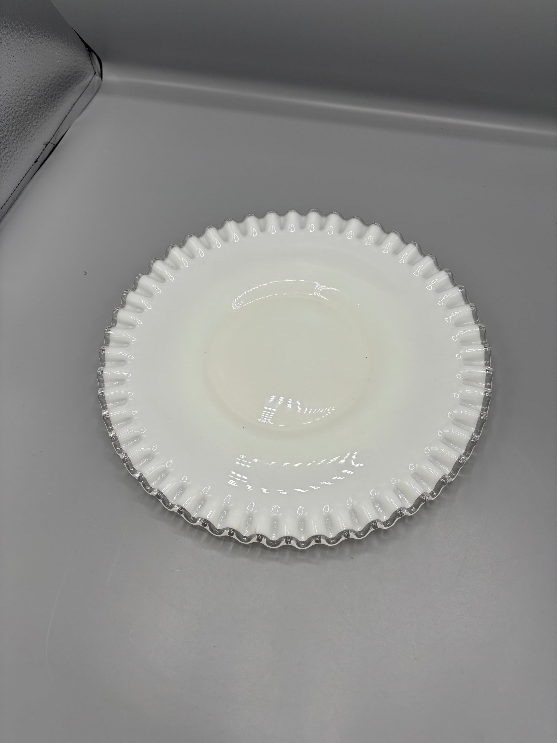This elegant Fenton piece showcases the iconic silver crest design on classic milk glass, a hallmark of mid-century American glassware craftsmanship. The 10.5-inch diameter makes it ideal for display or serving, offering both aesthetic appeal and functional versatility. A timeless collectible that exemplifies Fenton's renowned quality and distinctive style.