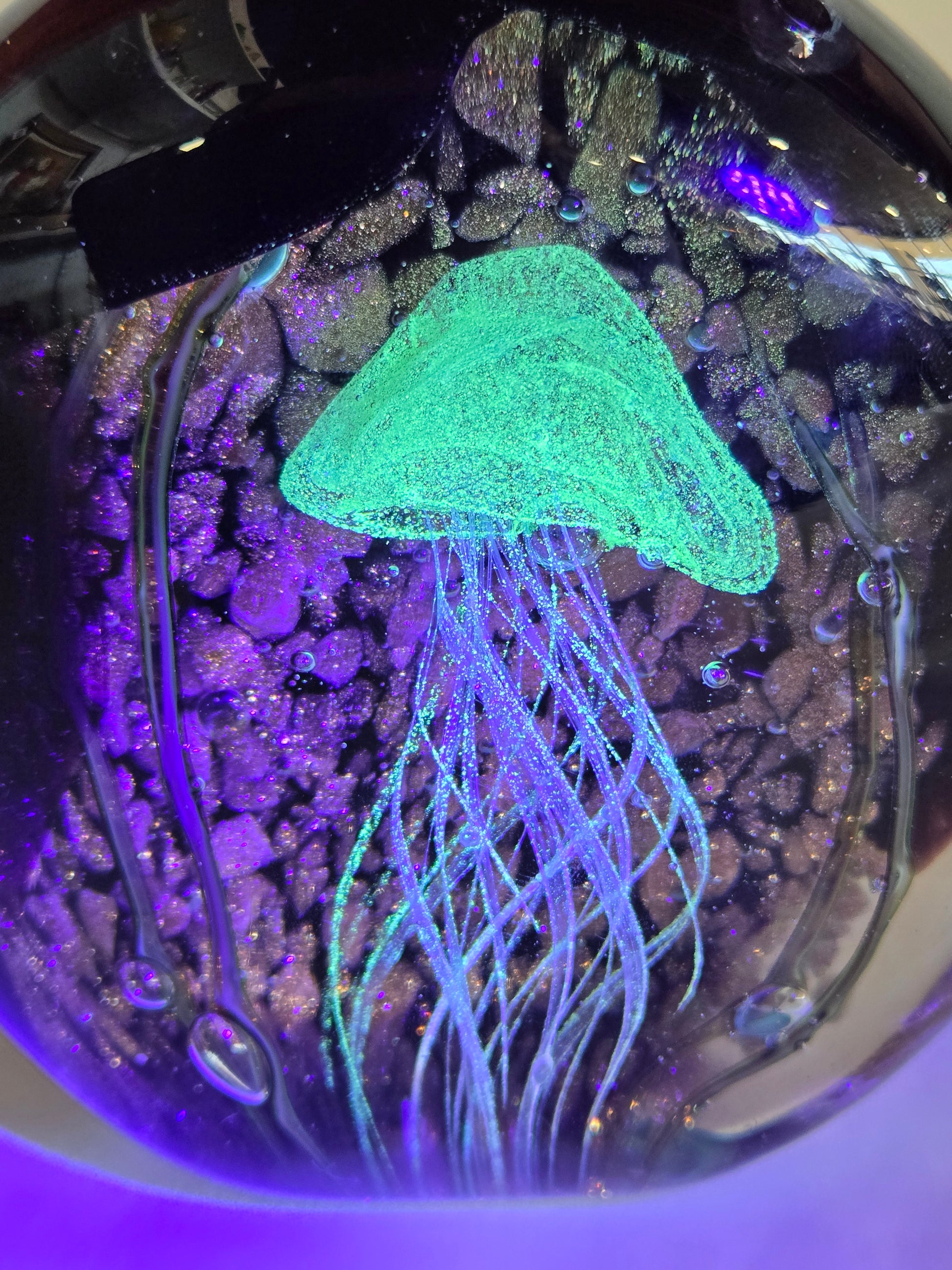 This glass paperweight showcases a stunning encased jellyfish design that glows vibrantly under blacklight, enhancing its artistic allure. Featuring a unique interior crack, it offers a distinct character without compromising its captivating visual effect. Perfect for collectors and enthusiasts, this piece combines expert craftsmanship with an eye-catching luminescent feature.
