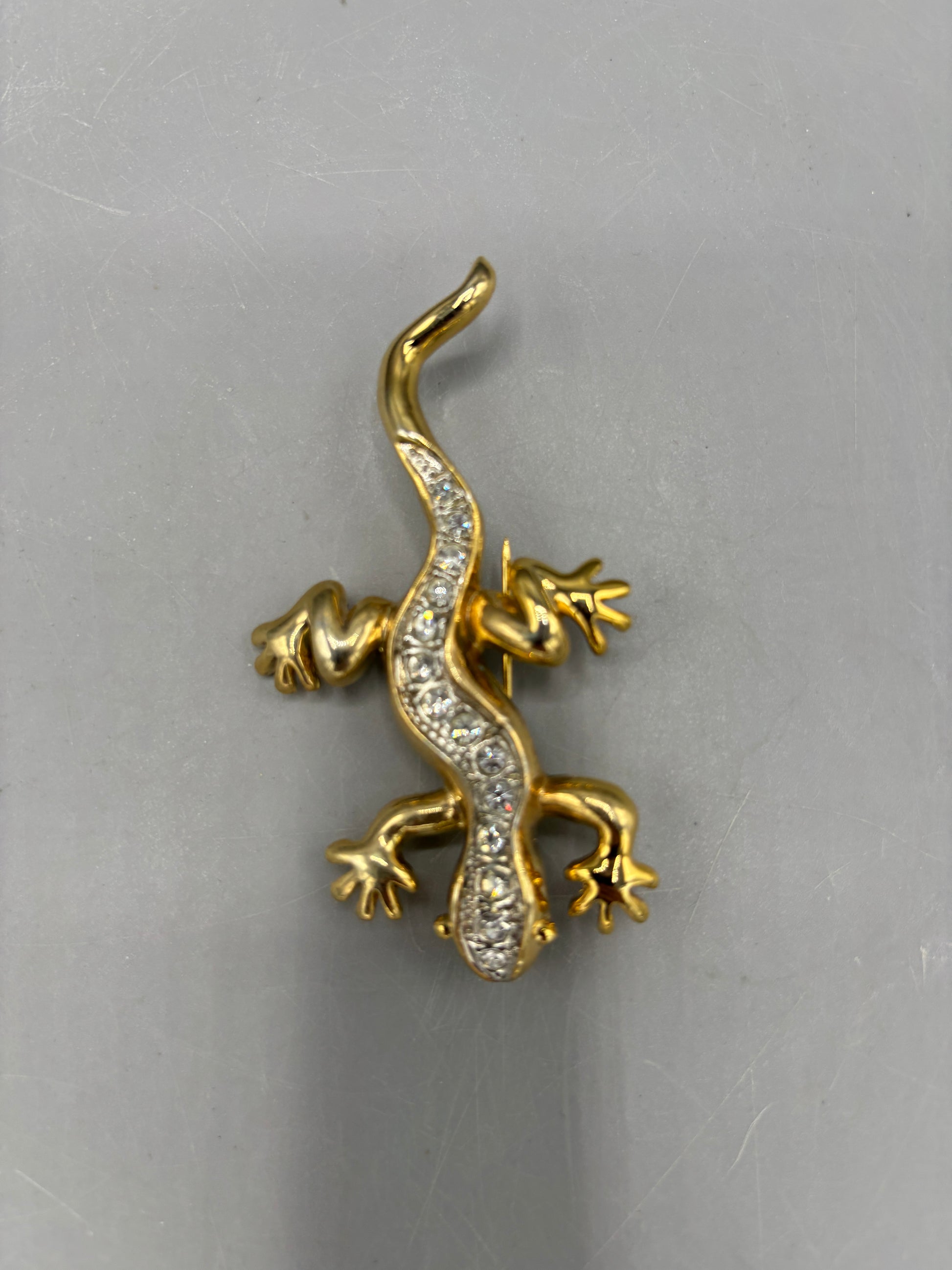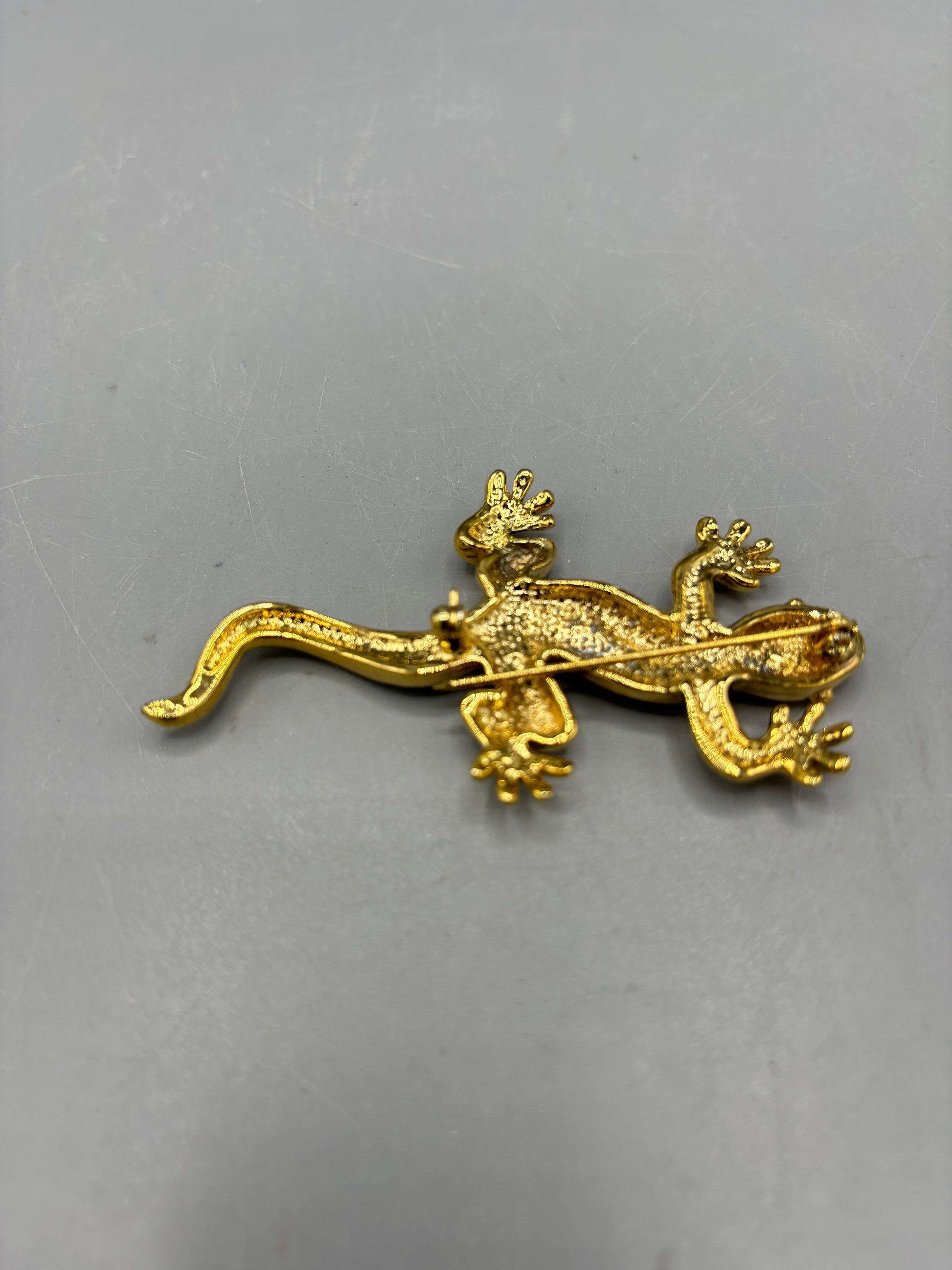 Gold tone rhinestone Gecko lizard brooch that is so interesting and a statement piece for any event. This has no damages.