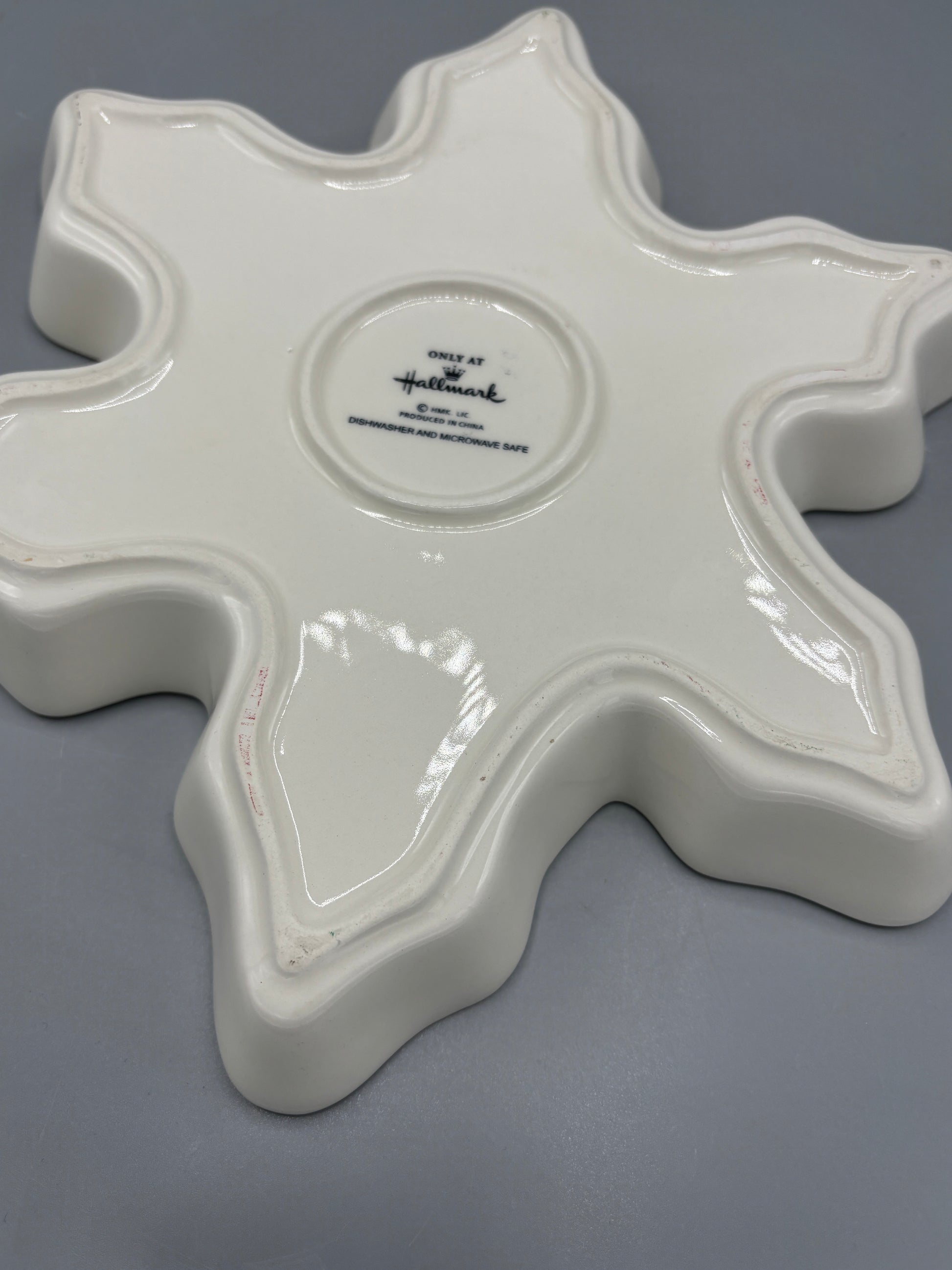 Hall red Snowflake dish that would look so cute to hold appetizer's for any gathering. The snowflake dish is large and shows no damages. This would be great for trinkets, candy, rolls and so much more!