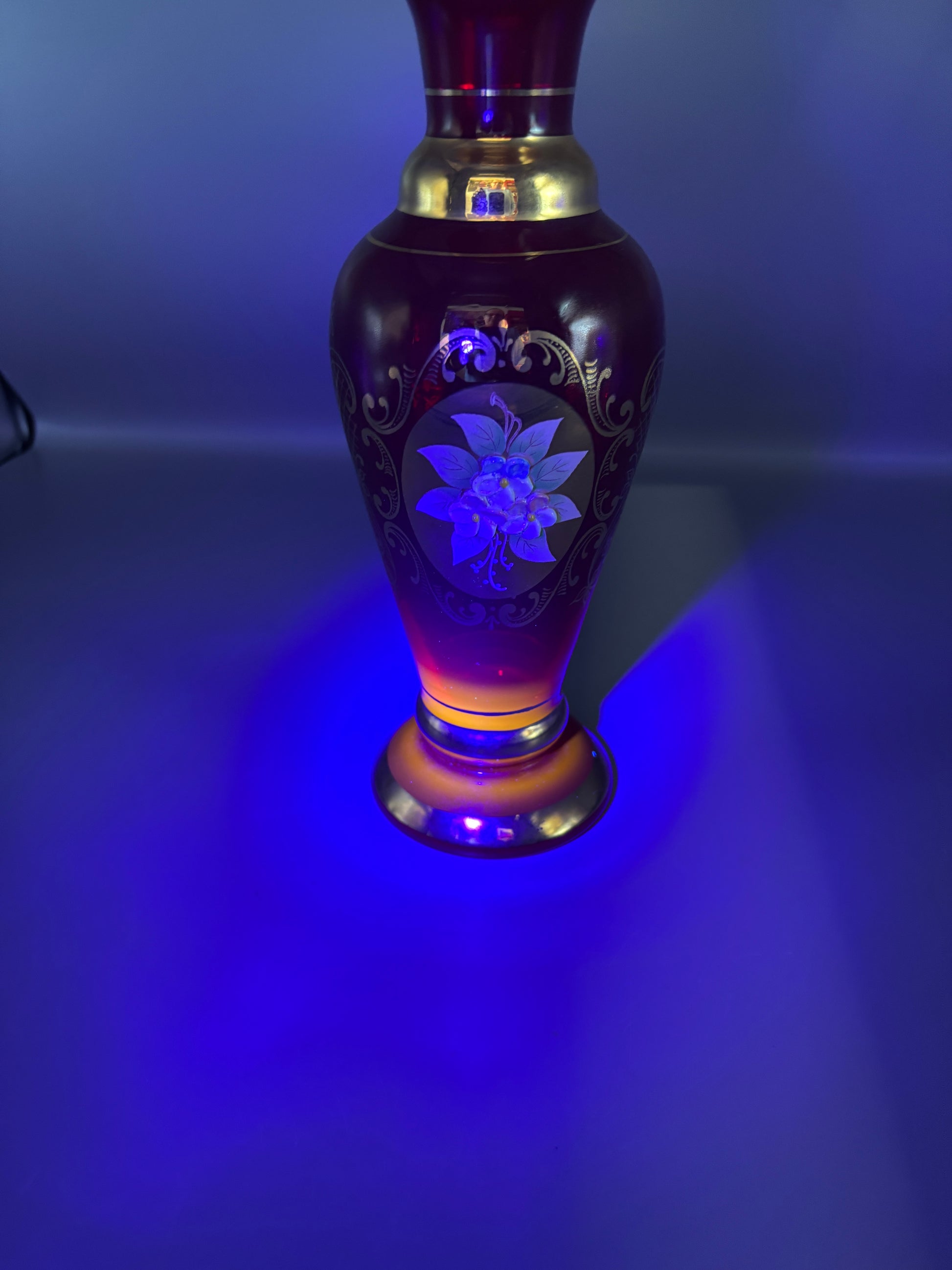 This stunning ruby red vase with applied flowers and gold accents would look stunning with a small bouquet! The bottom portion glows orange under a black light.
