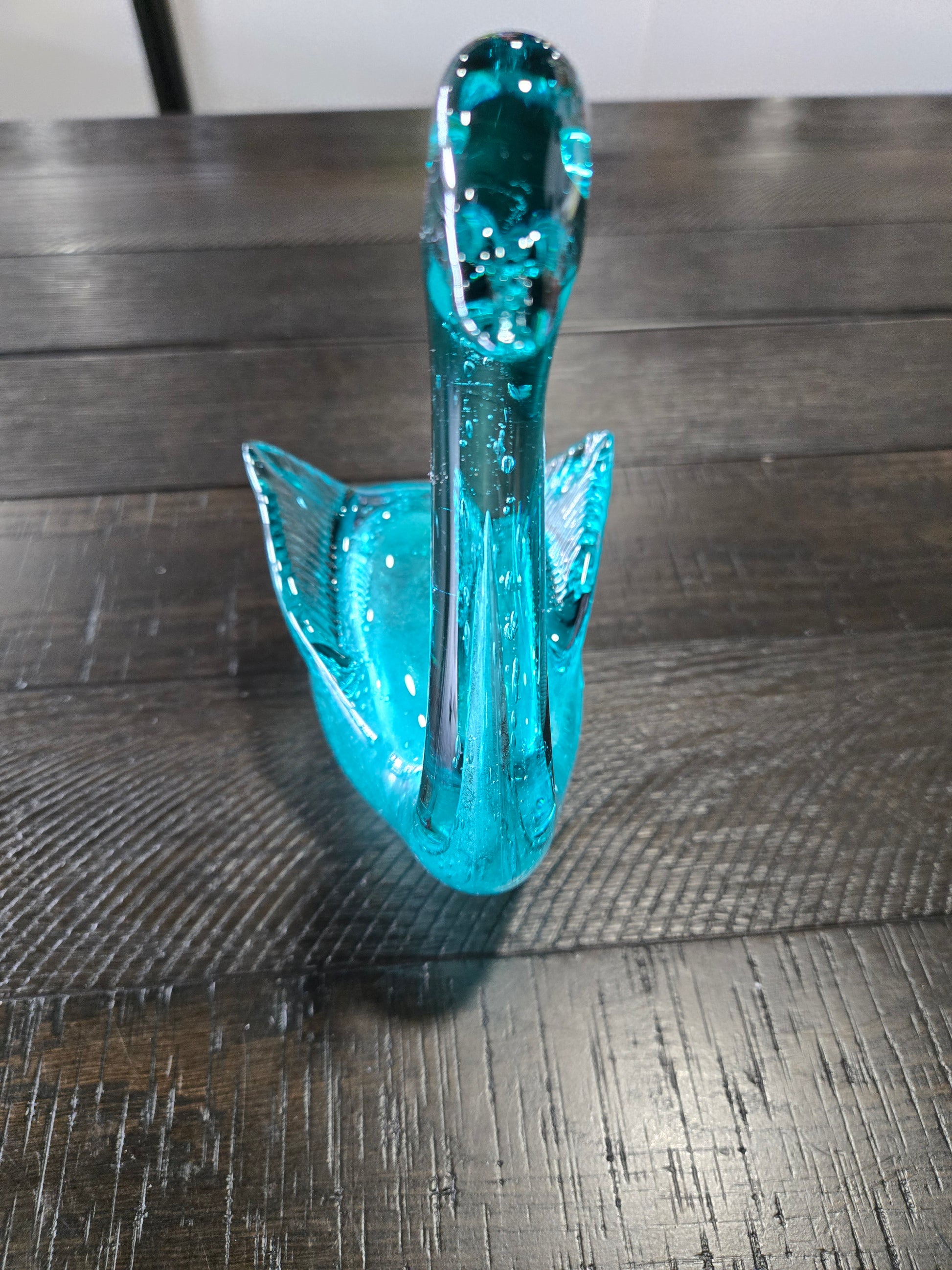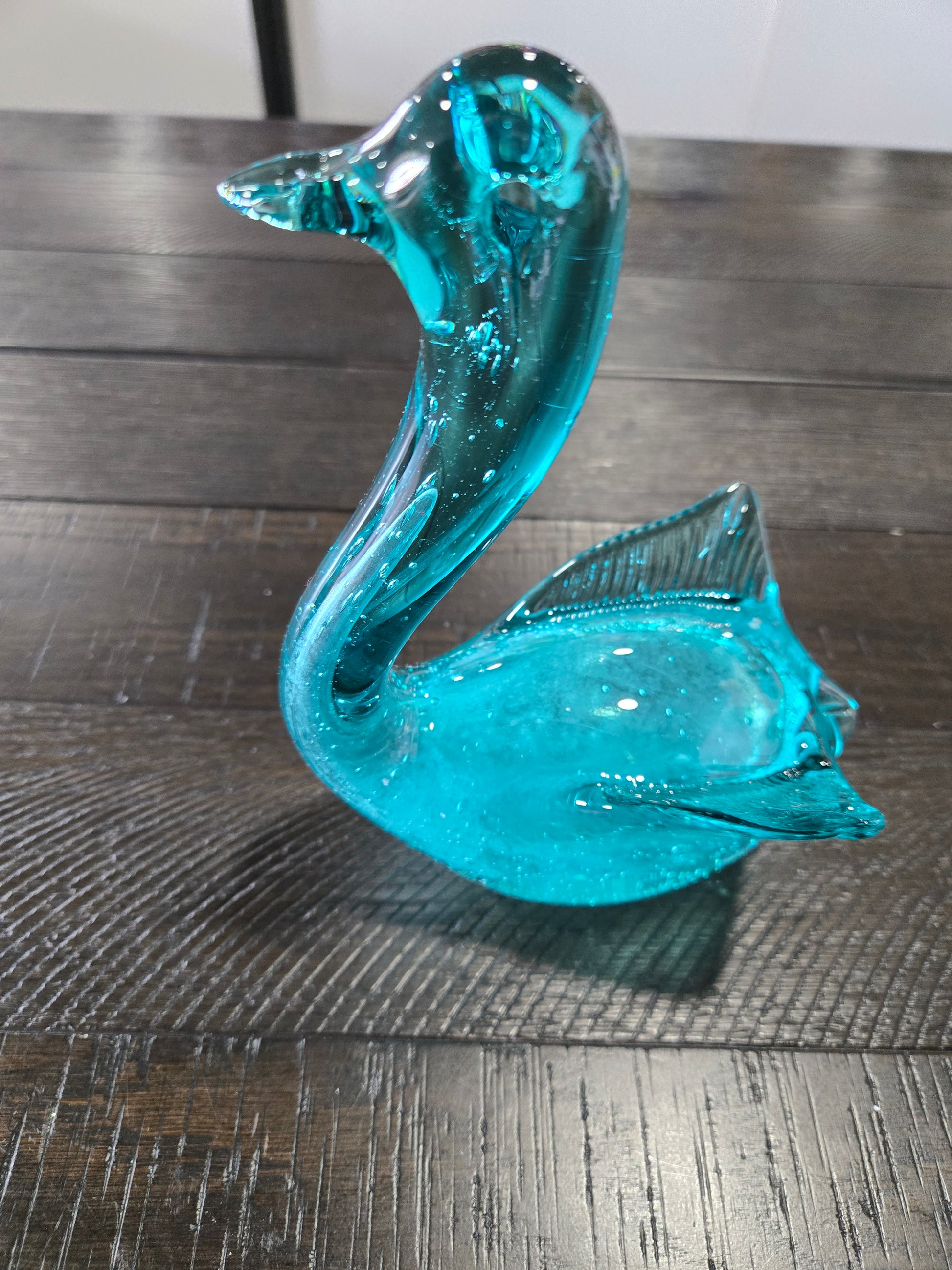 Crafted with meticulous attention to detail, this mid-century teal swan showcases exceptional glasswork through its deliberate bubble inclusions, creating visual depth and authentic character. The piece measures 8½" x 6" and remains in pristine condition with no damage. When light passes through the translucent glass, the interplay of color and texture reveals the artisan's skilled technique, making it a distinguished addition to any collection of vintage decorative glass.