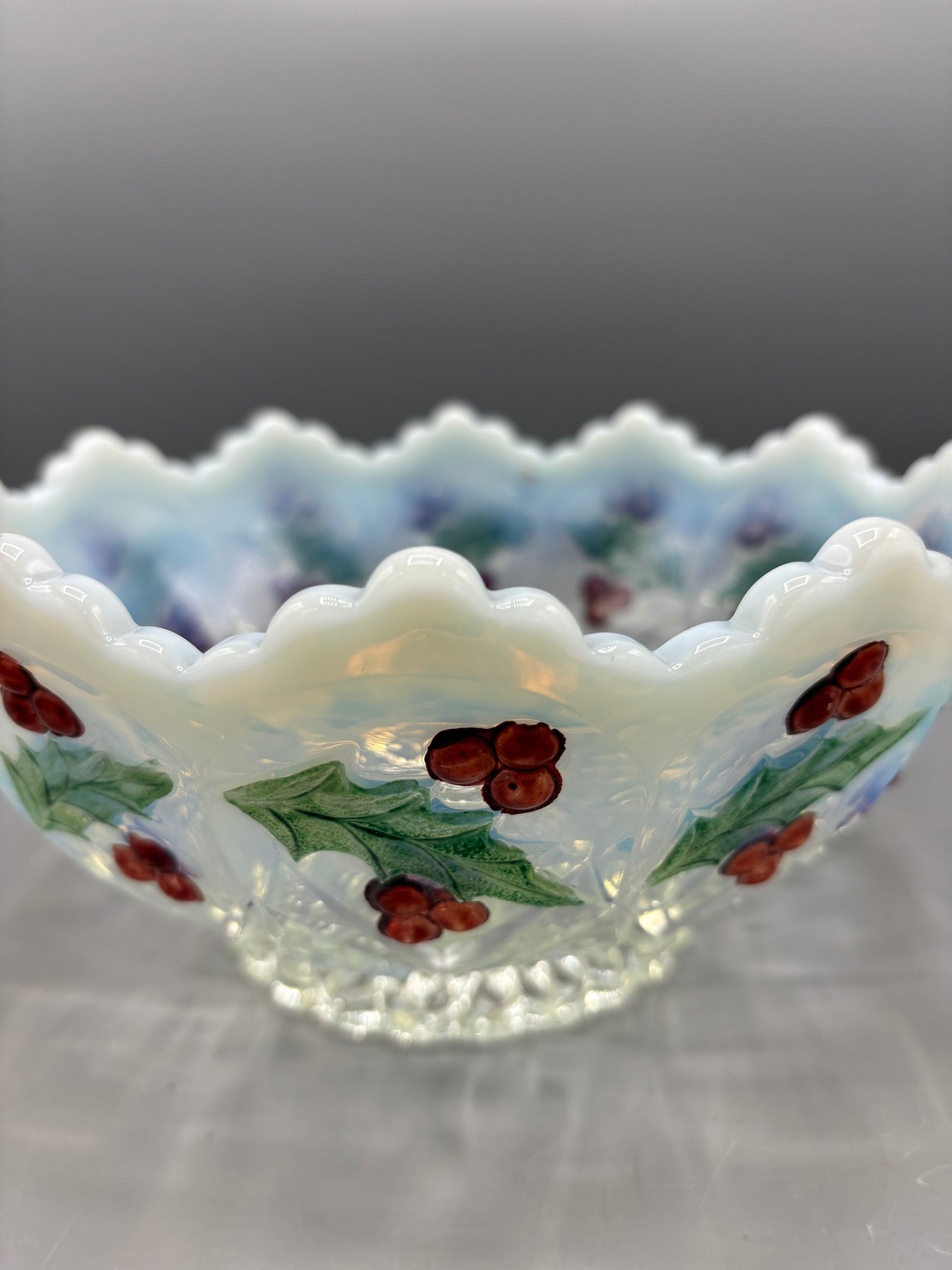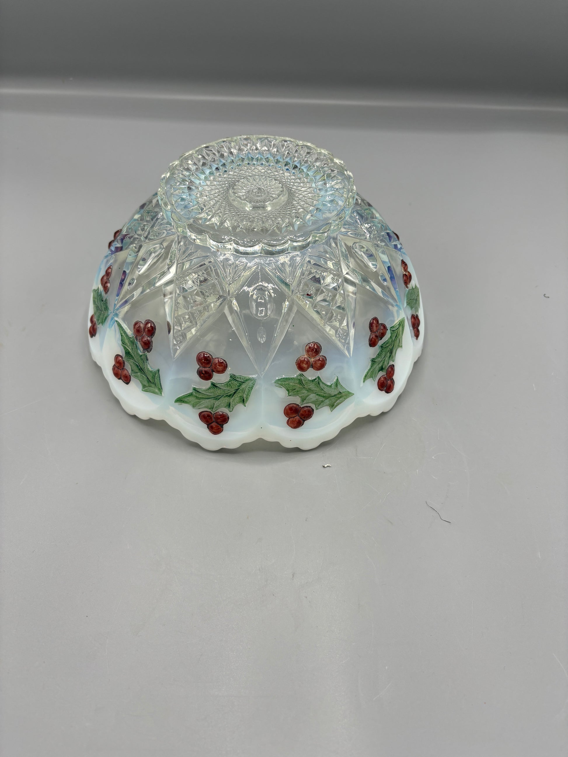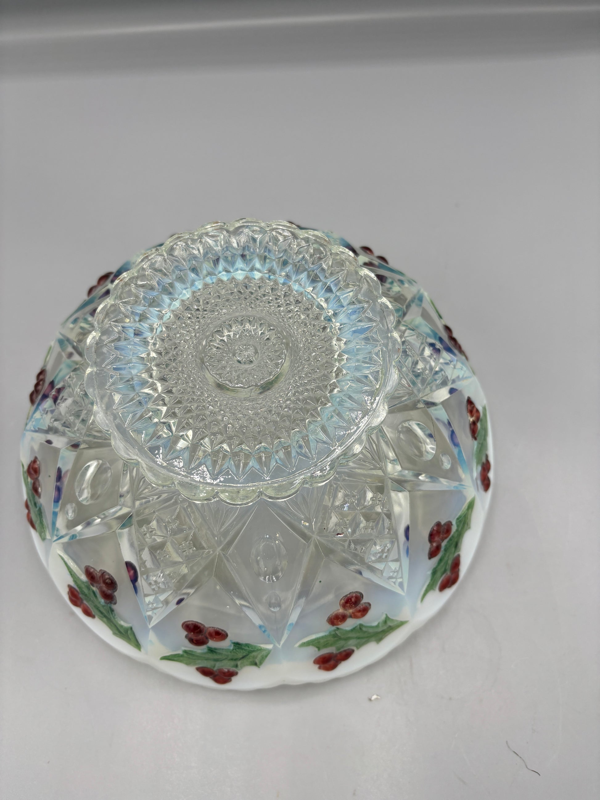 Milk glass to clear bowl with a Holly & Berry design that would make a memorable holiday at any gathering. This has no damages and the colors are stunning.