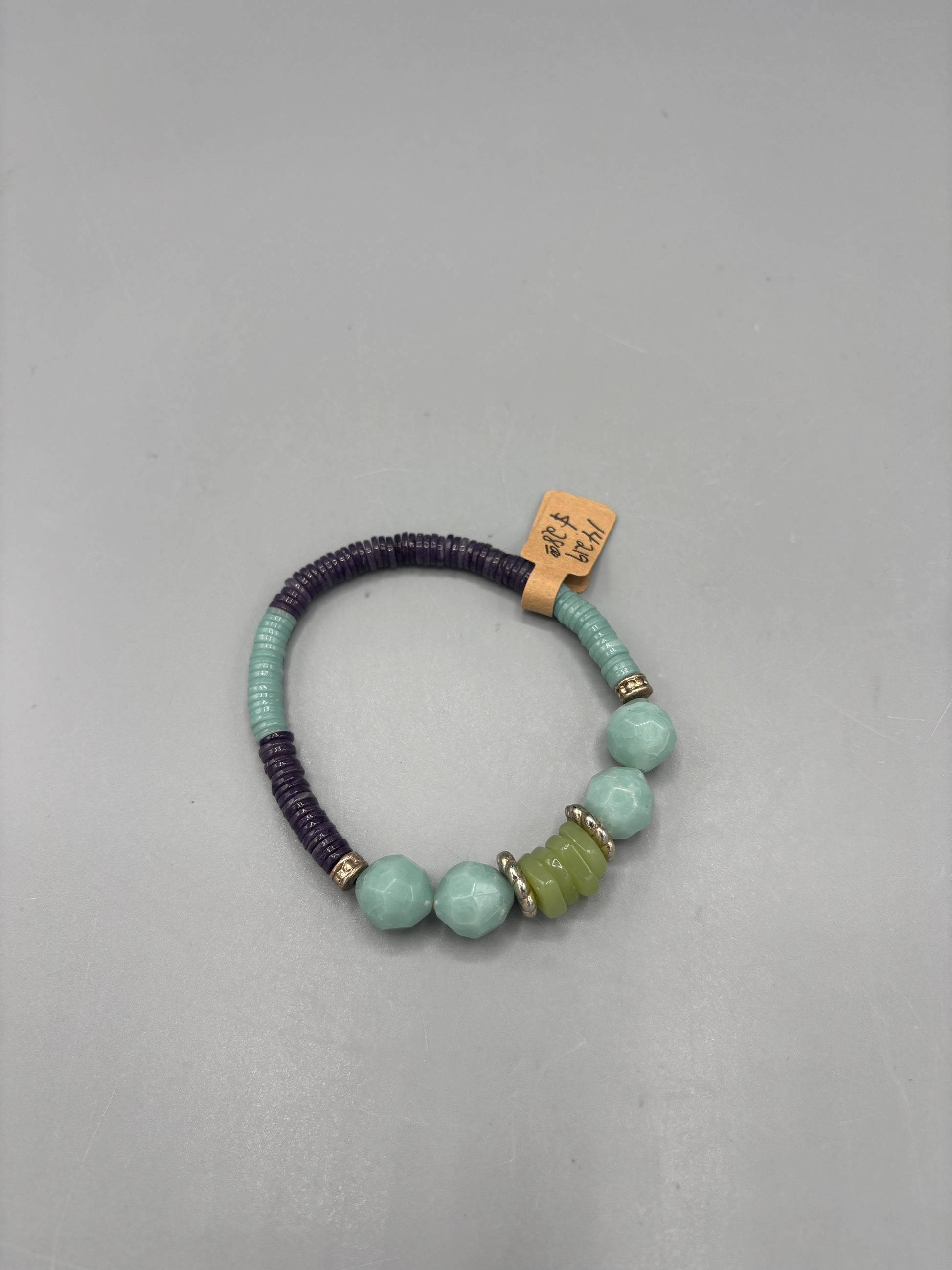 Purple & Turquoise stretch bracelet that has many sizes of beads. The purples, turquoise, green is a wonderful combination.