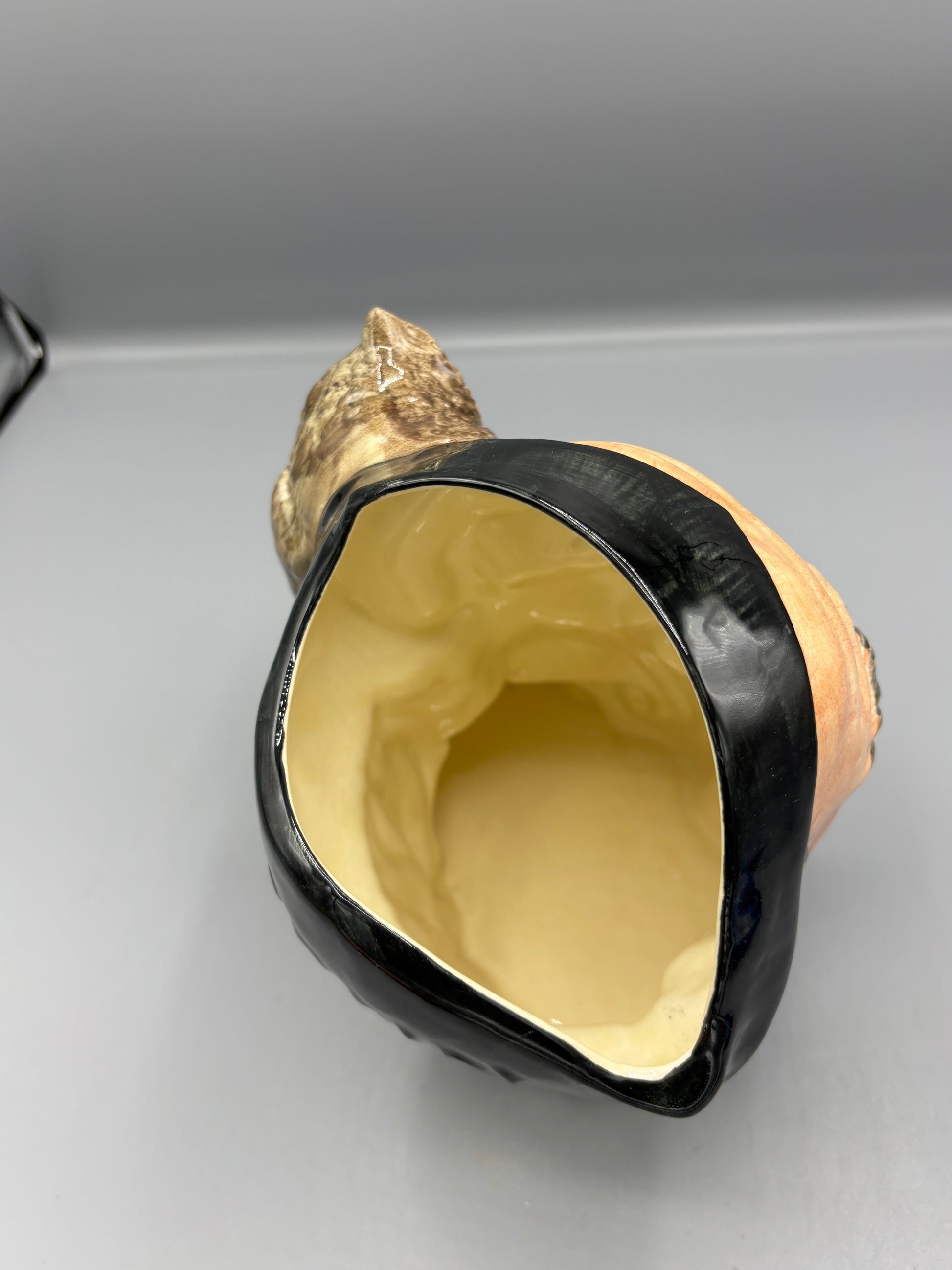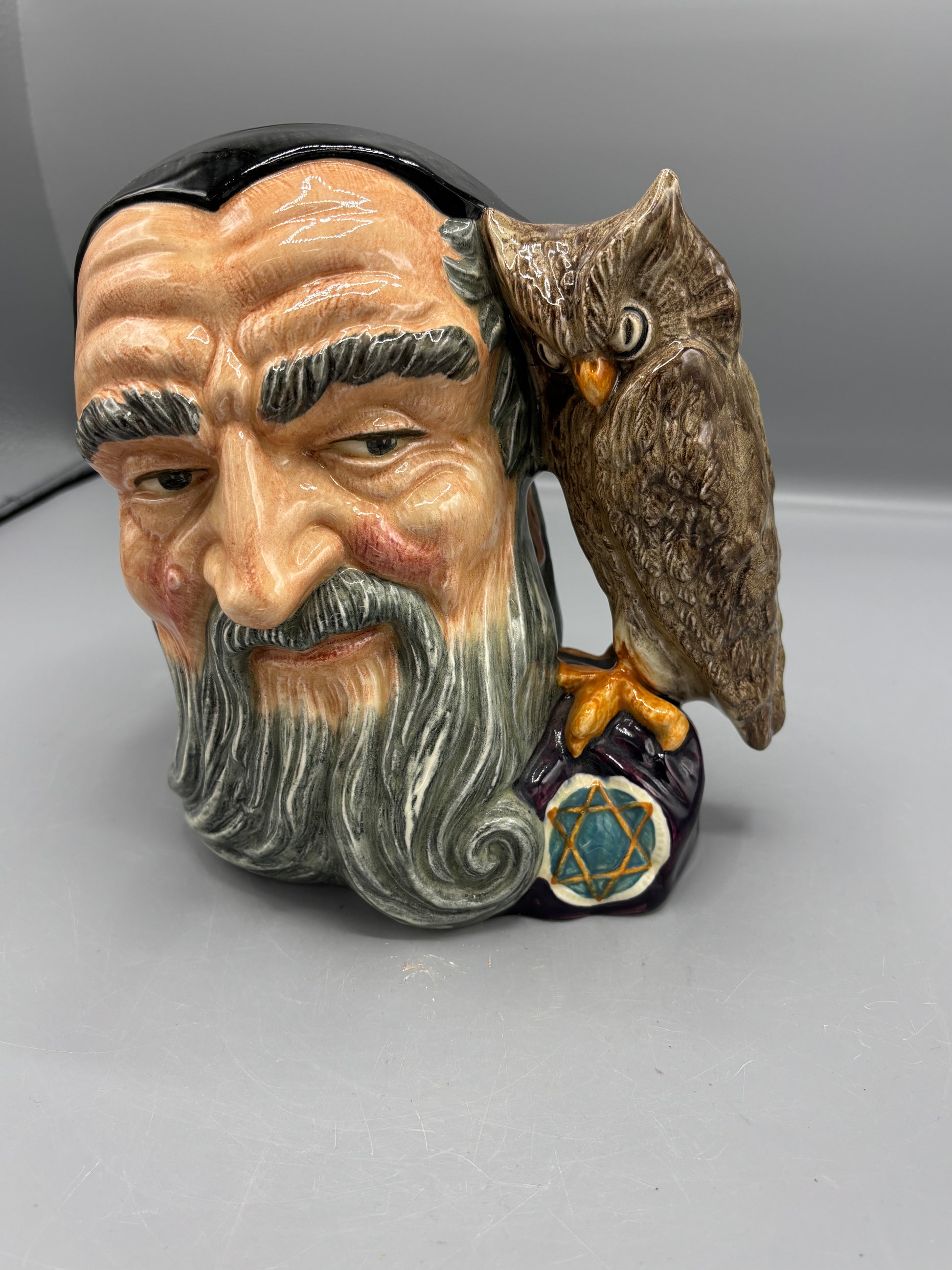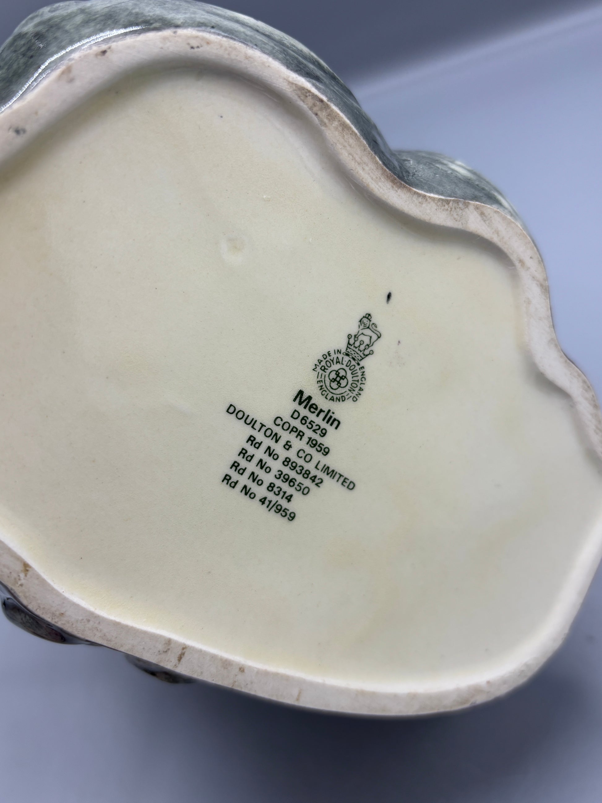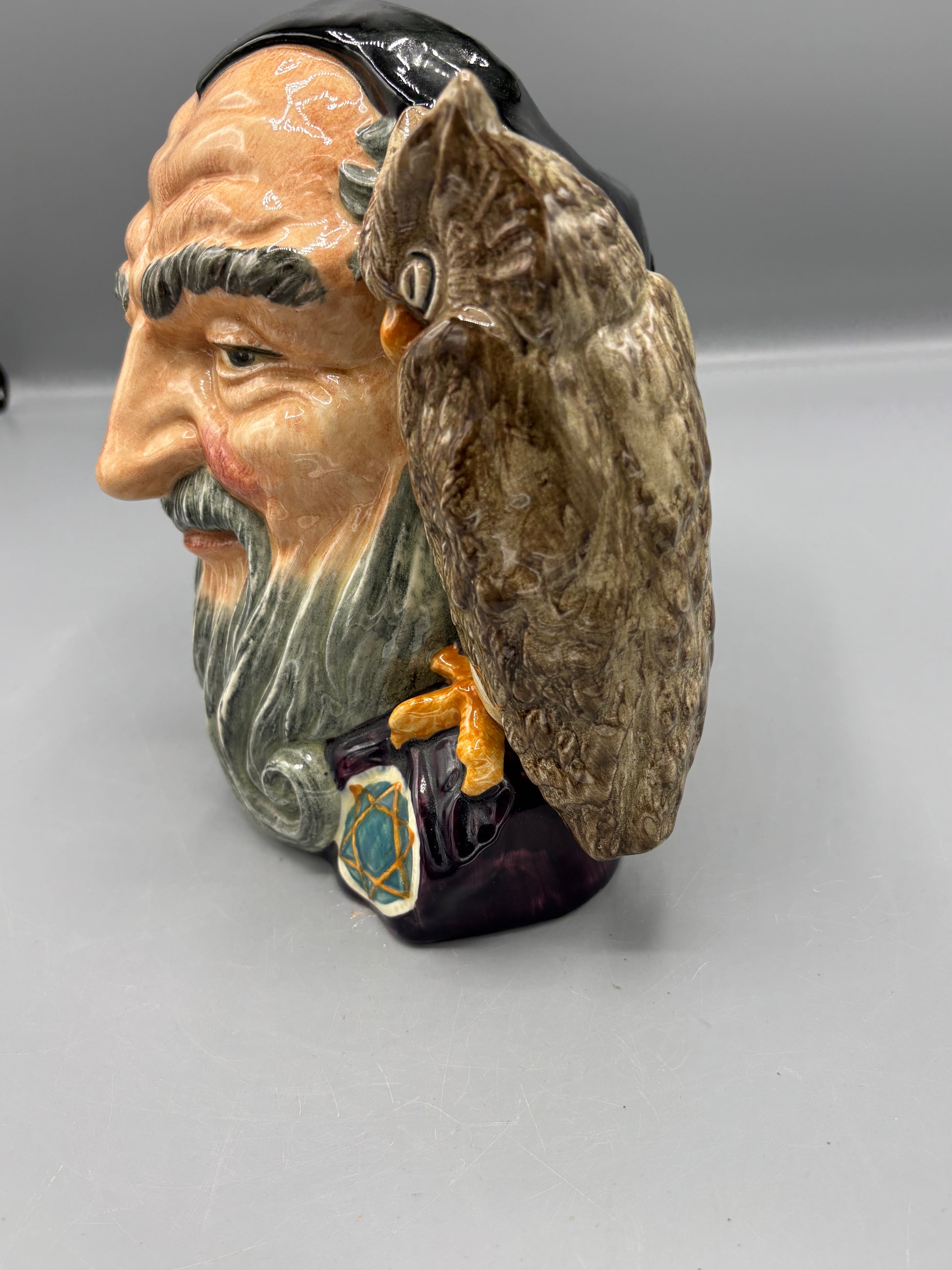 This distinctive Royal Doulton character jug features a whimsical owl-adorned Merlin design, capturing the charm of classic Toby mug craftsmanship. Standing at 8 inches tall with a 7¼-inch width, it combines functional capacity with collectible appeal. The detailed glazework and period-appropriate styling reflect Royal Doulton's renowned pottery expertise, making it an ideal addition for enthusiasts of vintage ceramics and literary-inspired tableware.