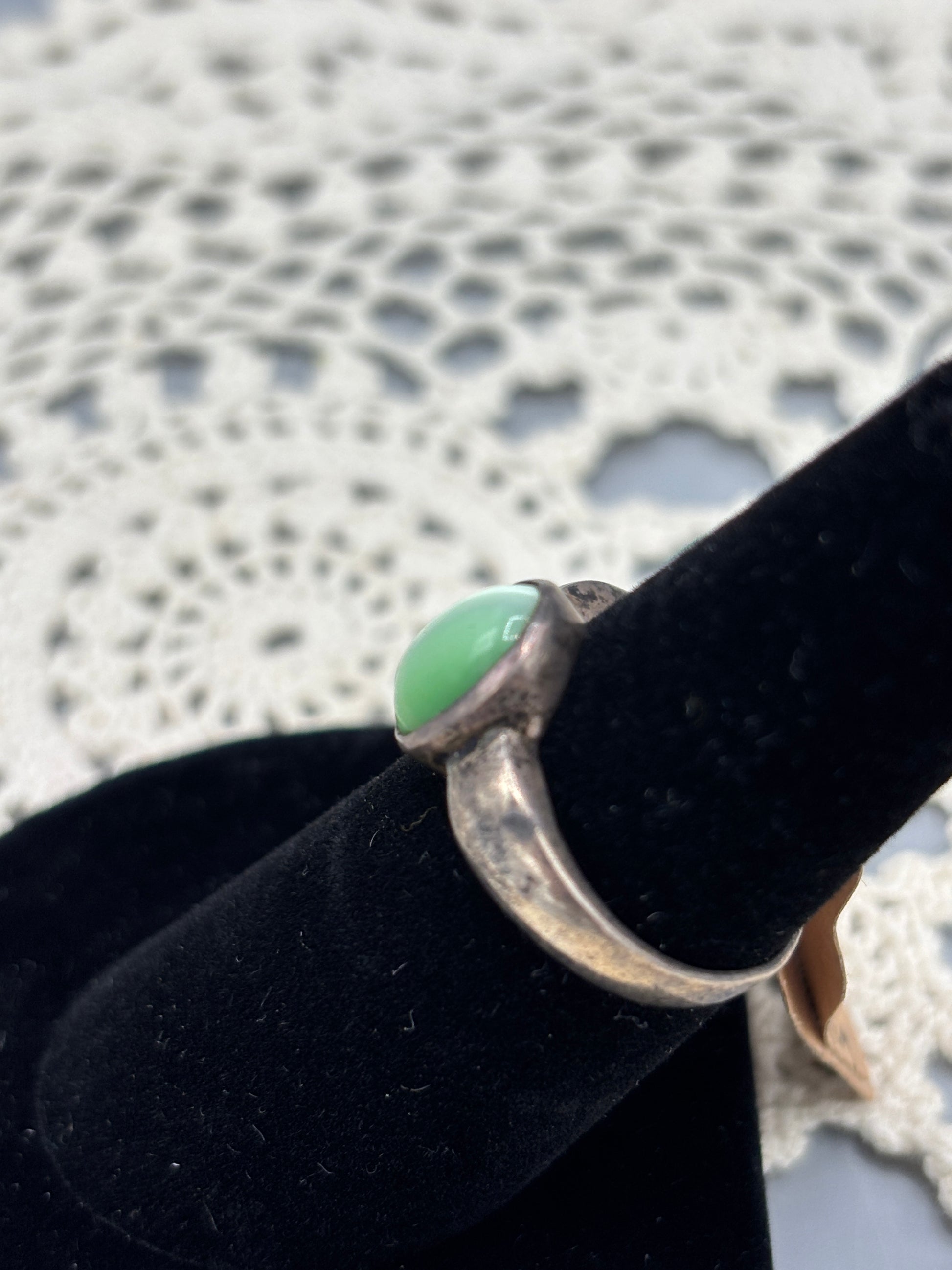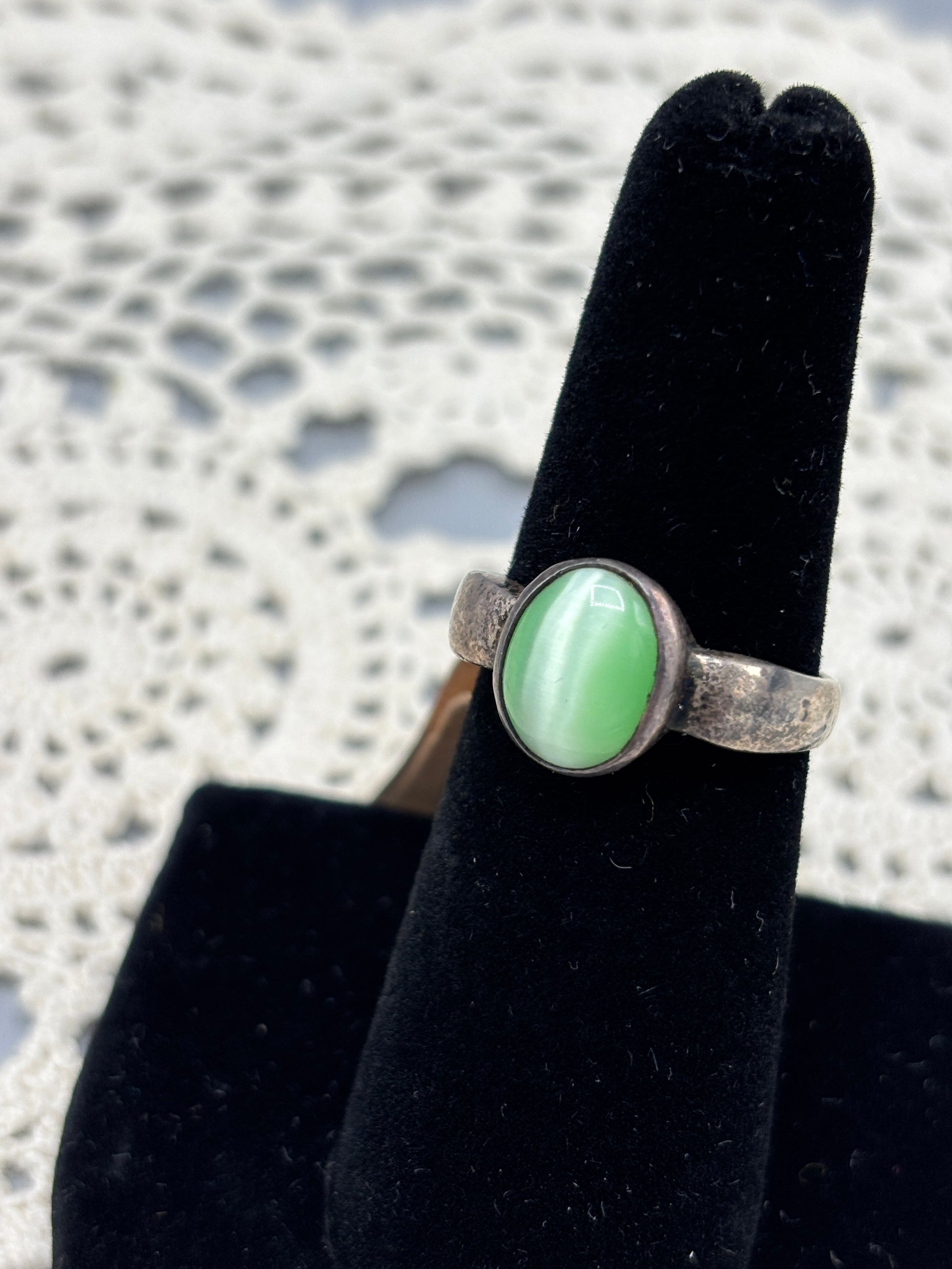Sterling green cat eye ring that has a stunning shade of green. The ring shows signs of wear, refer to pictures for details.