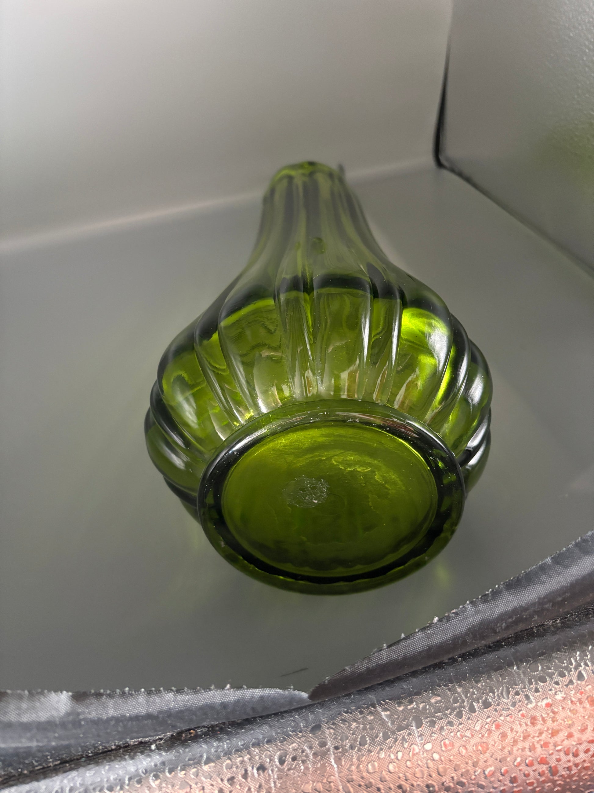 This beautiful swung vase is a must have for the collectors out there! The vase is a lovely green, not quite as bright as lime green, but close. It is ribbed vertically. There are no chips or cracks!
