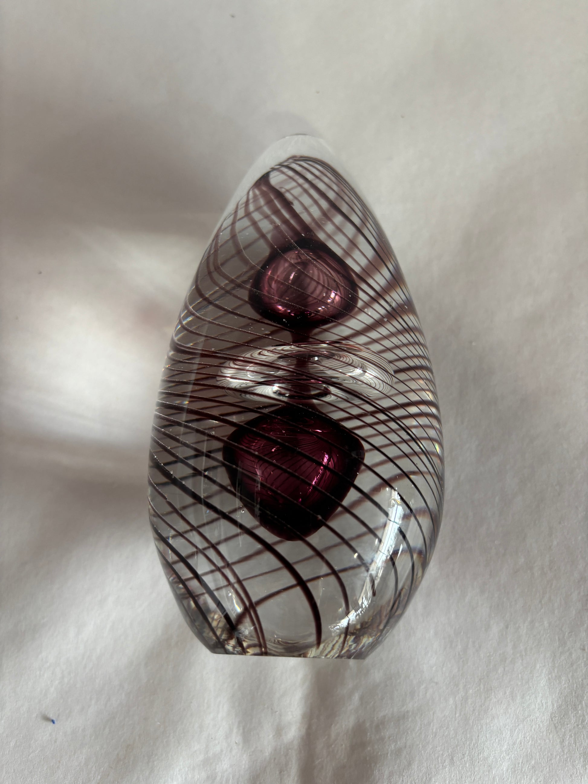 Vintage Art glass Egg paperweight that has a spiral purple color that is unbelievable. This has no damages and is 6 1/2 x 3