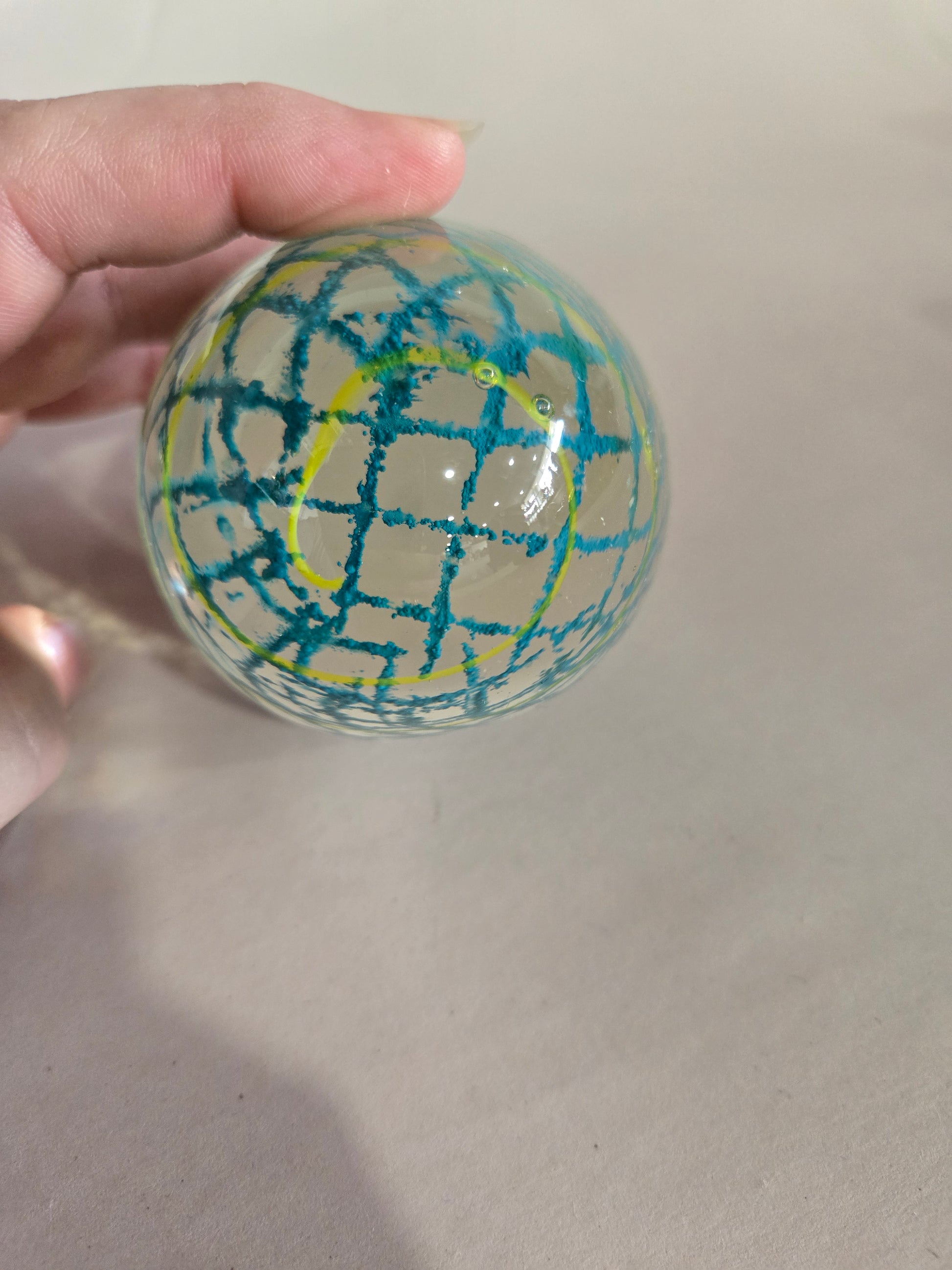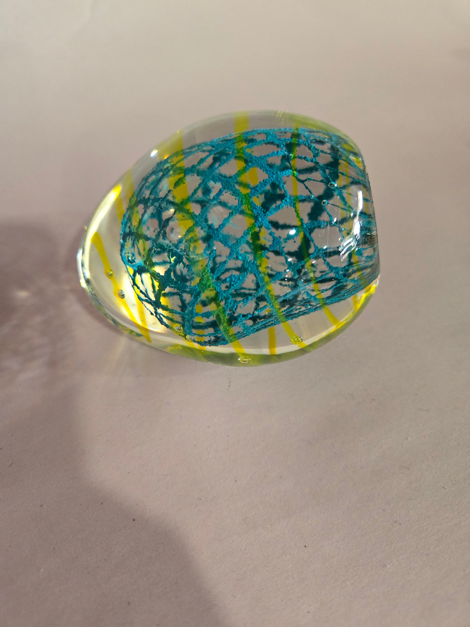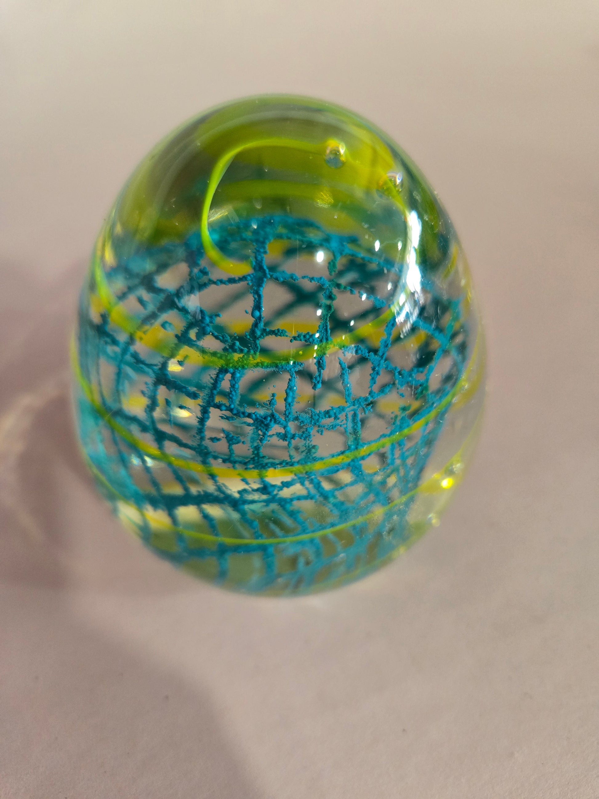 Vintage Art Glass Yellow Swirl Teal Lattice Egg Shaped Paperweight