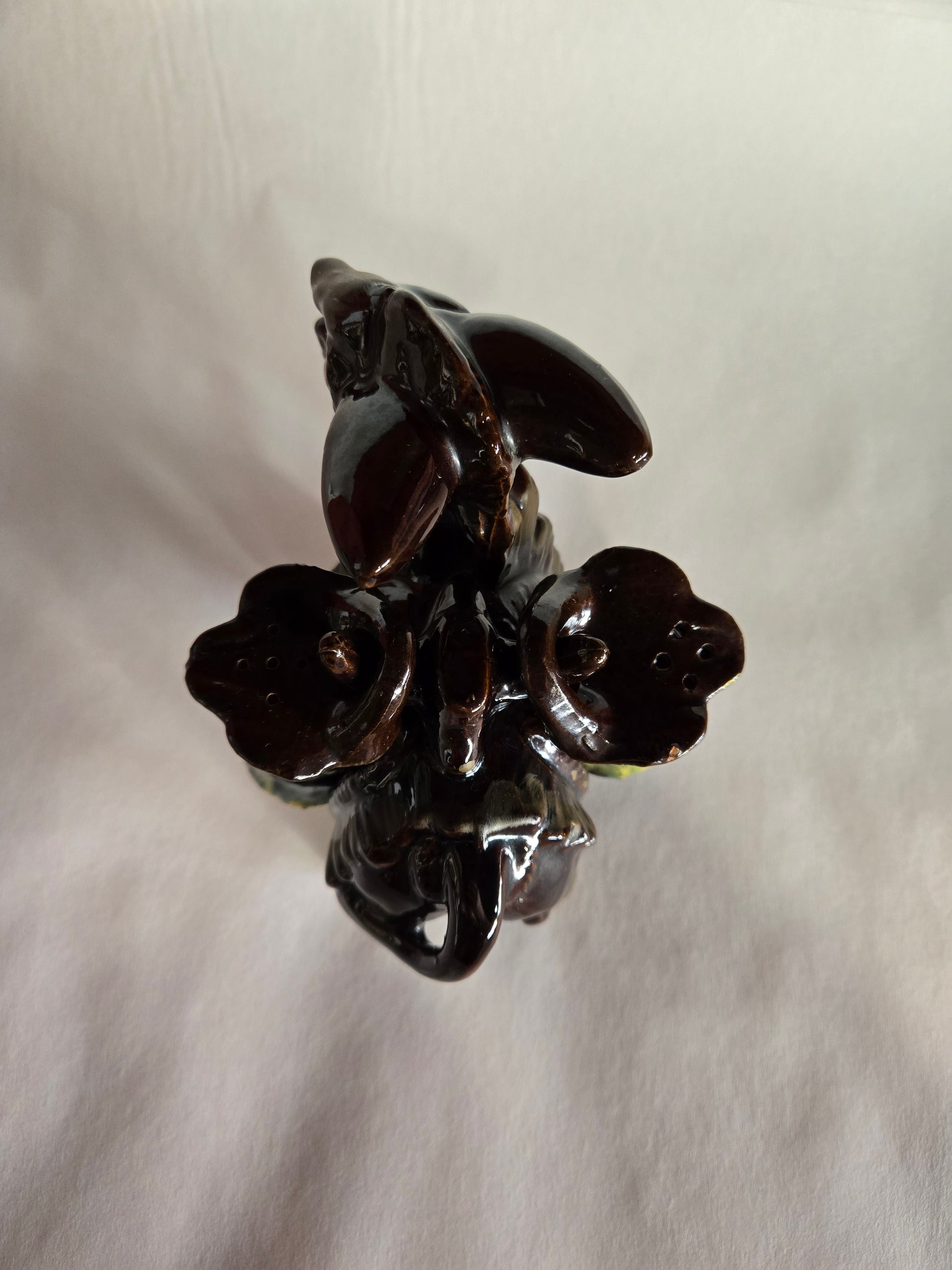 A charming vintage ceramic piece showcasing a donkey figurine with removable barrel-shaped shakers suspended from its saddle. This three-piece set combines functional tableware with decorative appeal, featuring a substantial 6" x 6" donkey base and two 3½" x 2" barrel dispensers. One barrel requires a replacement cork. An ideal accent for collectors of vintage kitchenware or those seeking distinctive seasoning vessels with character and nostalgic charm.