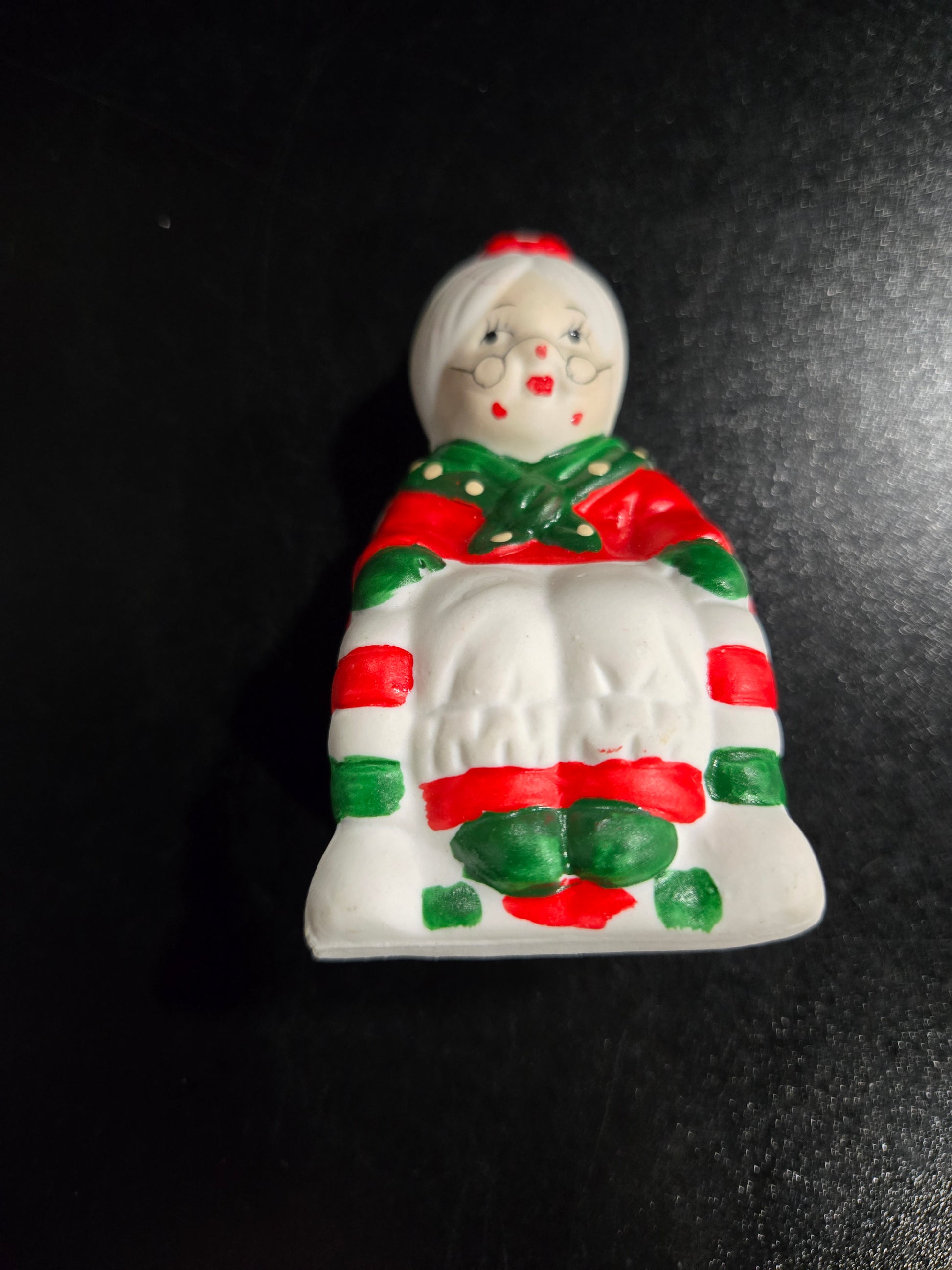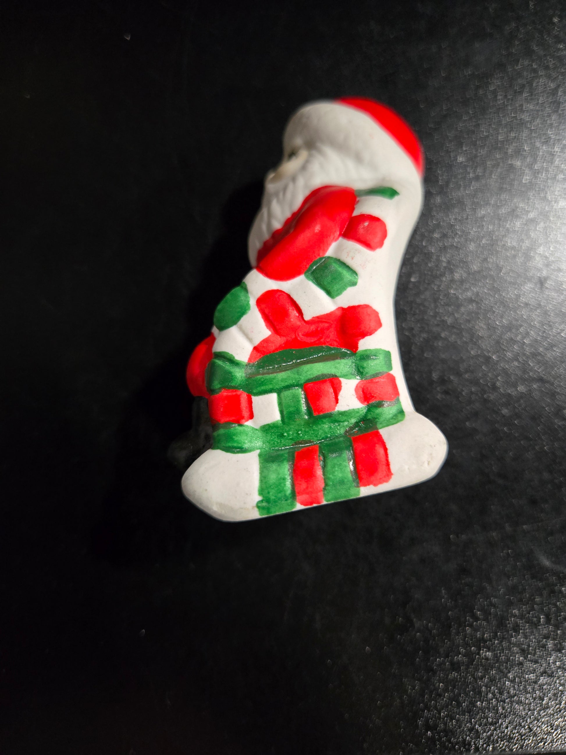 This charming vintage ceramic salt and pepper set features beloved Mr. and Mrs. Claus figurines, each standing 3½ inches tall. Perfect for holiday entertaining or as a nostalgic collectible, this whimsical duo brings festive character to any kitchen or dining table. An ideal gift for Christmas enthusiasts and vintage décor lovers alike.