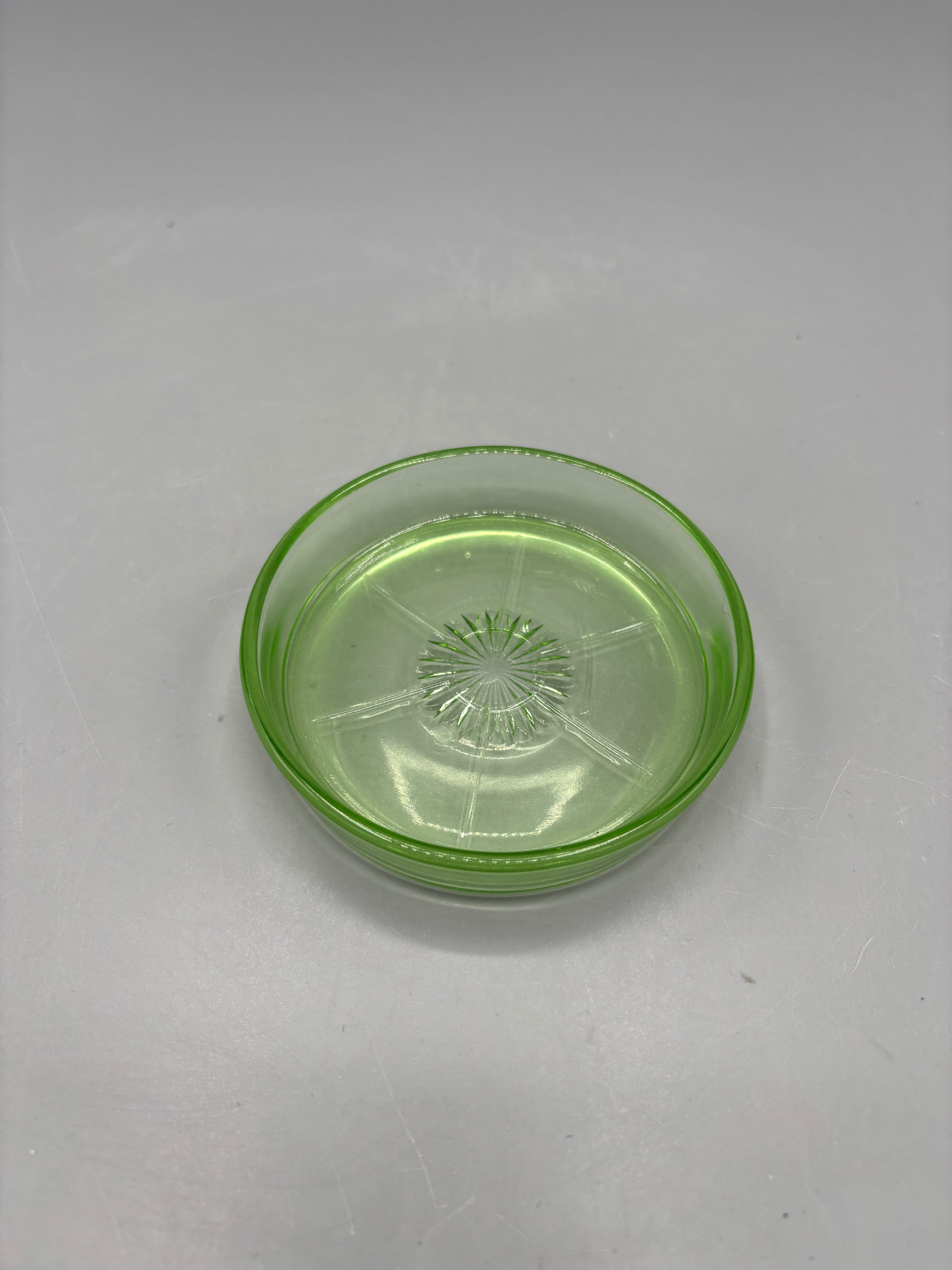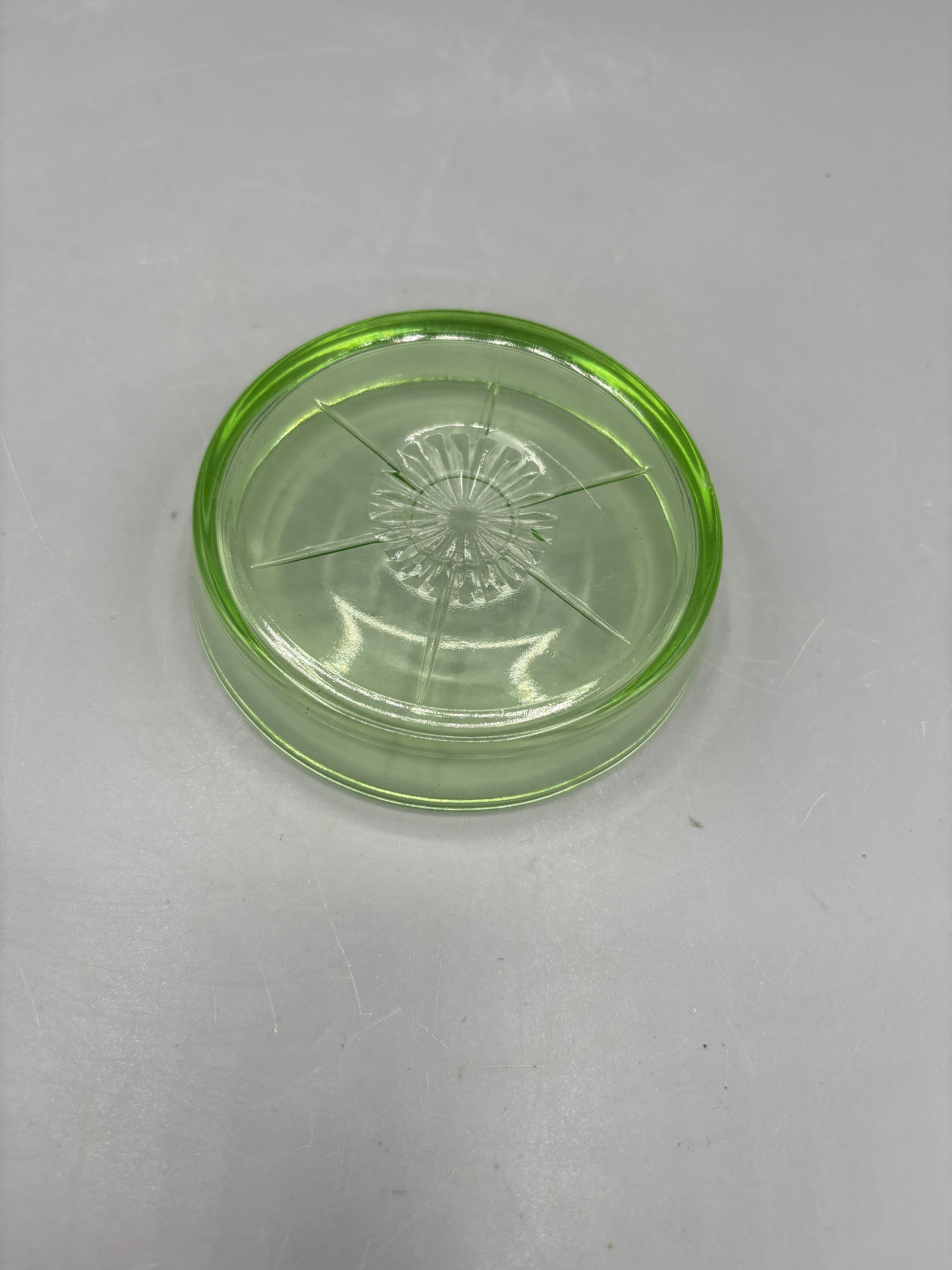 The perfect piece for the collector without a lot of space! This uranium coaster is made by Federal Glass and features the makers mark right in the center. Although the mark is faint, you can see the shield with the capital F in the center.
