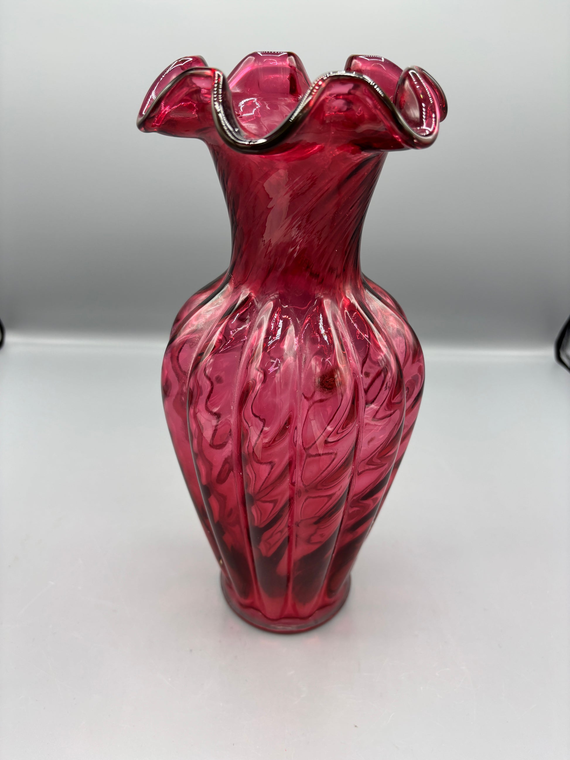 Vintage Fenton 11 1/2" Cranberry Scallop Top Swirl Design Vase