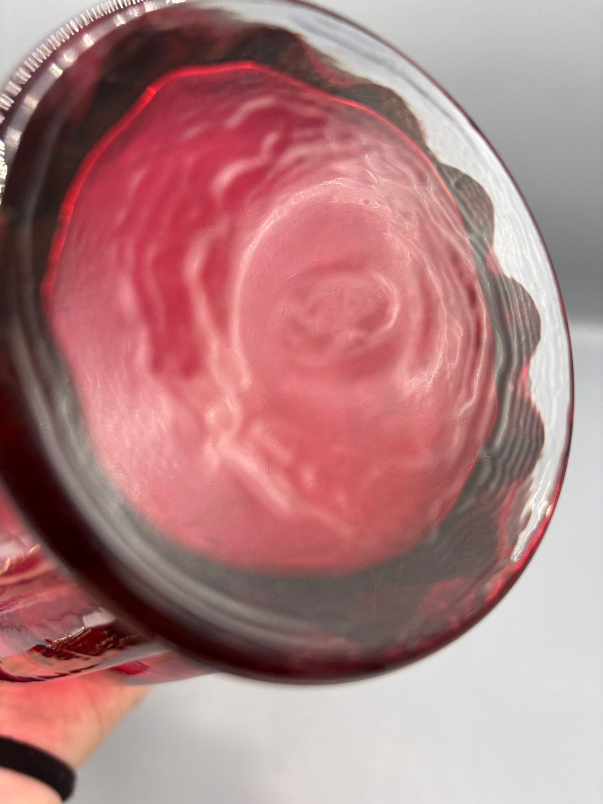 This lovely vase was made by Fenton in a gorgeous cranberry color. The top of the vase is scalloped, giving it an air of elegance.