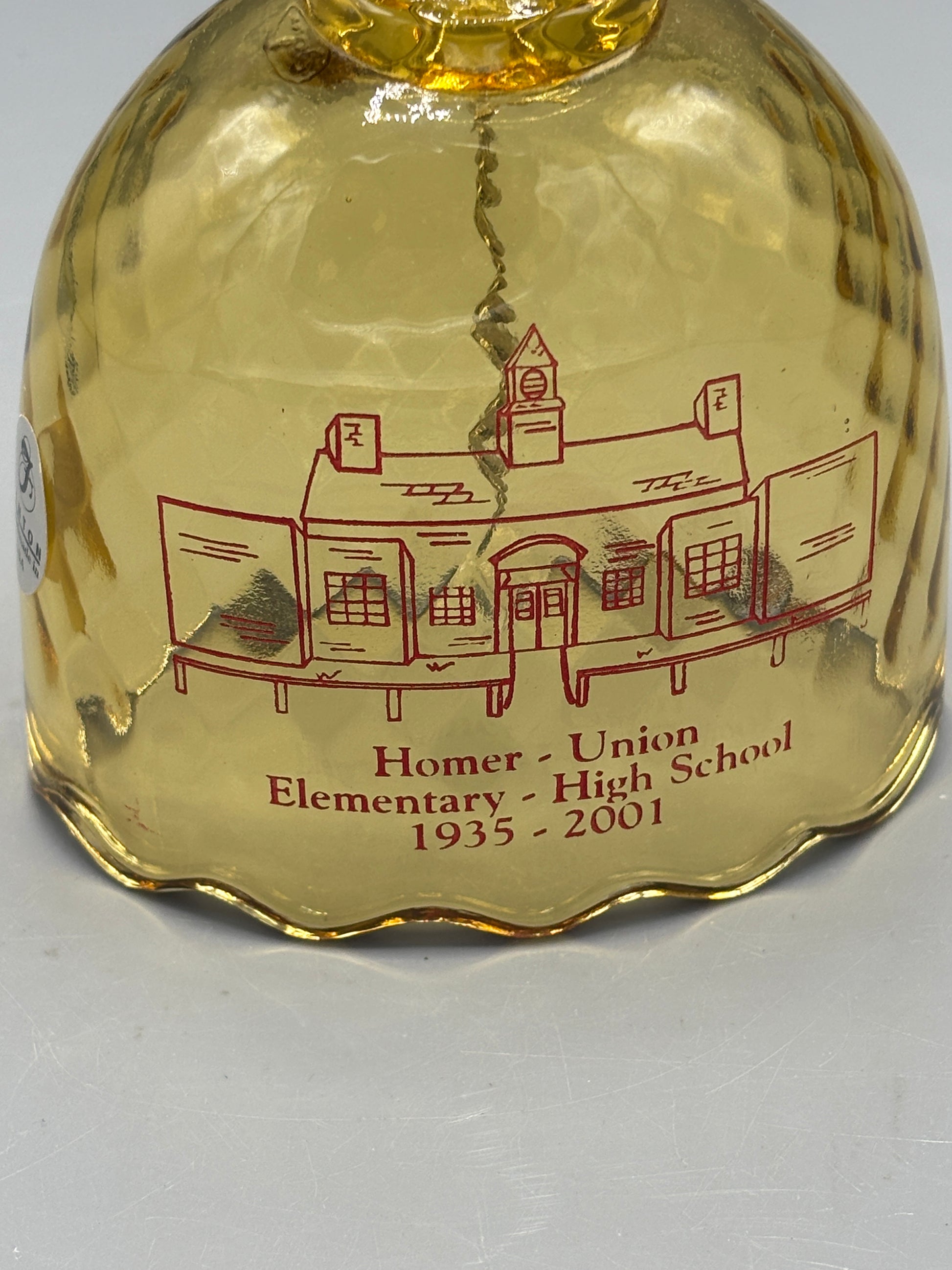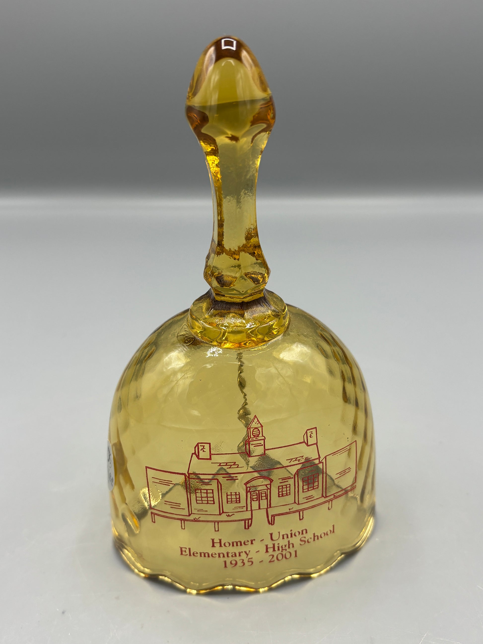Vintage Fenton Amber gold bell that has "Homer Union School" on the front. This has no damages and the details of the school makes a great piece of history souvenir .