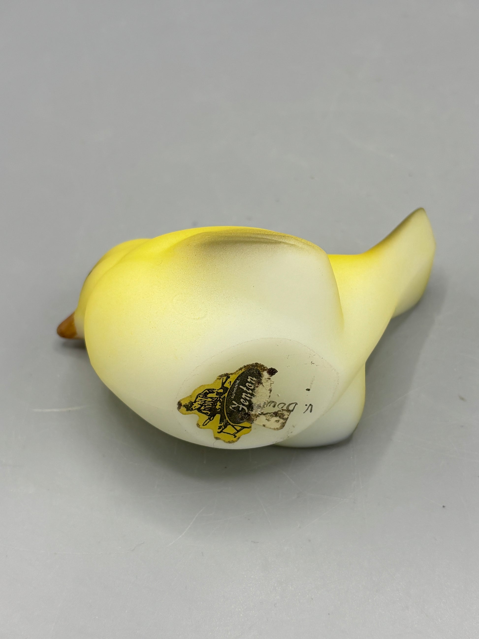 Discover this charming vintage Fenton art glass bird figure, crafted in a soft yellow satin finish. Hand-signed by the artisans at Fenton, this collectible piece showcases the quality and artistry the company is renowned for. Perfect for collectors of American glass art or anyone seeking a delicate decorative accent with timeless appeal.