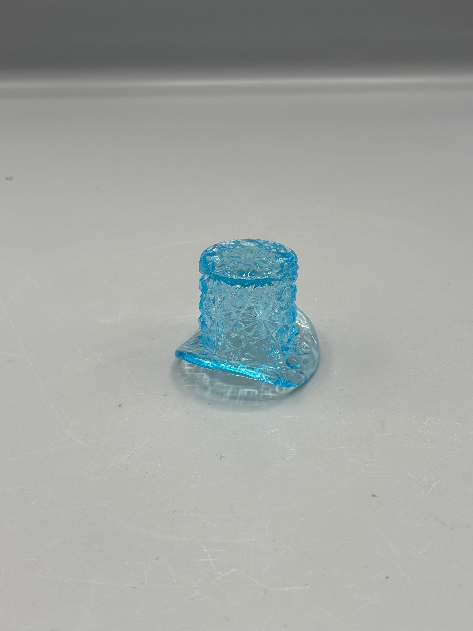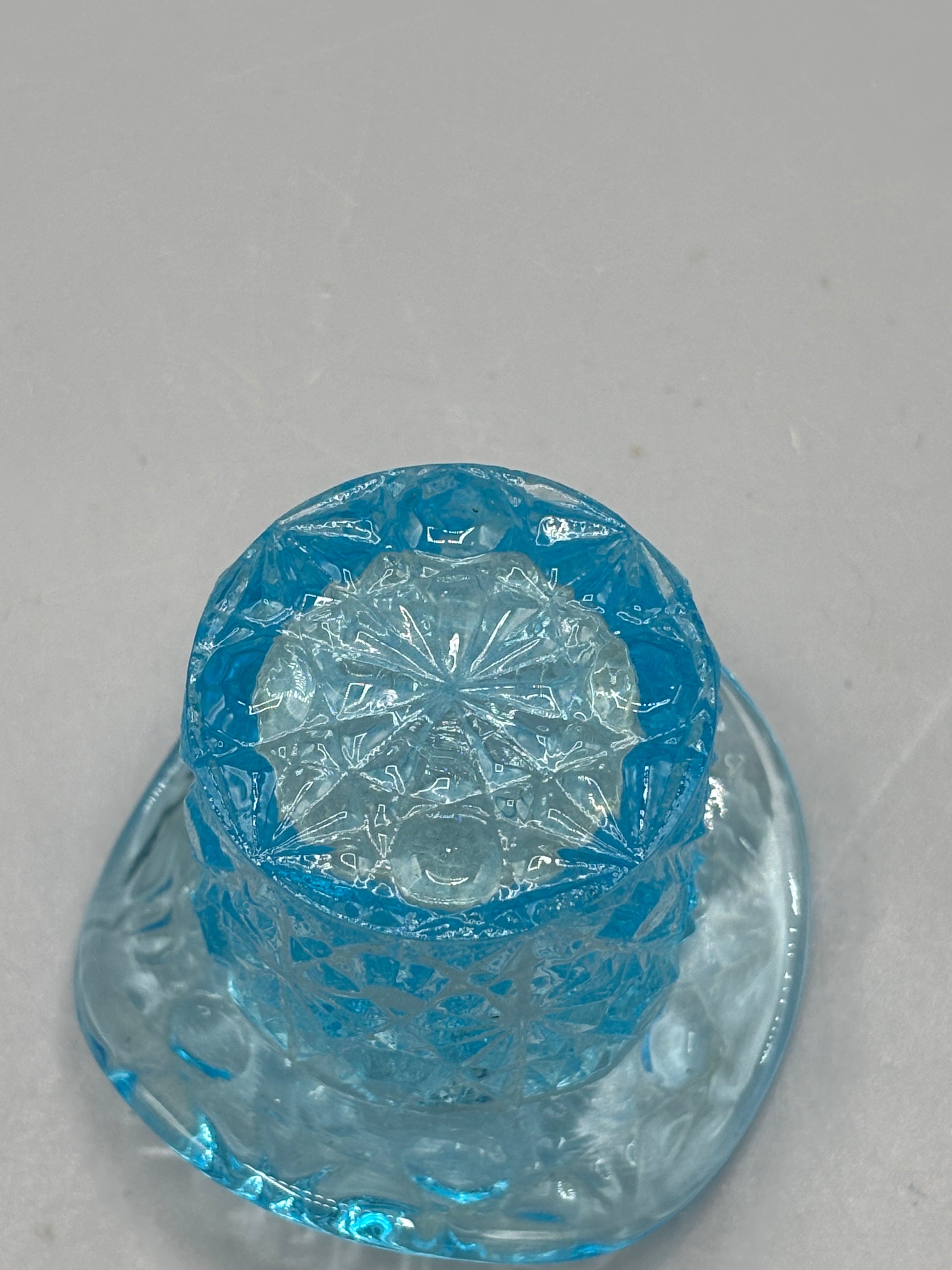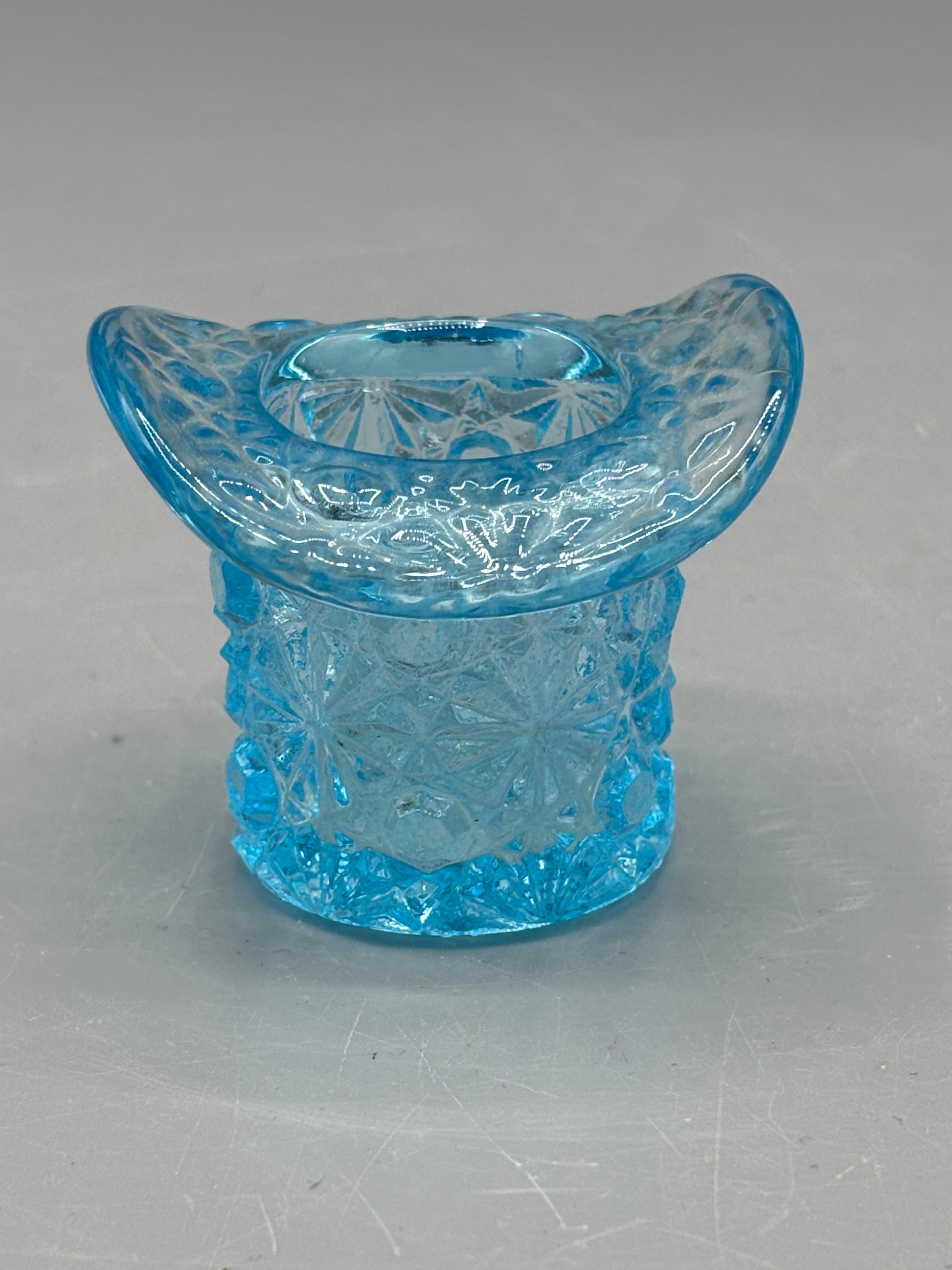 Vintage Fenton Blue Opalescent top hat toothpick holder that will be a conversation starter at any gathering. The blue shades on this hat is stunning and the Daisey & button pattern add extra details. This shows no cracks or chips.