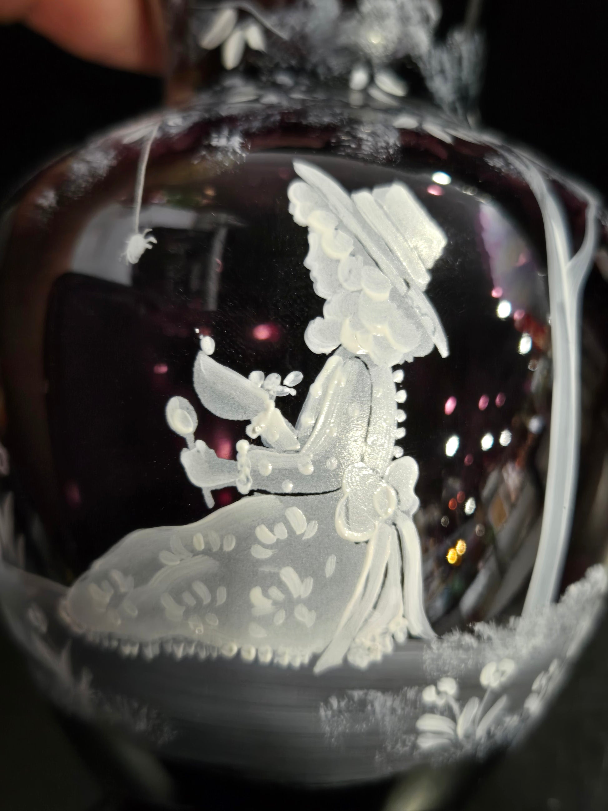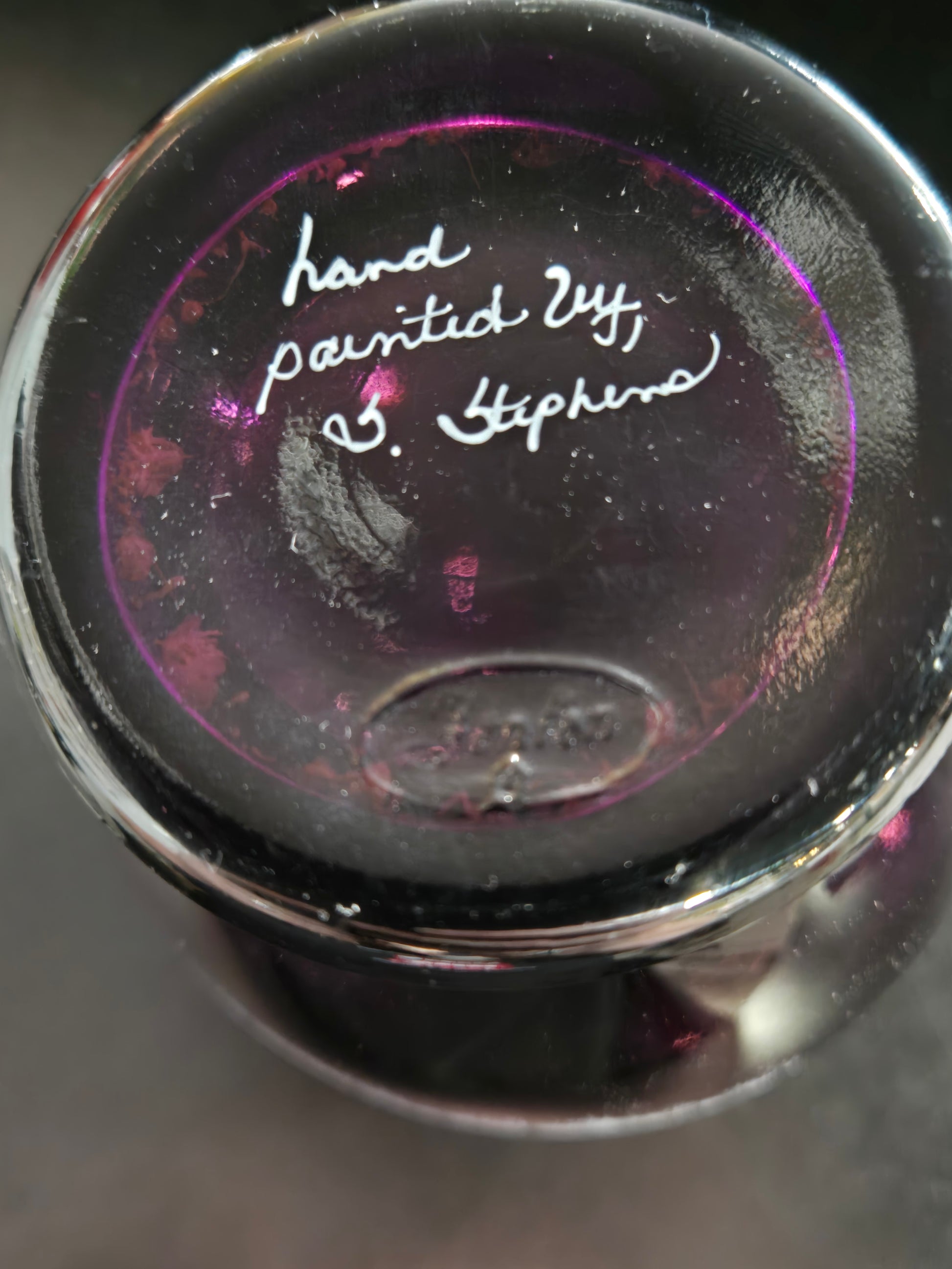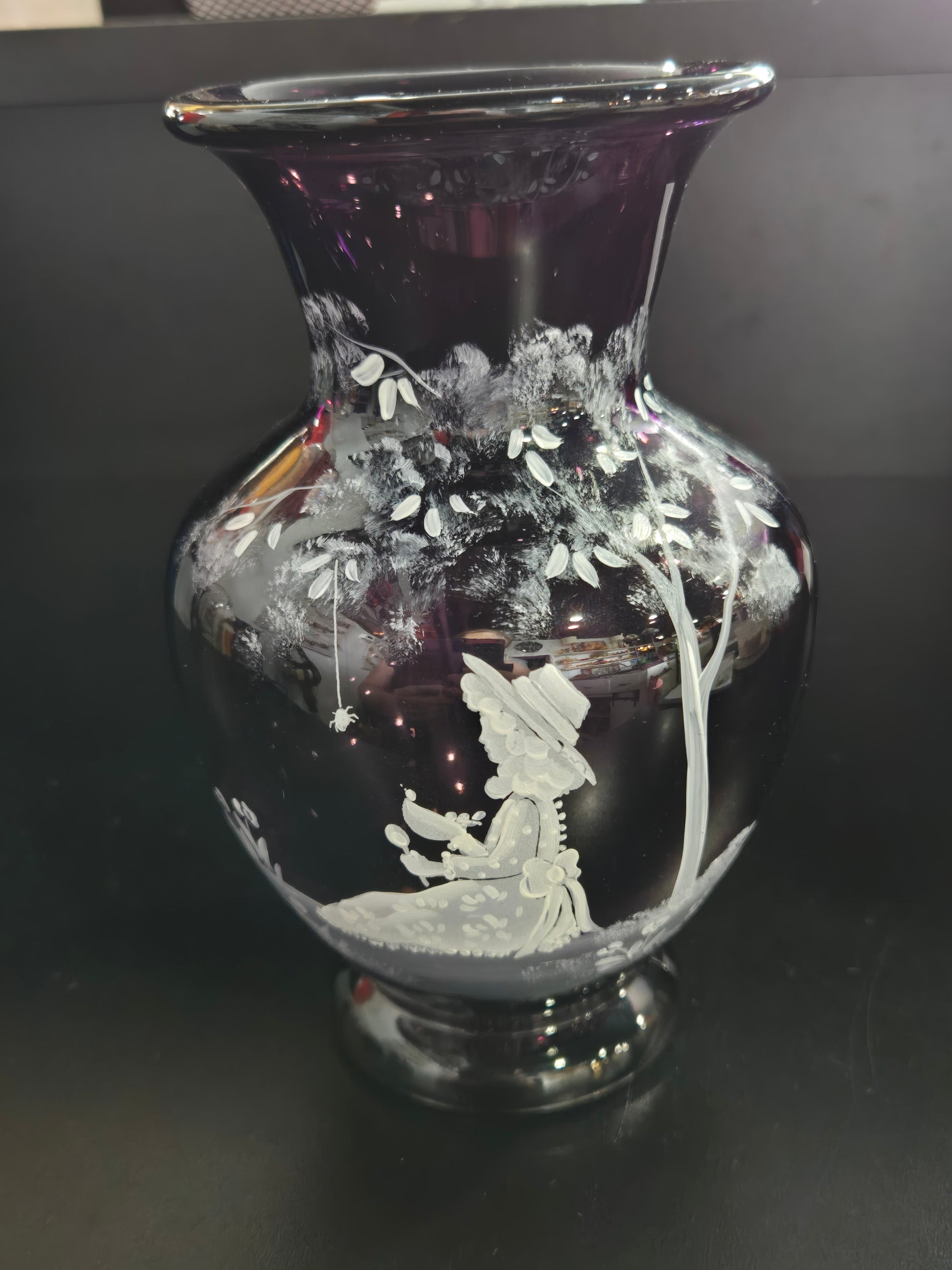 This beautiful vase from Fenton is a deep purple color that has a scene from the beloved nursey rhyme "Little Miss Muffet". Styled after Mary Gregory, the scene is painted all in white. The detail is absolutely stunning!