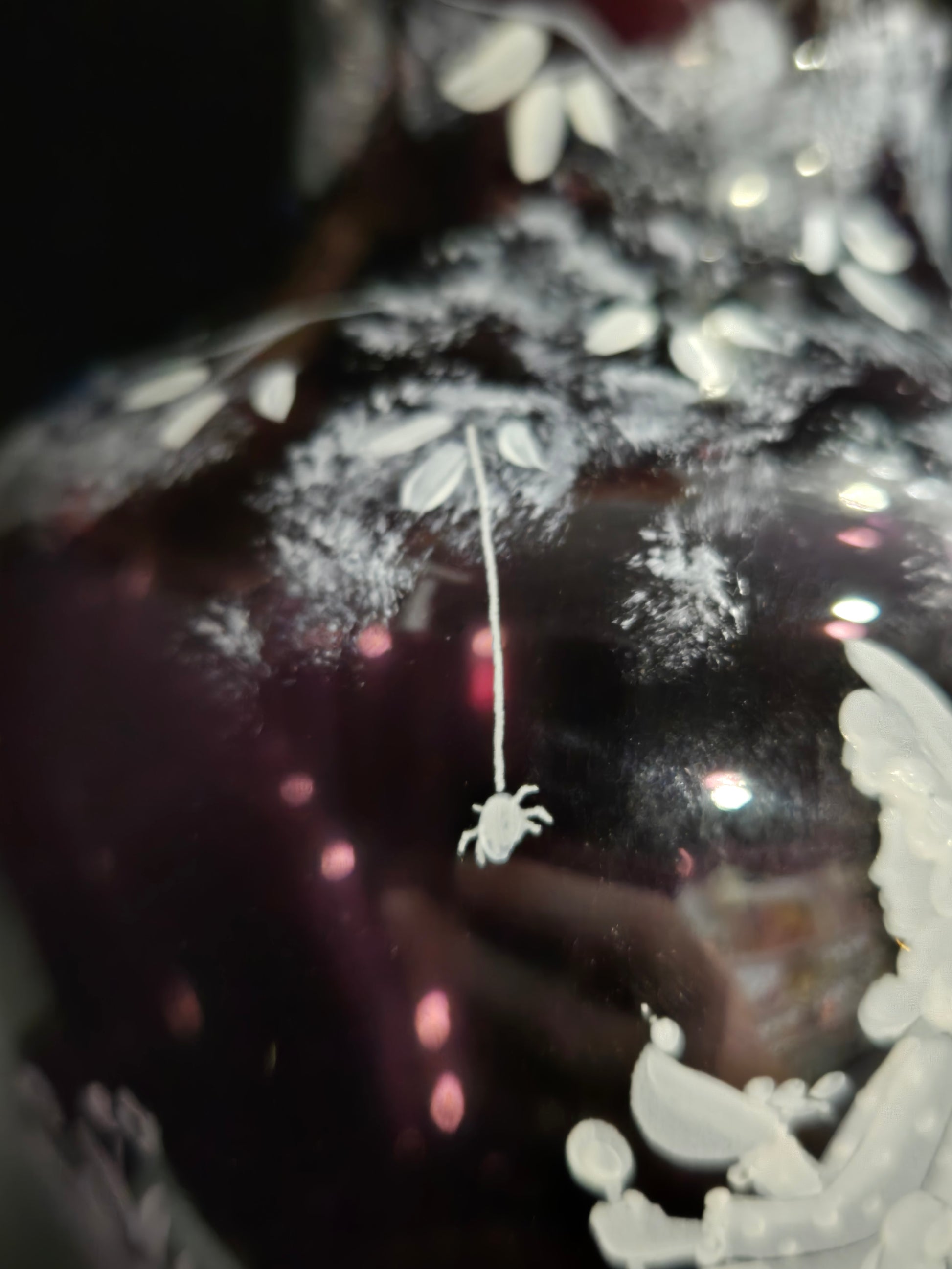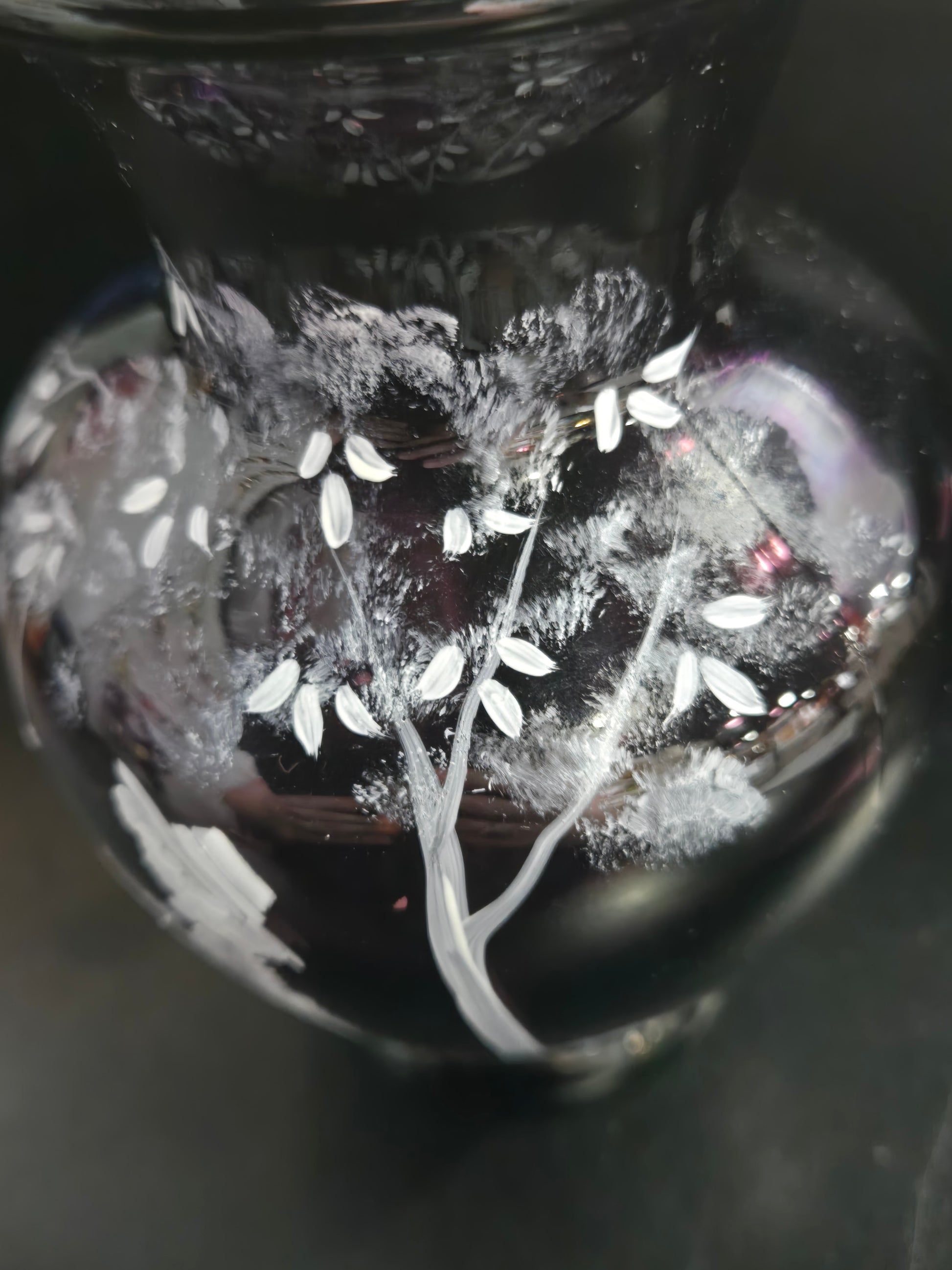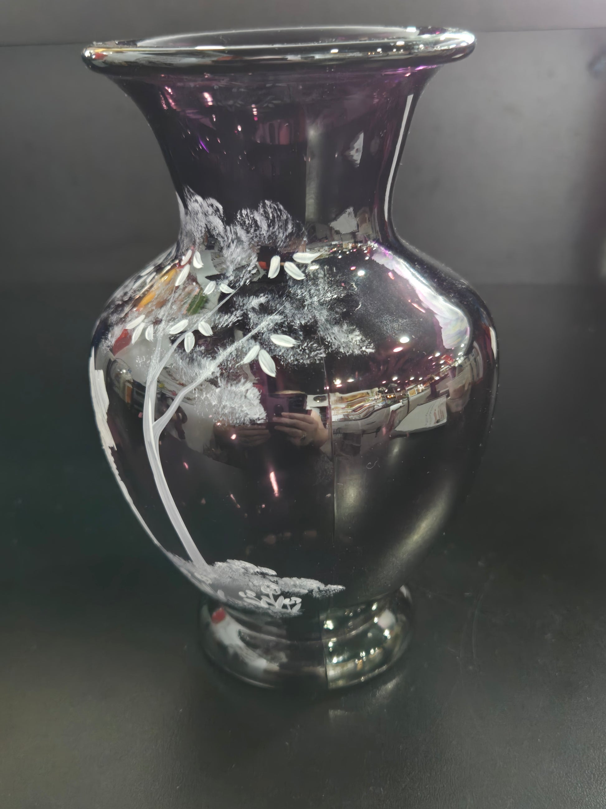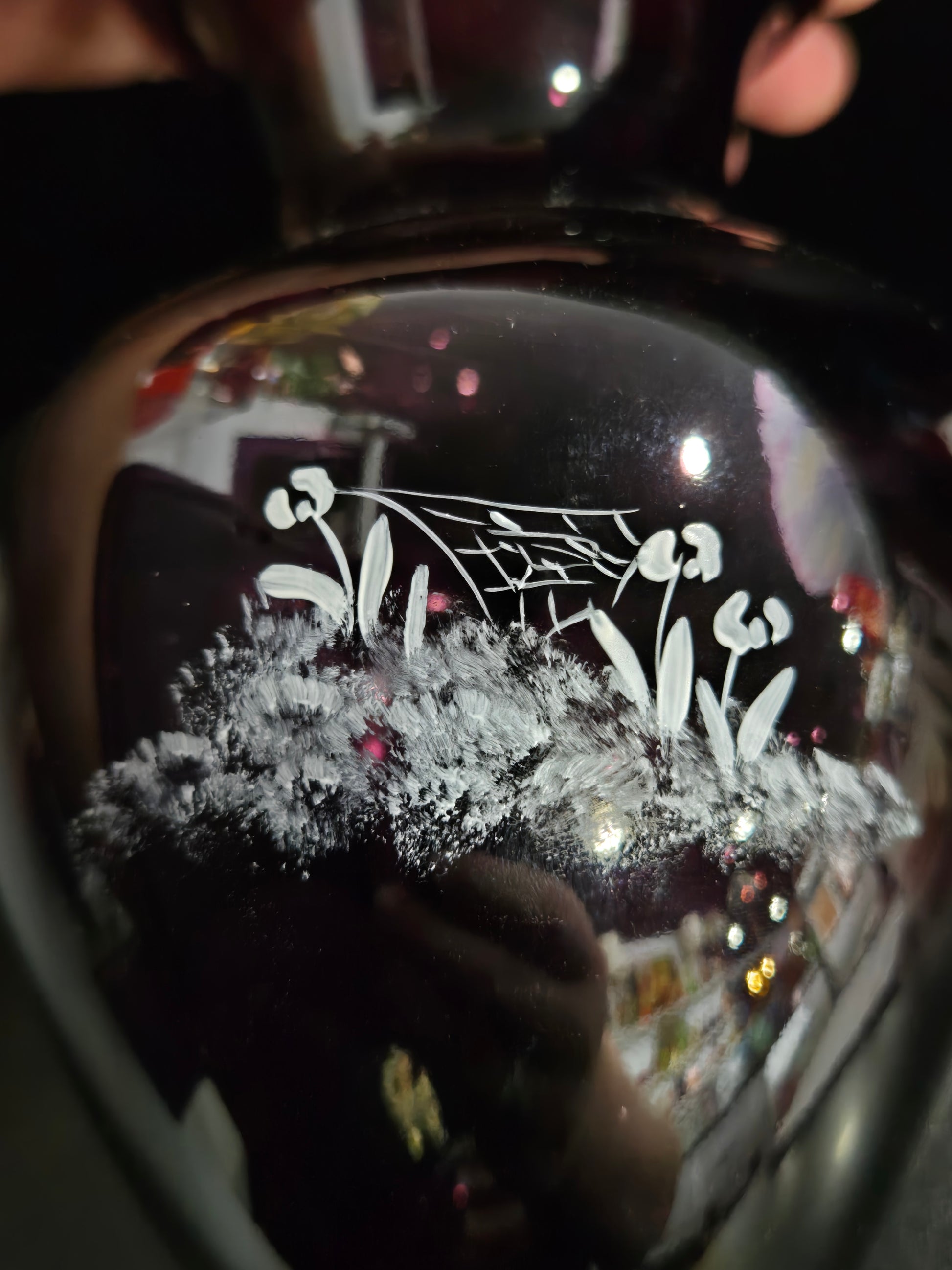 This beautiful vase from Fenton is a deep purple color that has a scene from the beloved nursey rhyme "Little Miss Muffet". Styled after Mary Gregory, the scene is painted all in white. The detail is absolutely stunning!
