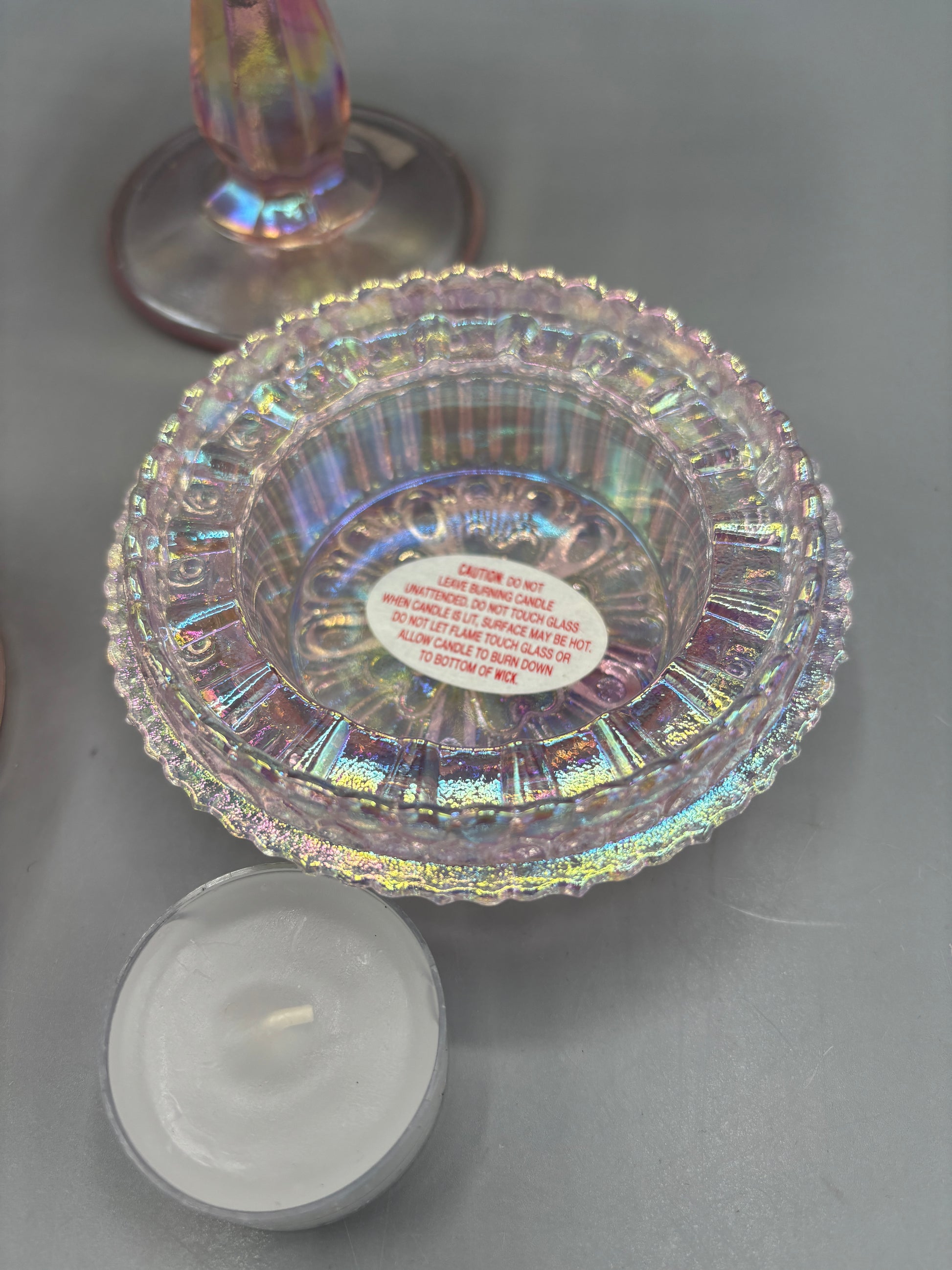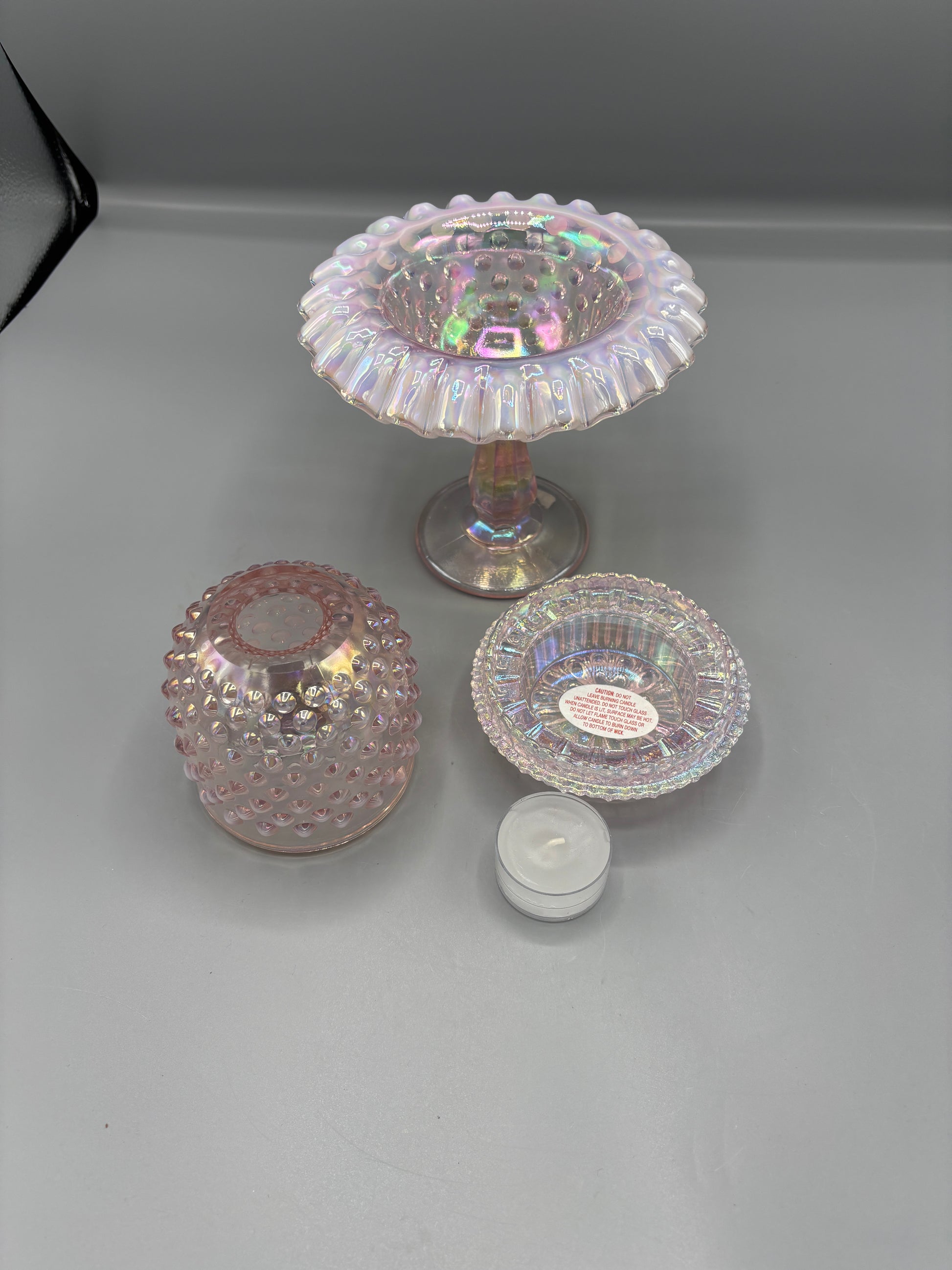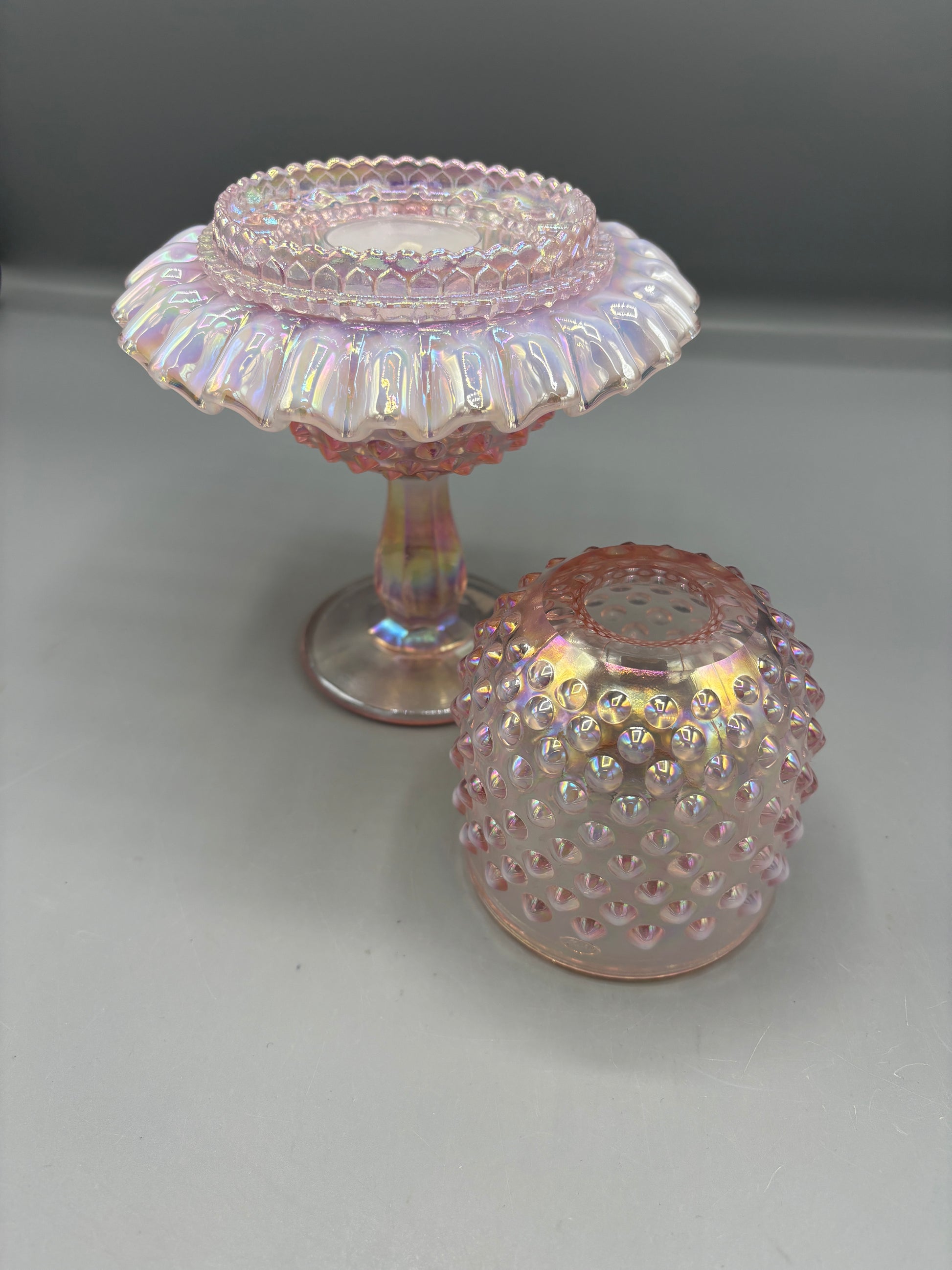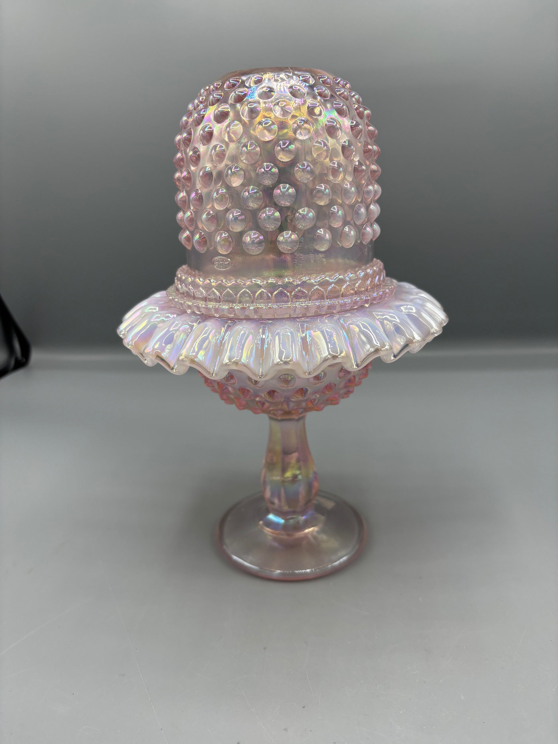 Vintage Fenton Pink 95th Anniversary Carnival glass that is stunning. This is a 3 piece set that makes this Fairy lamp a Rare find. This shows no signs of damages.