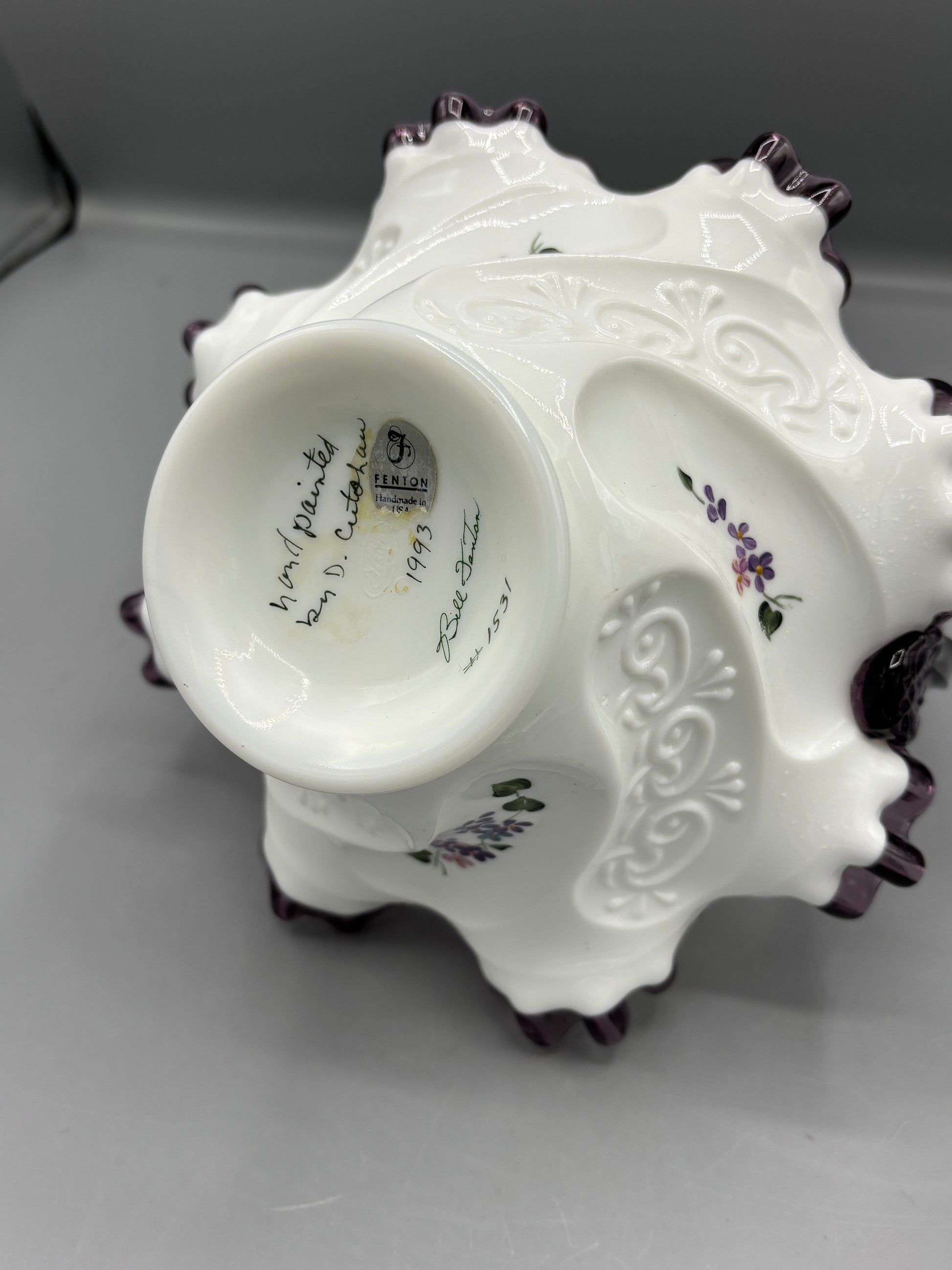 This charming vintage Fenton basket showcases beautiful plum-colored crest detailing, expertly hand-painted to capture classic artisan craftsmanship. Measuring 8 x 10 inches, it's perfectly sized for display or functional storage. A delightful piece for collectors of vintage glassware and those who appreciate timeless decorative accents with authentic character and quality construction.