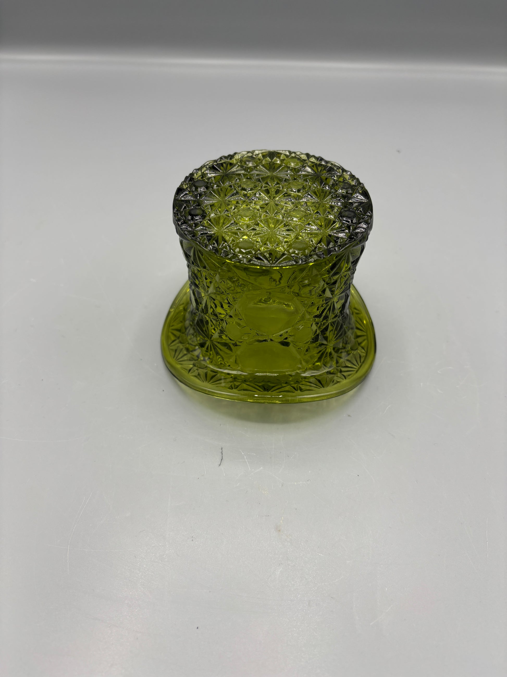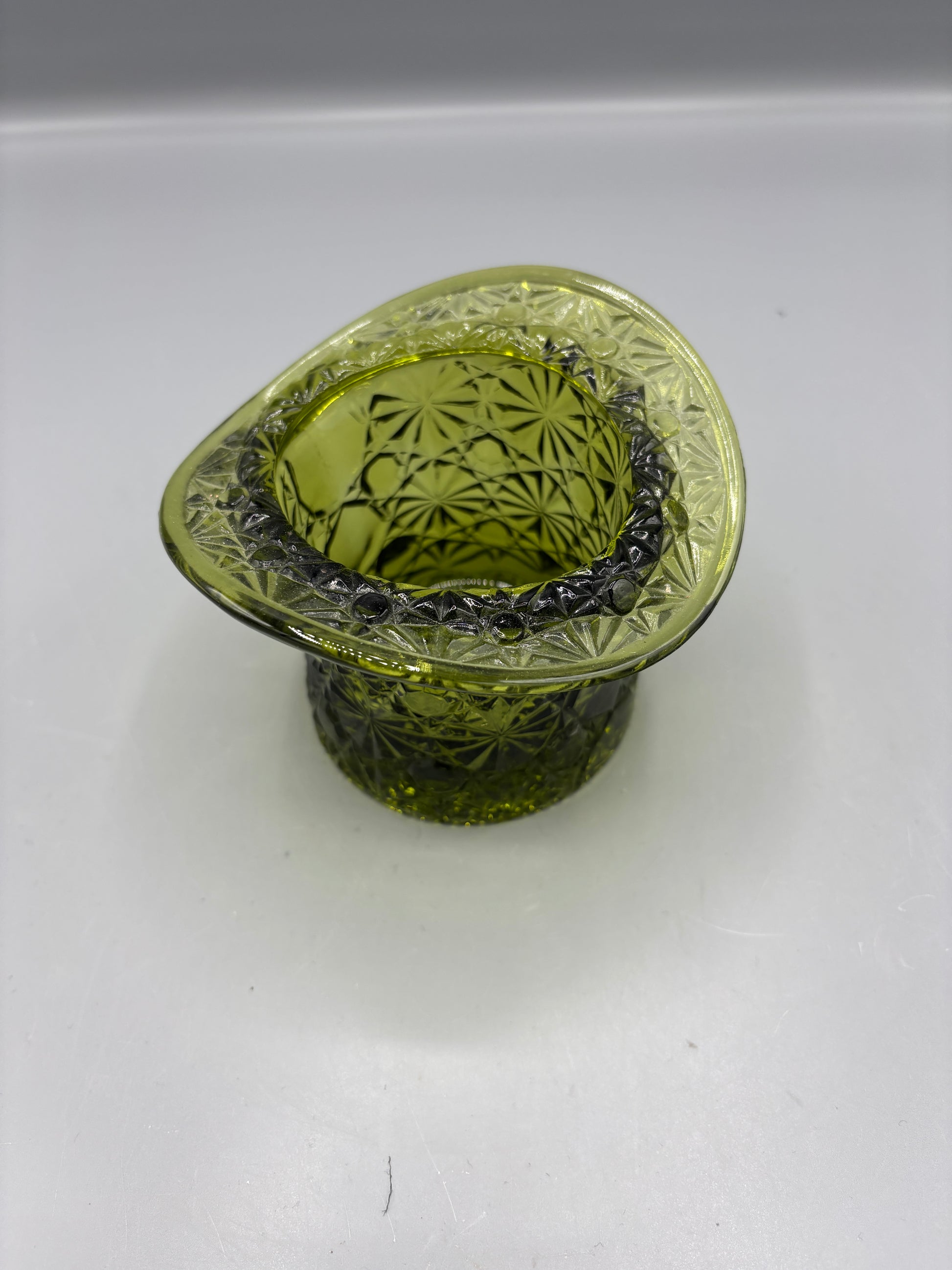 Vintage Fenton Top hat that is green and has the Daisey & Button pattern. This is a lovely hat to add to any Fall display. This shows no cracks or chips.