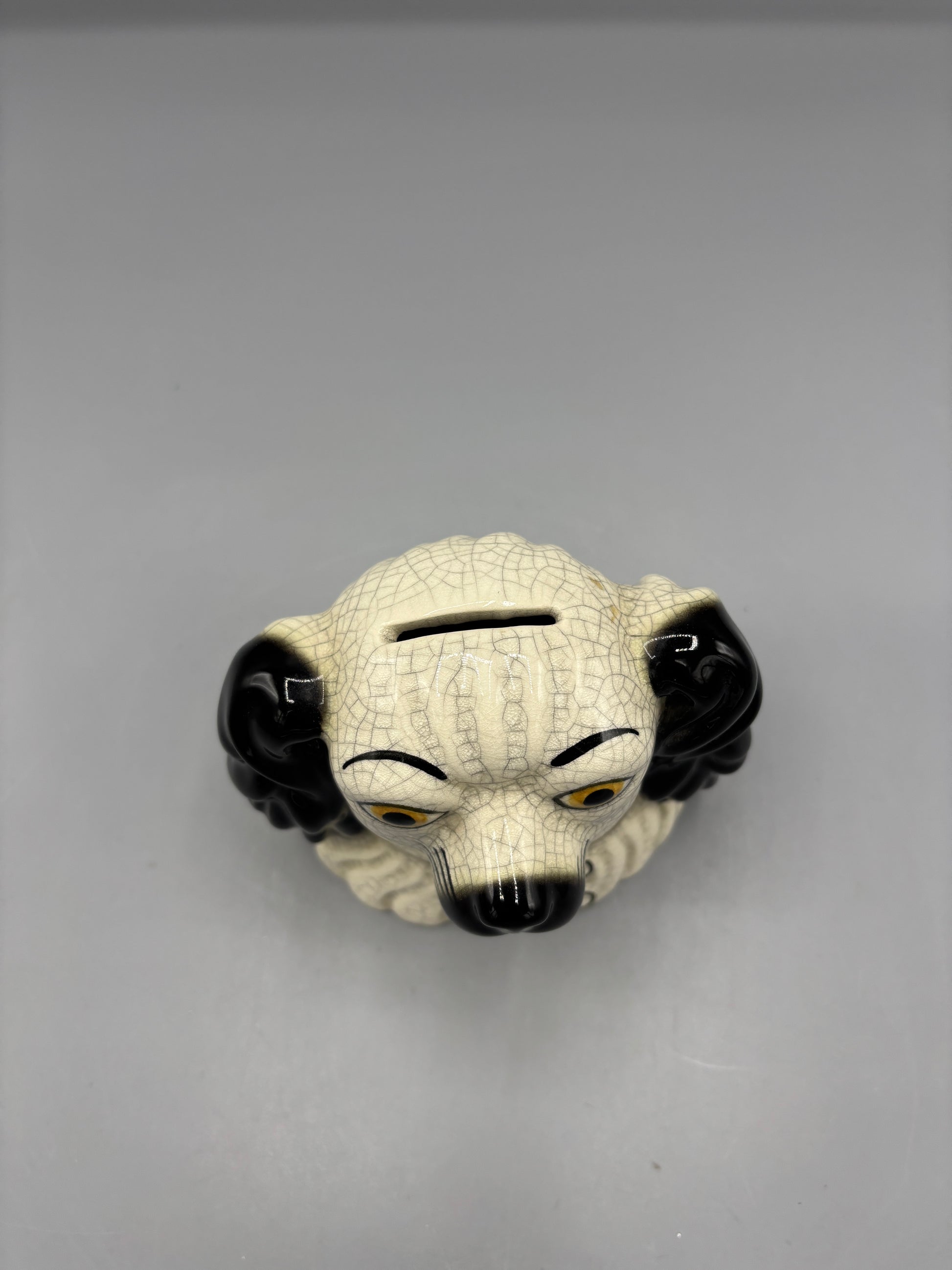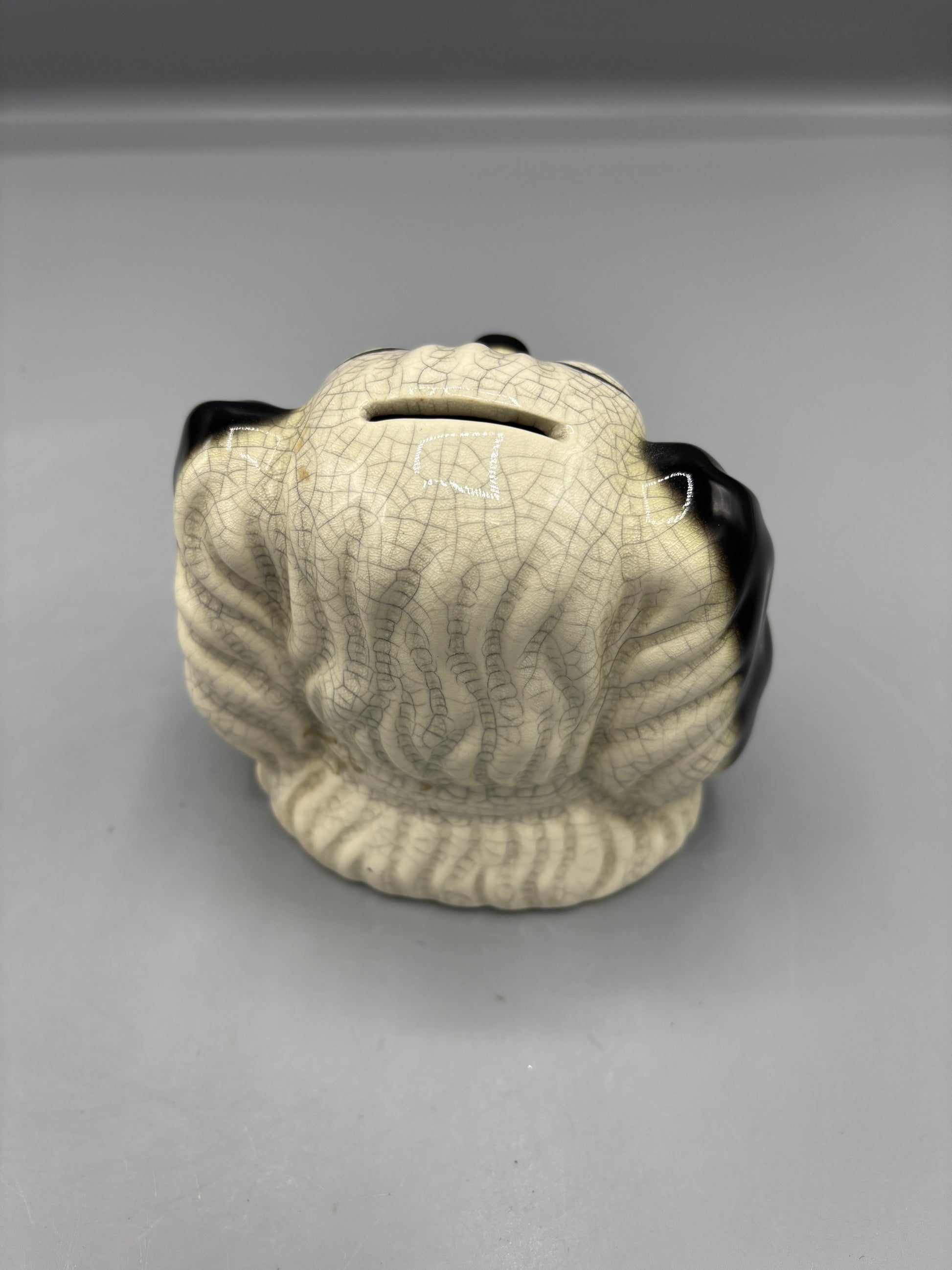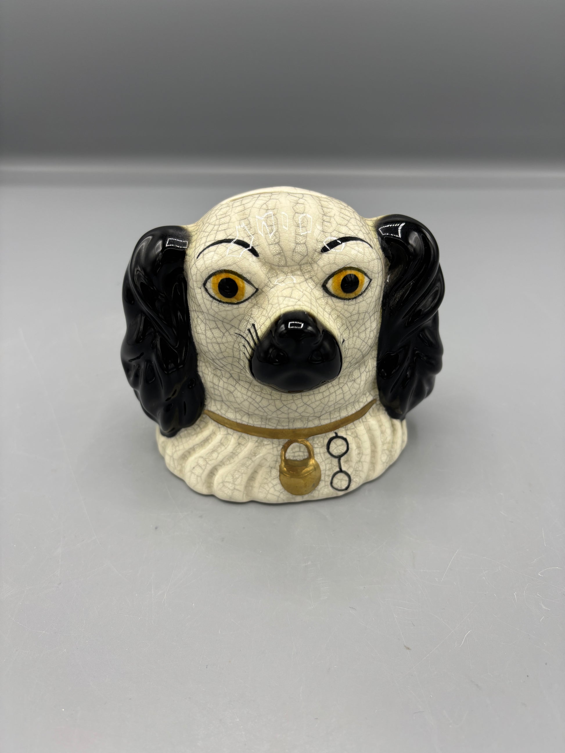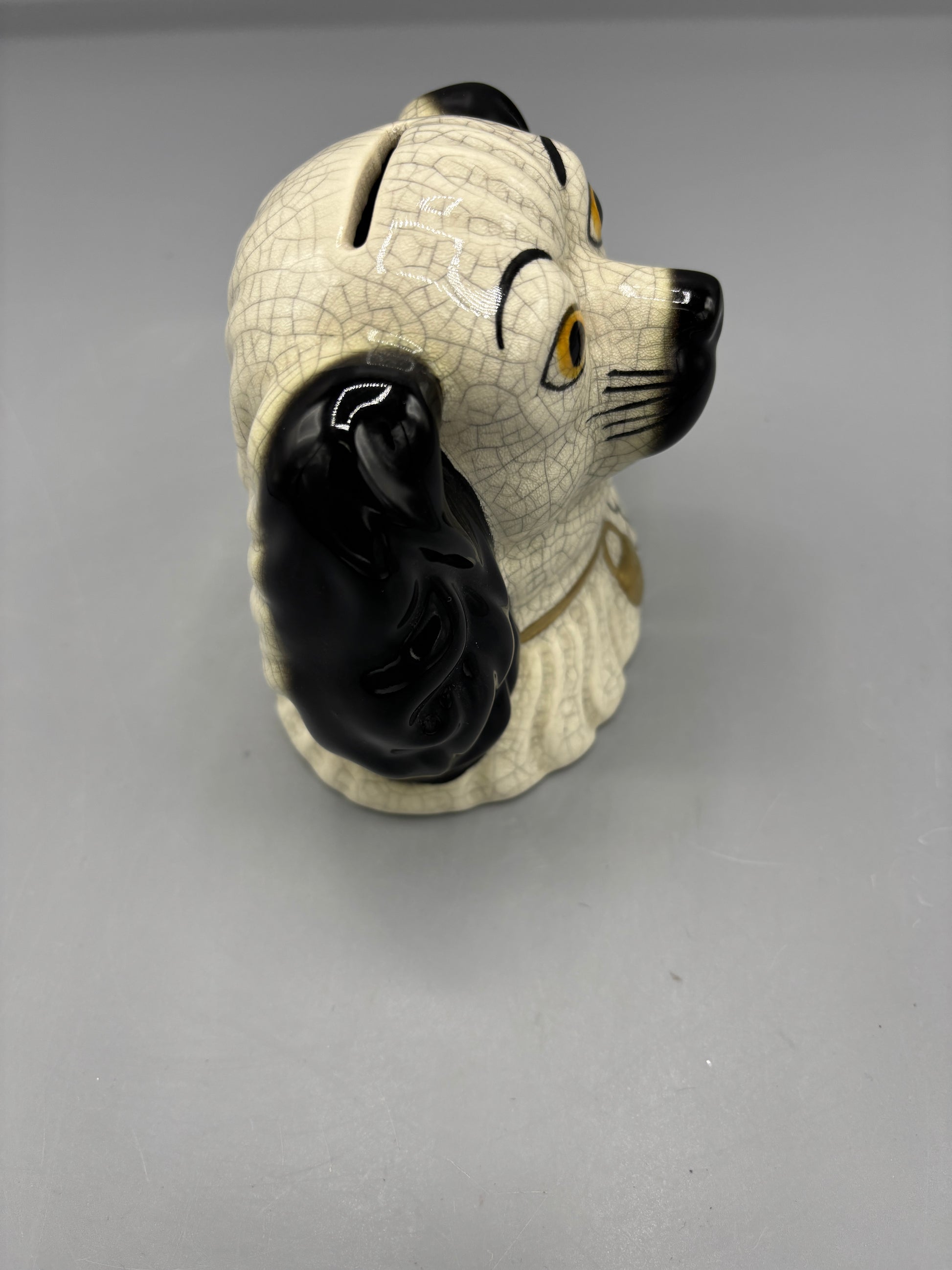 This cute coin bank is very reminiscent of the Staffordshire dogs that are so collectible. Made by Fitz & Floyd, you know they're quality pieces. This coin bank is a black and white spaniel finished with a crackle glaze.