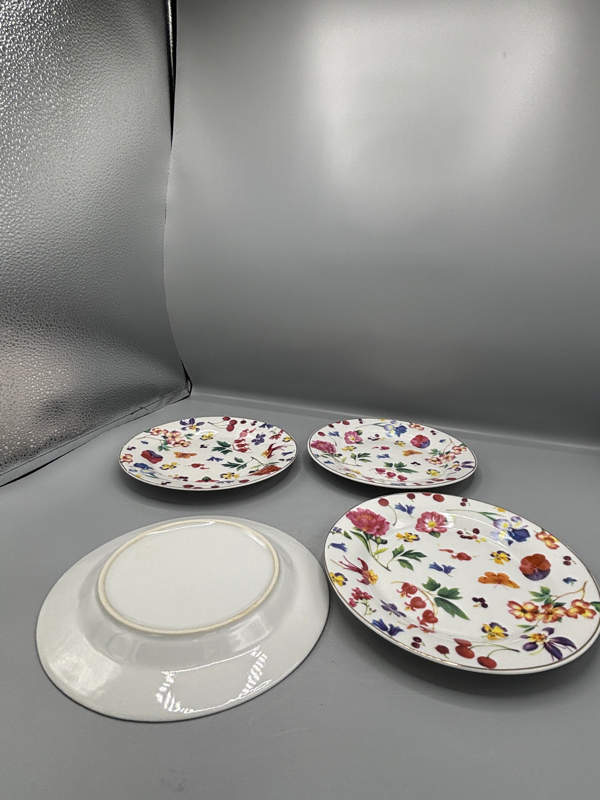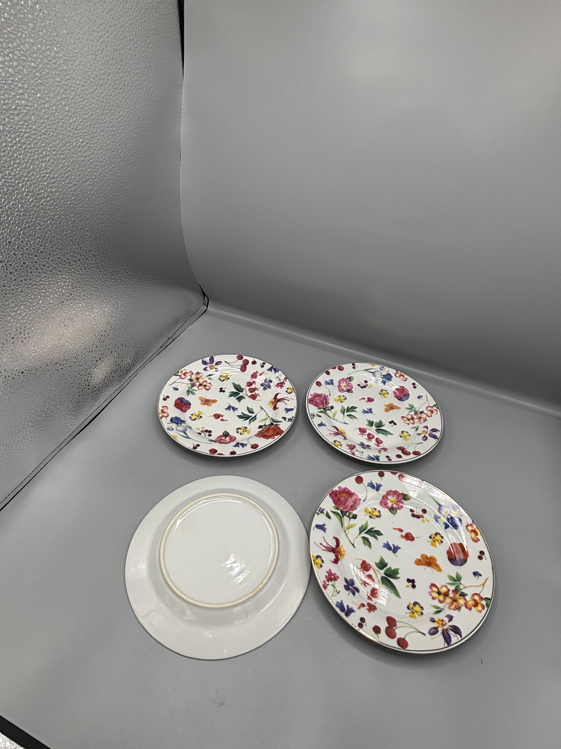 A curated set of four vintage floral chintz dessert plates, each measuring 7½ inches in diameter. These charming pieces showcase classic botanical patterns characteristic of traditional chintz design, making them ideal for serving desserts, appetizers, or displaying as decorative tableware. Perfect for collectors of vintage dinnerware or anyone seeking to add timeless elegance to their table setting.