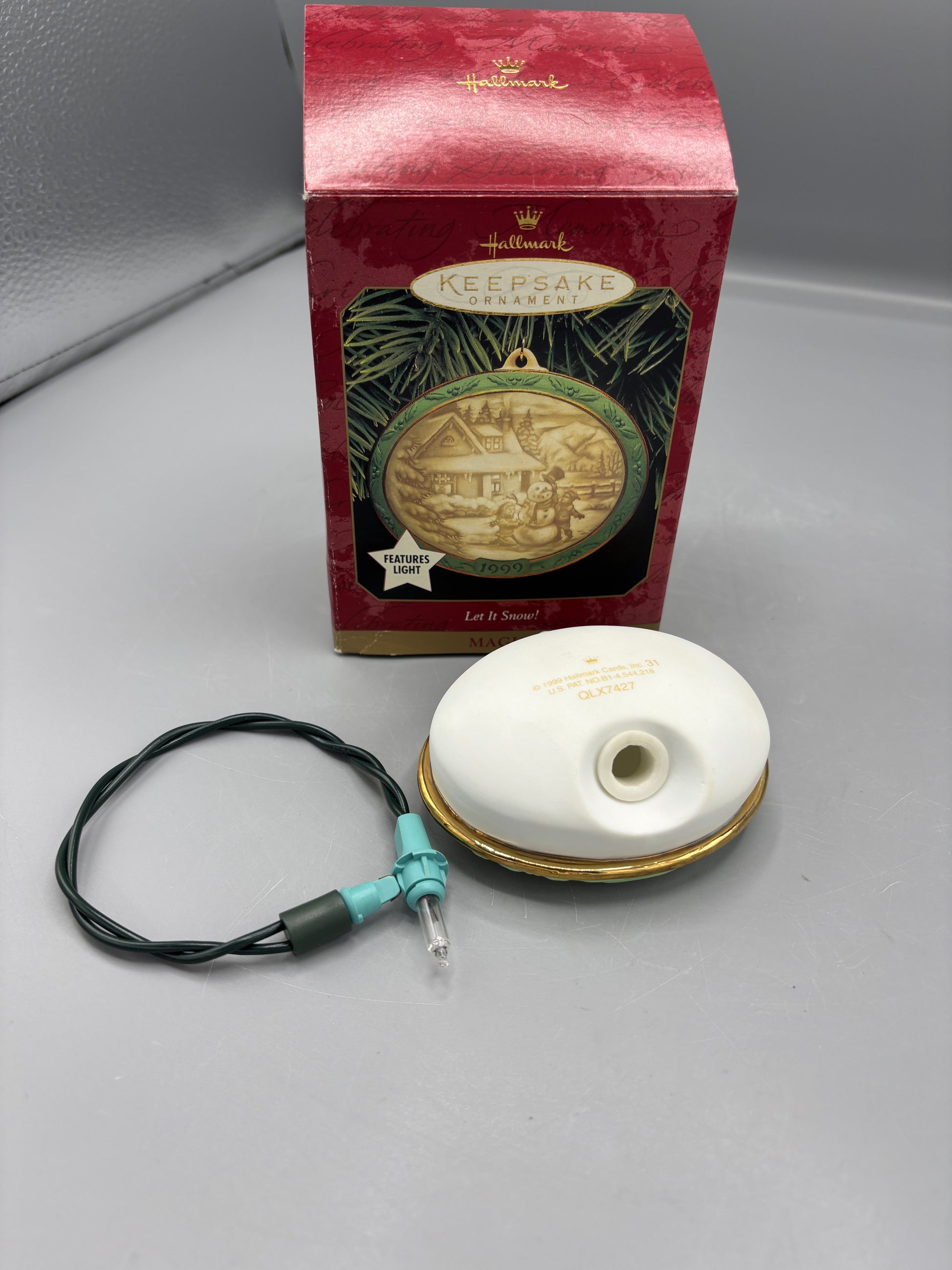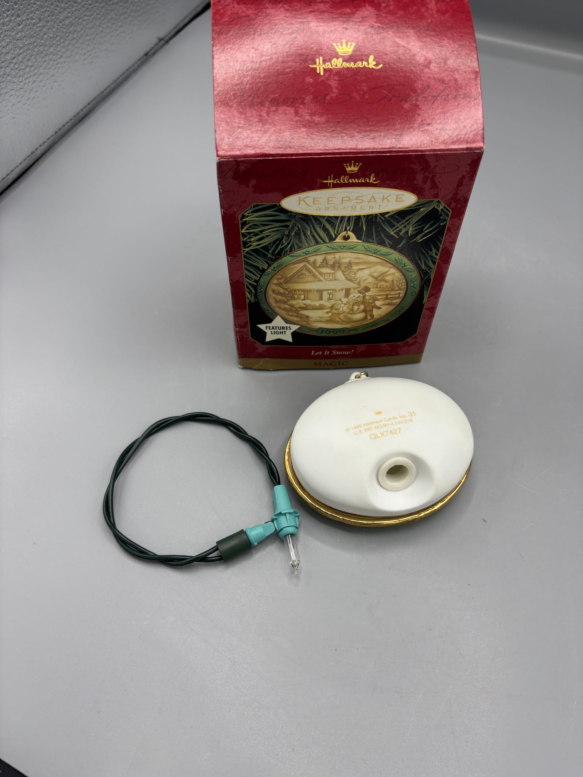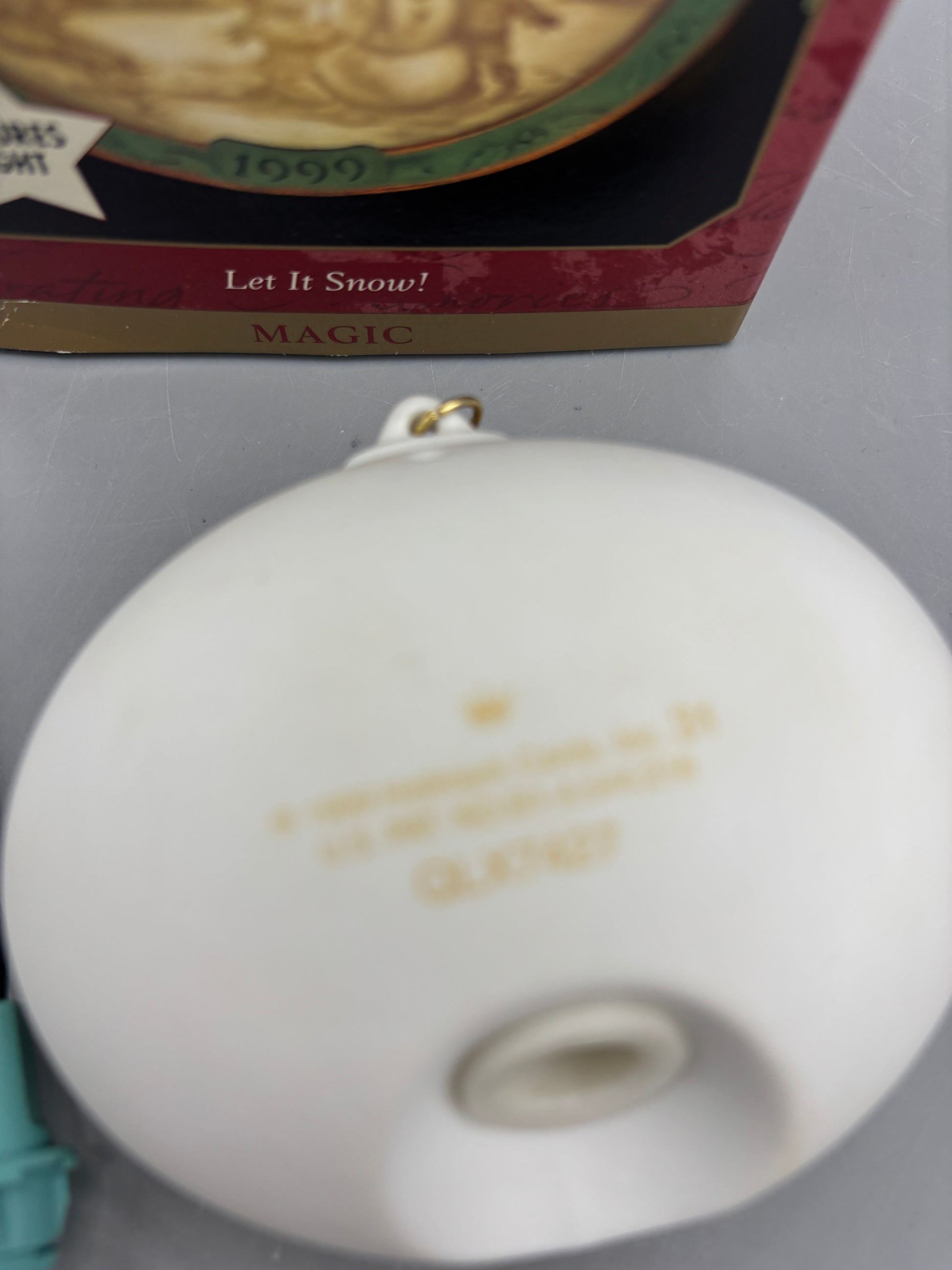 This classic Hallmark ornament captures the nostalgic charm of winter traditions. Featuring the iconic "Let it Snow" design, this vintage piece arrives in its original packaging and measures 3 3/8 by 3 3/4 inches—a timeless addition to any holiday collection. Perfect for collectors seeking authentic seasonal memorabilia.