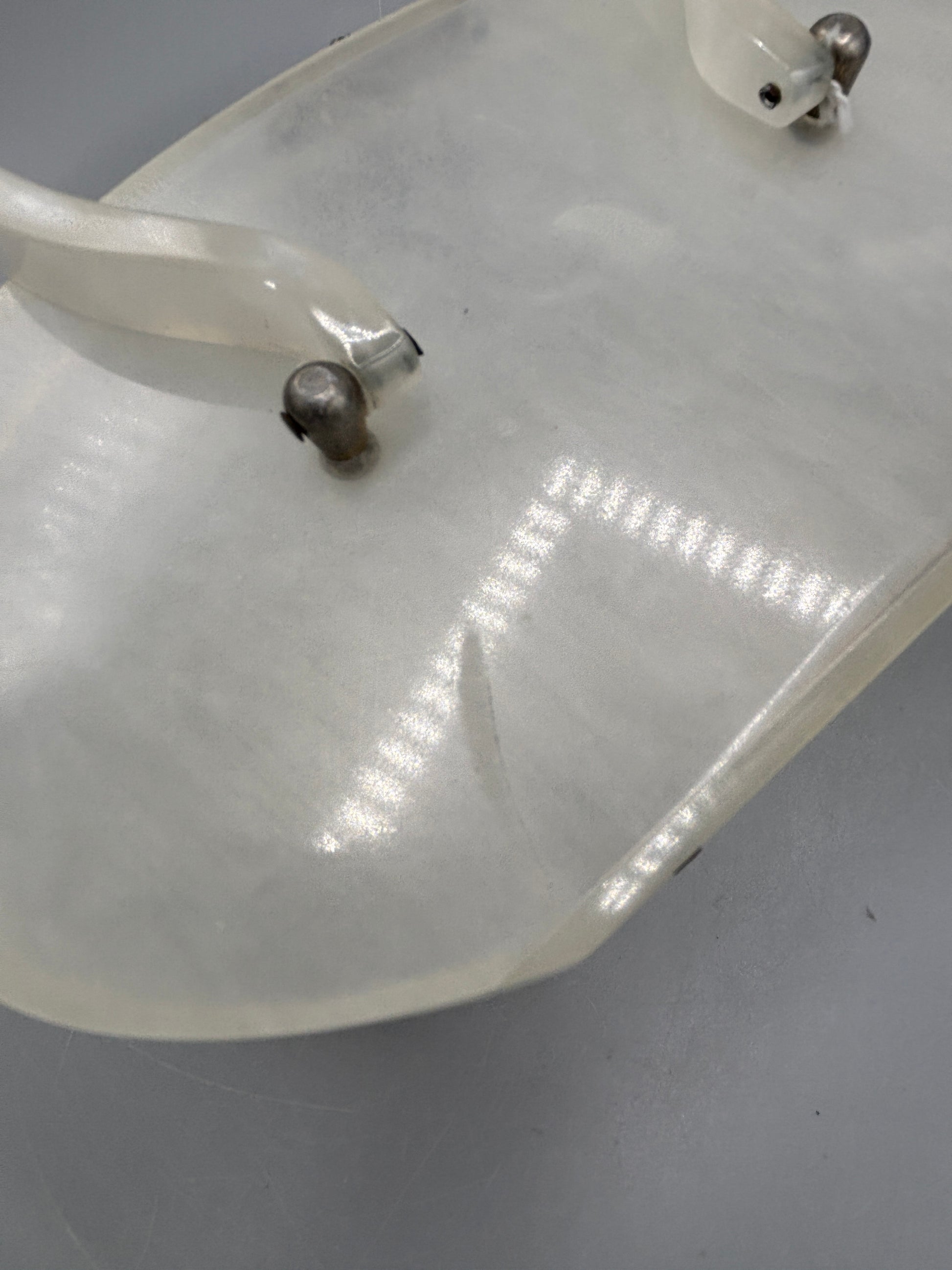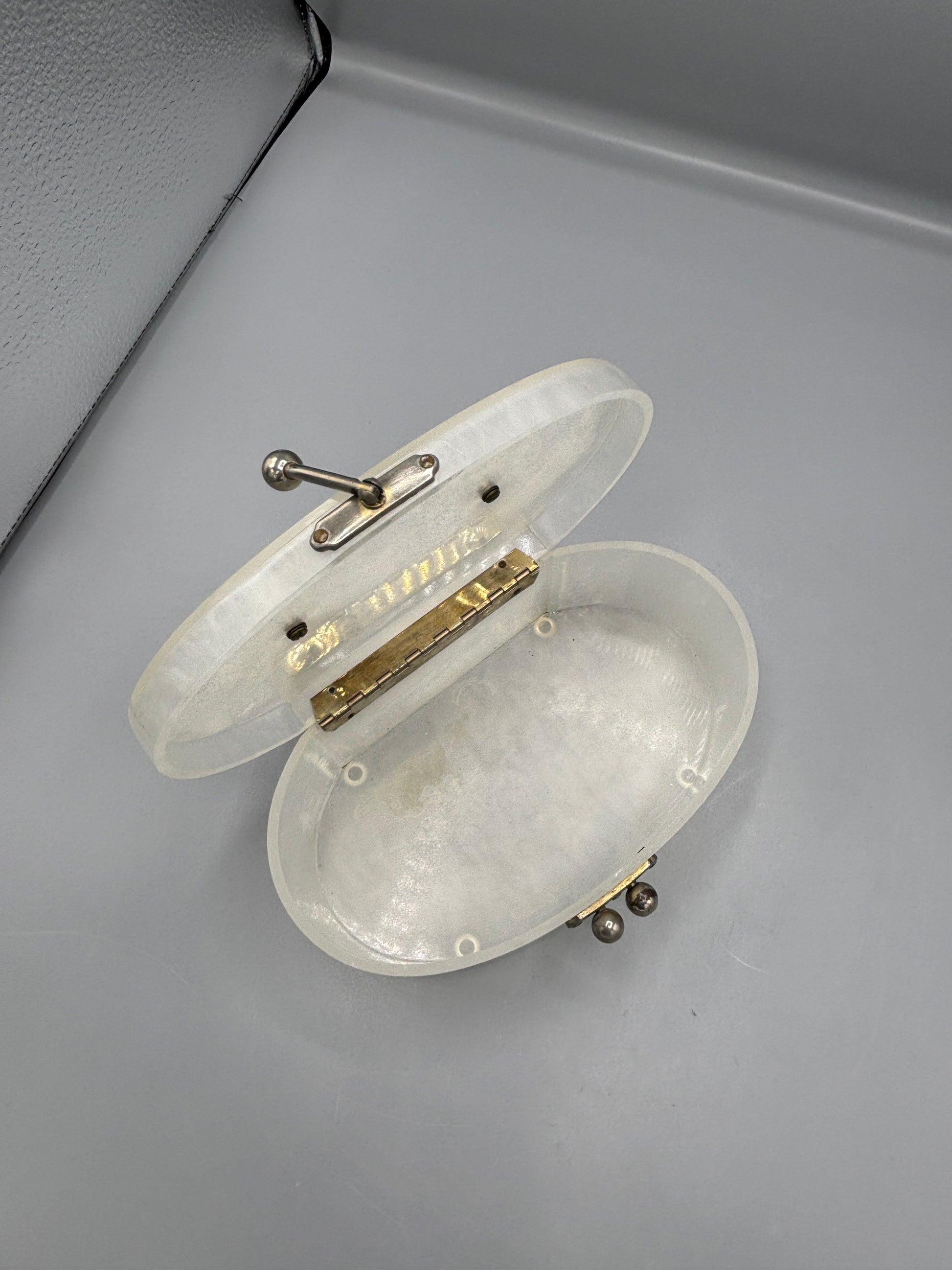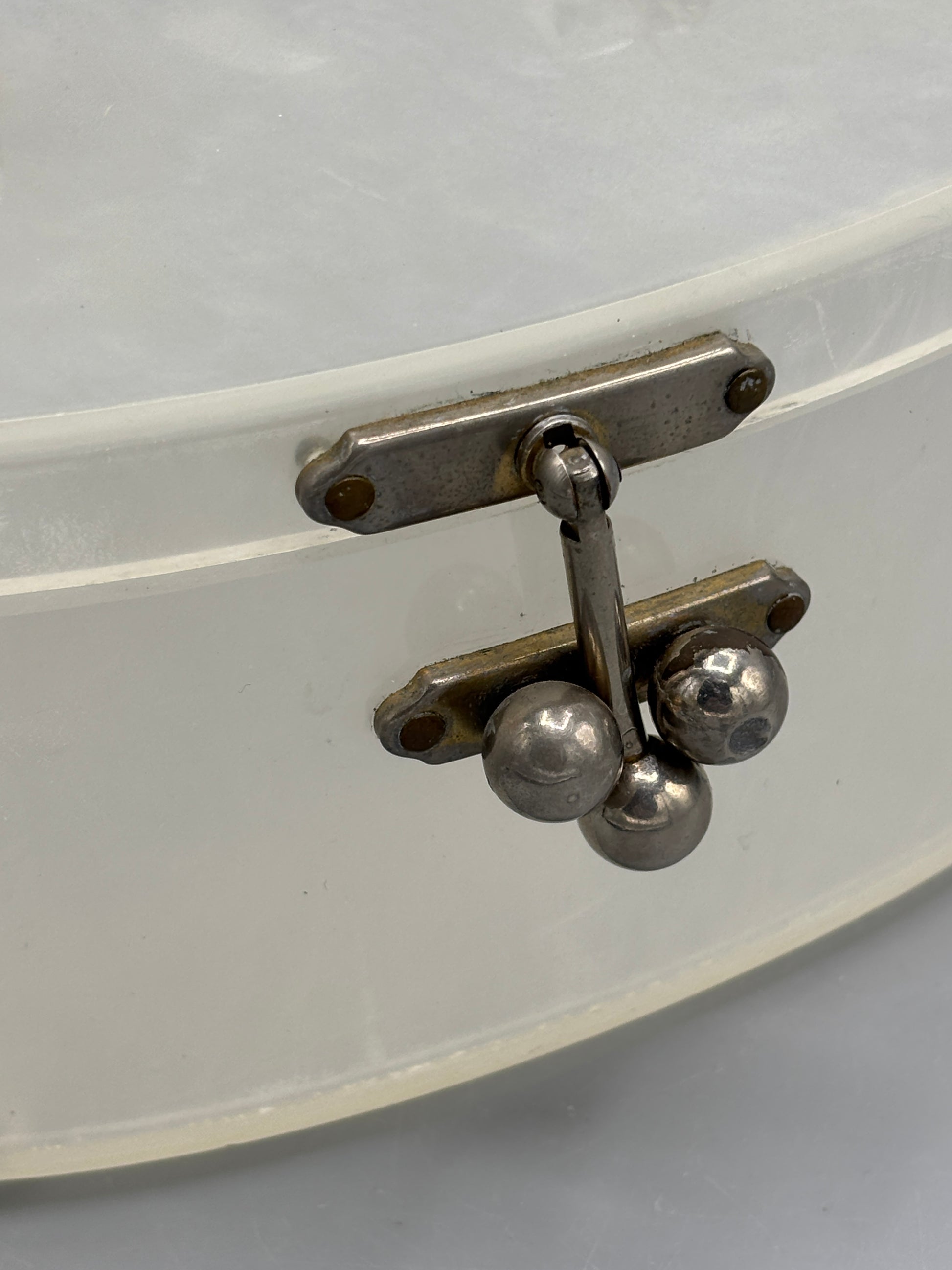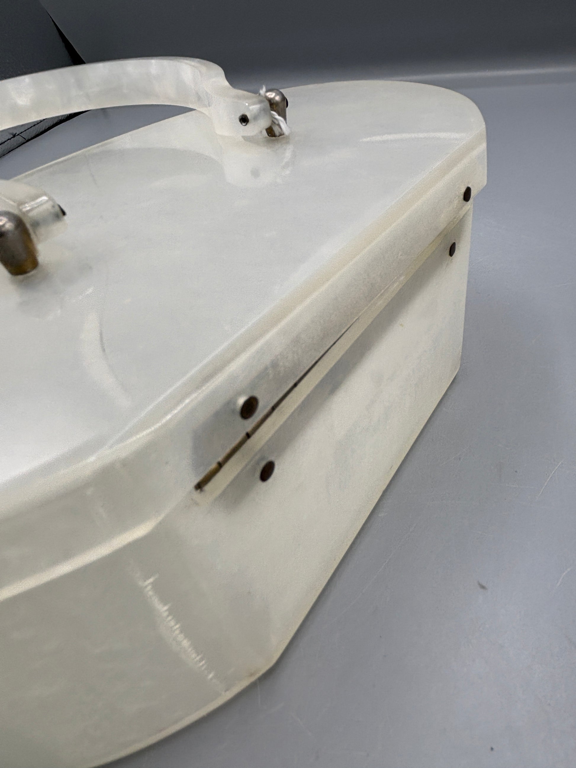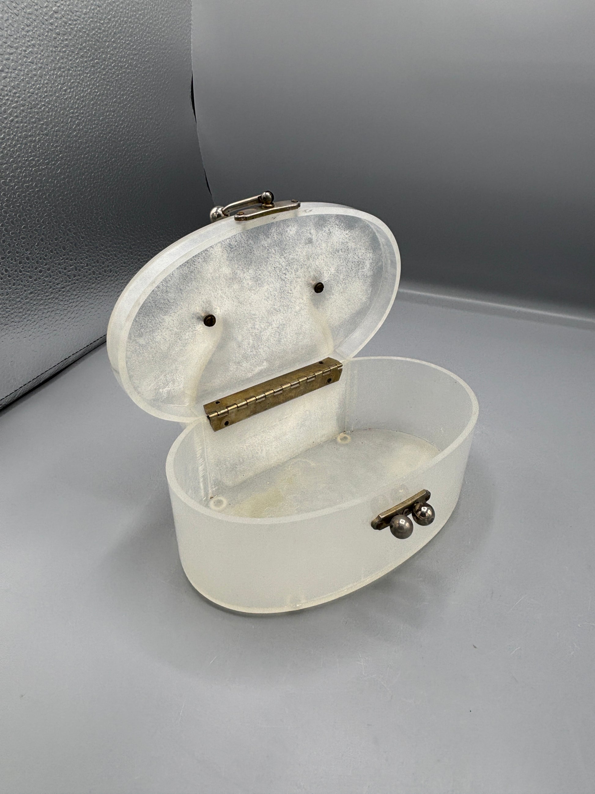 This striking vintage hard purse showcases the distinctive marbleized Lucite aesthetic characteristic of mid-century design. Featuring a compact 7½ x 3¼ inch frame with an 8-inch handle, it offers practical elegance for evening occasions or as a collector's piece. Please note: one hinge rivet requires replacement to restore full functionality. A testament to quality craftsmanship and timeless style.