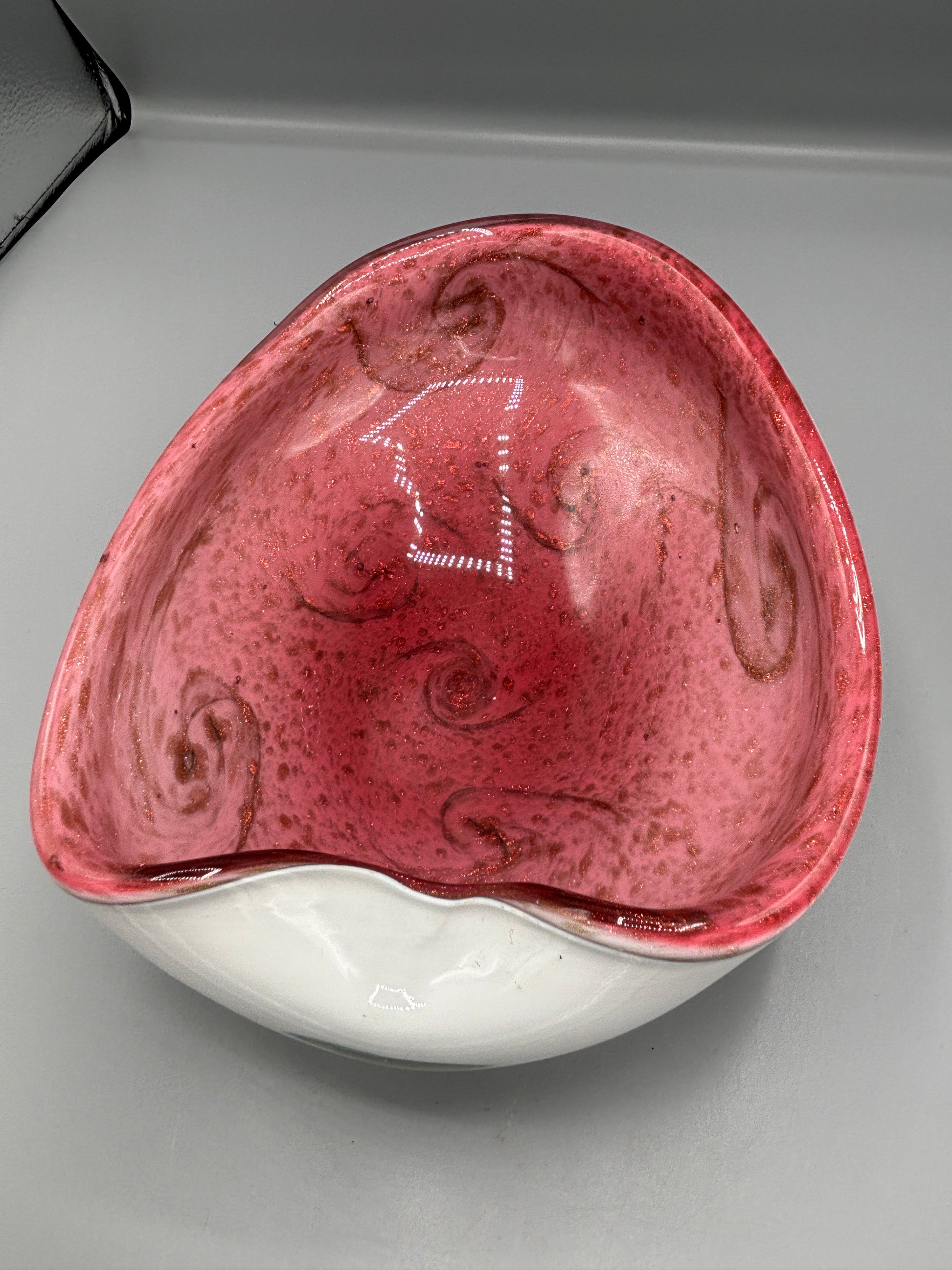 Vintage Murano Crimped bowl that is gold & pink. This would make a stunning display bowl in any room. The colors are vibrant and this is a heavy bowl that will last. This shows no damages.