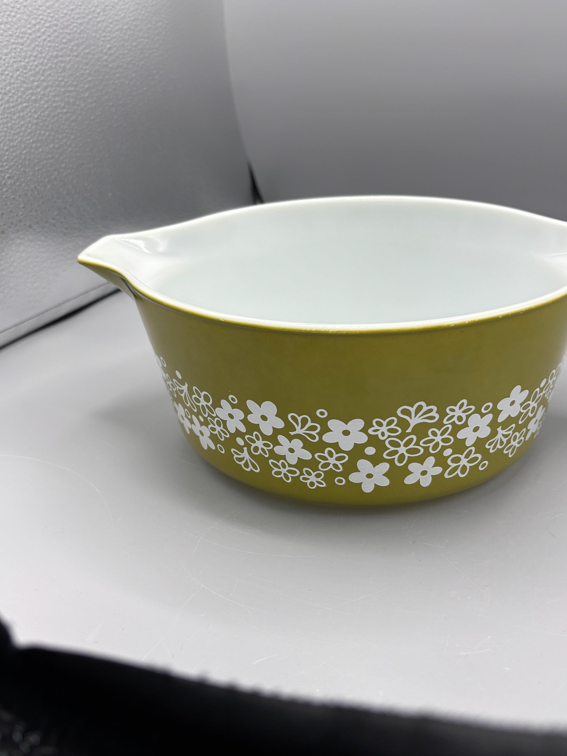 Vintage Pyrex 2.5 qt green Spring Blossom bowl that has scratches inside. This is a nice bowl to give as a gift or add to your collection.