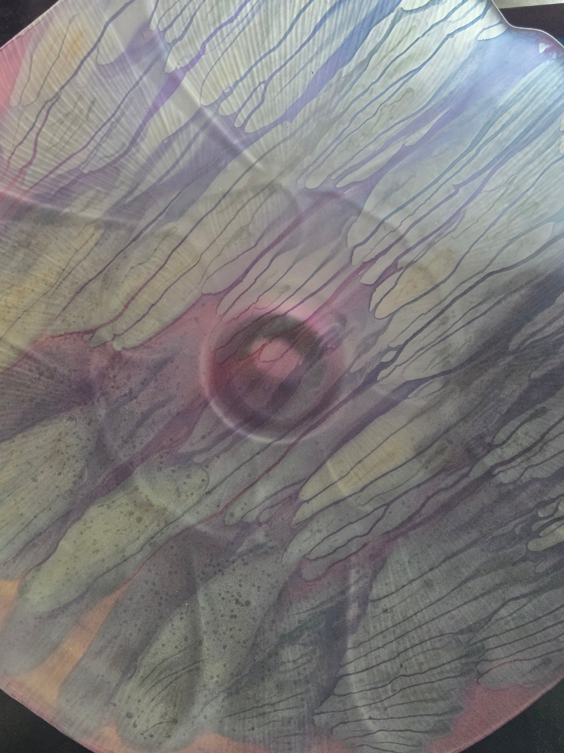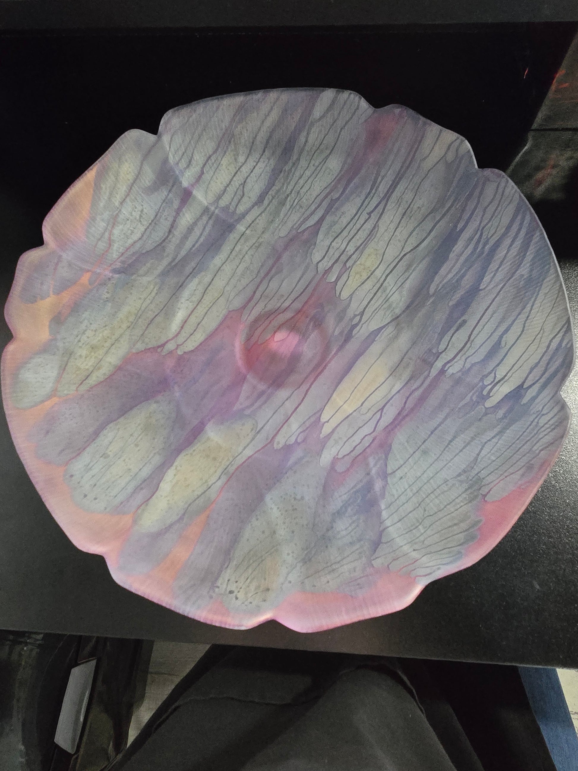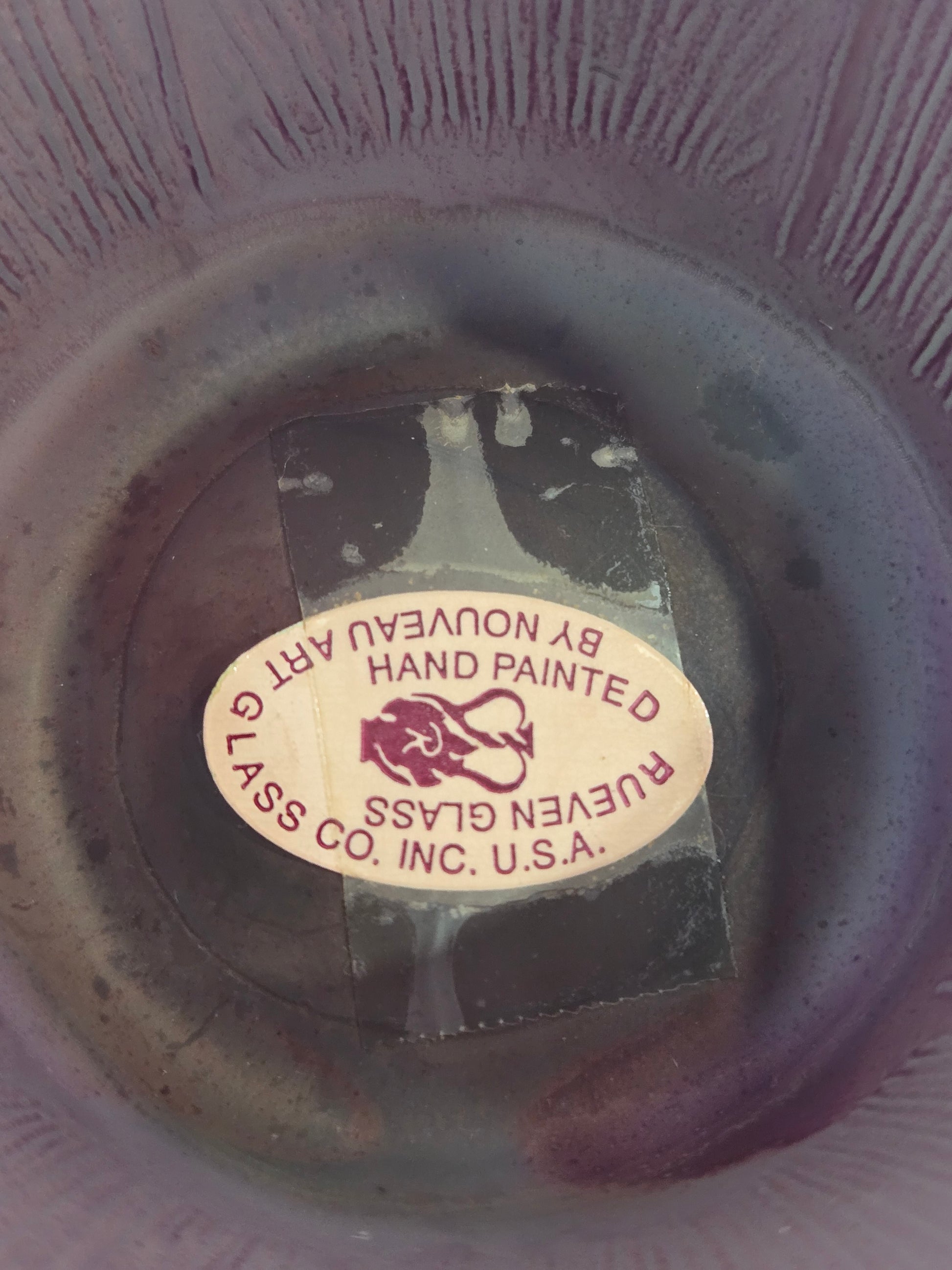 For those who love the looks of watercolors, Rueven glass is known for stunning pieces. The glass cake stand is dipped into a water bath with paint in it, creating unique shapes and drips on the piece. There is a repair on the bottom of the stand. Please refer to pictures