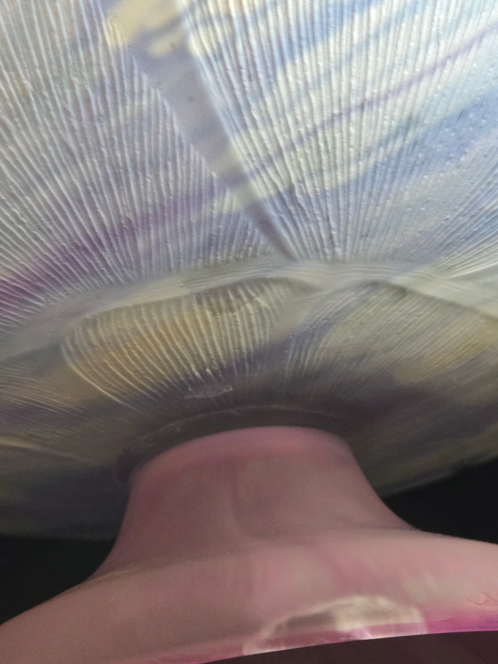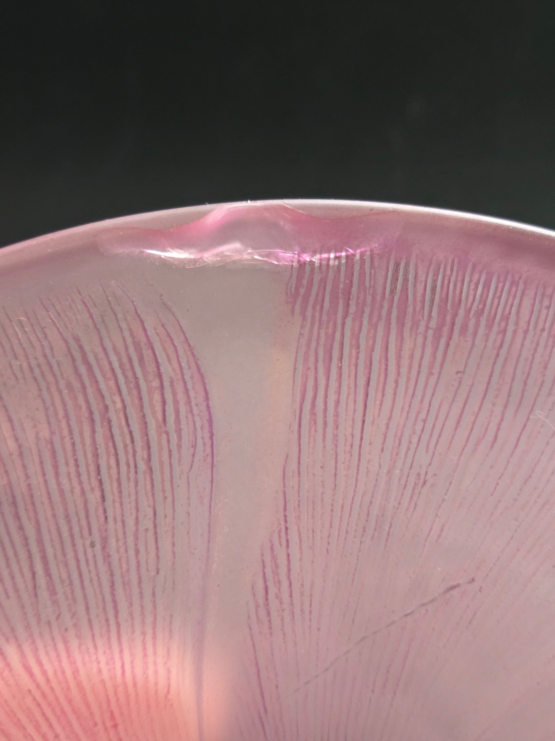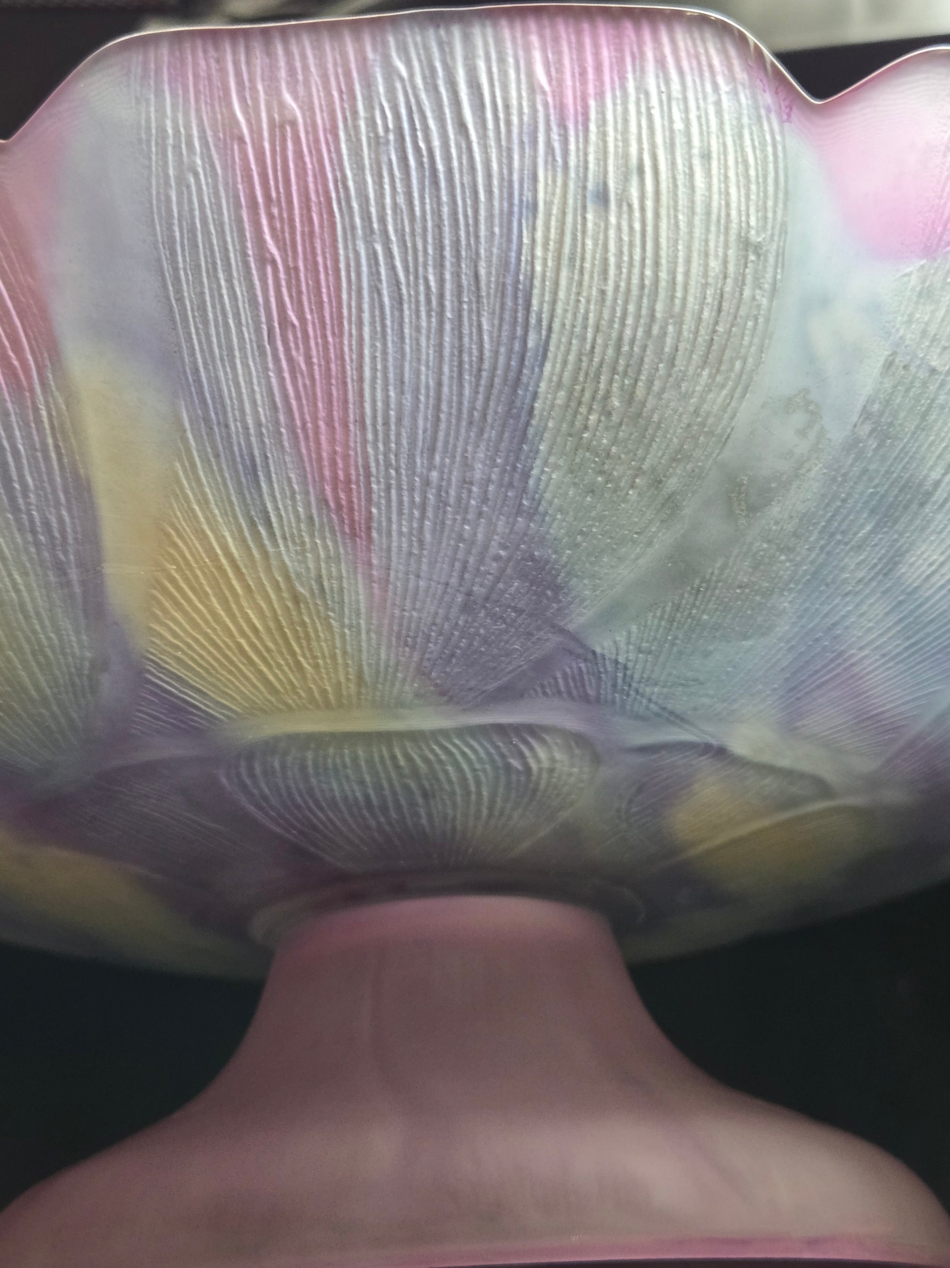 For those who love the looks of watercolors, Rueven glass is known for stunning pieces. The glass cake stand is dipped into a water bath with paint in it, creating unique shapes and drips on the piece. There is a repair on the bottom of the stand. Please refer to pictures