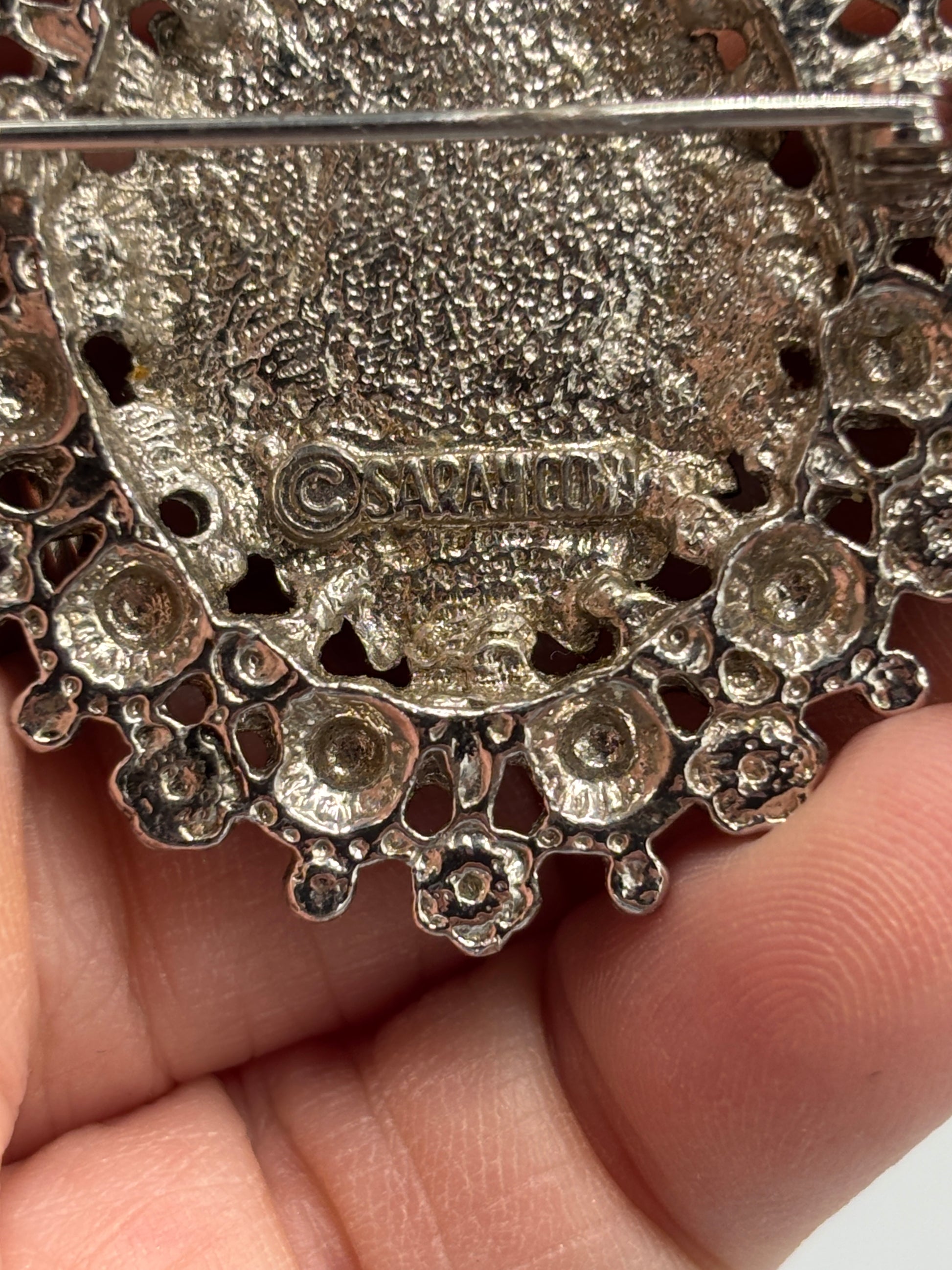 Vintage Sarah Coventry silver tone brooch with purple rhinestone and faux pearls. This brooch also has a hook on the back.