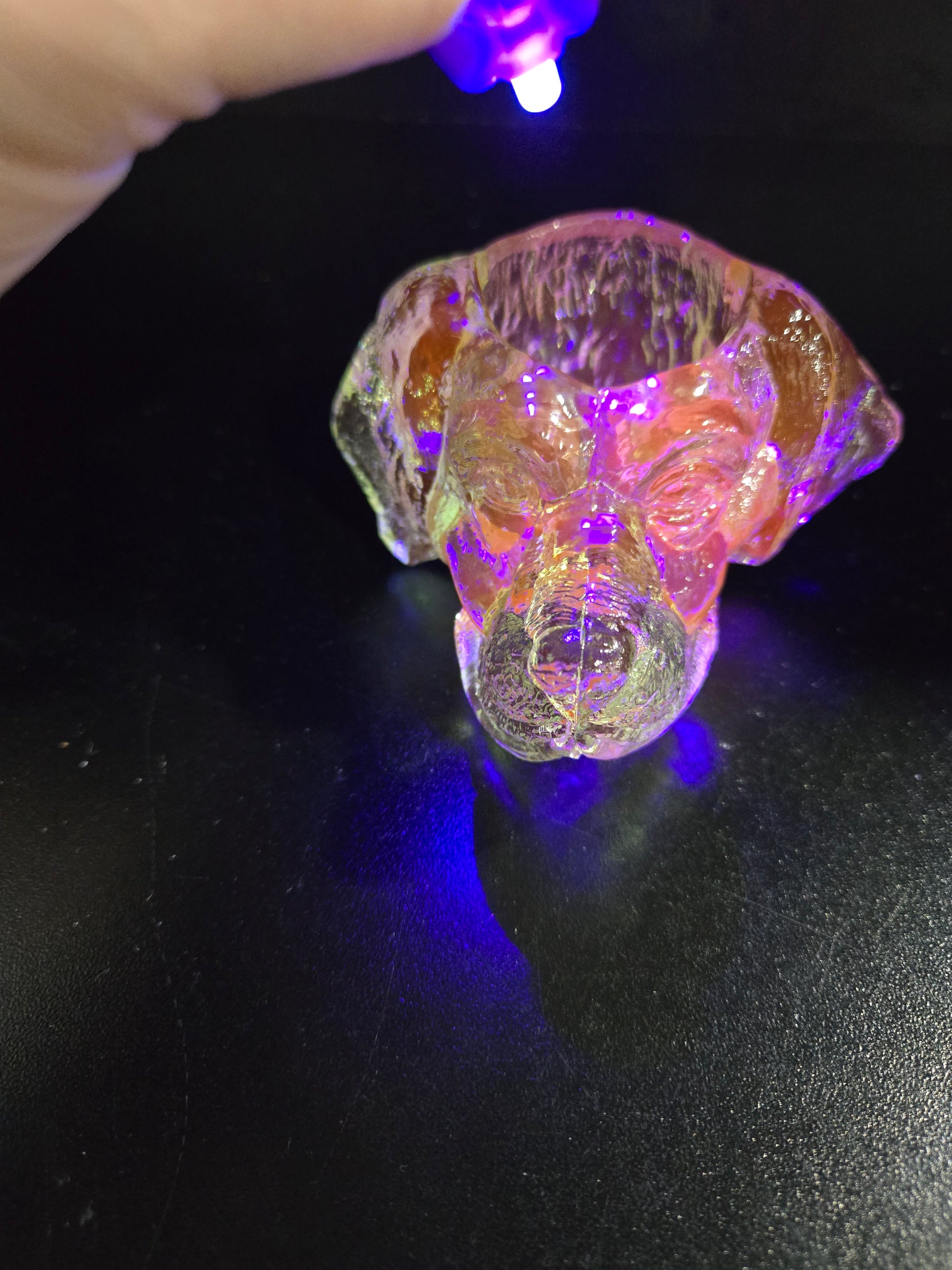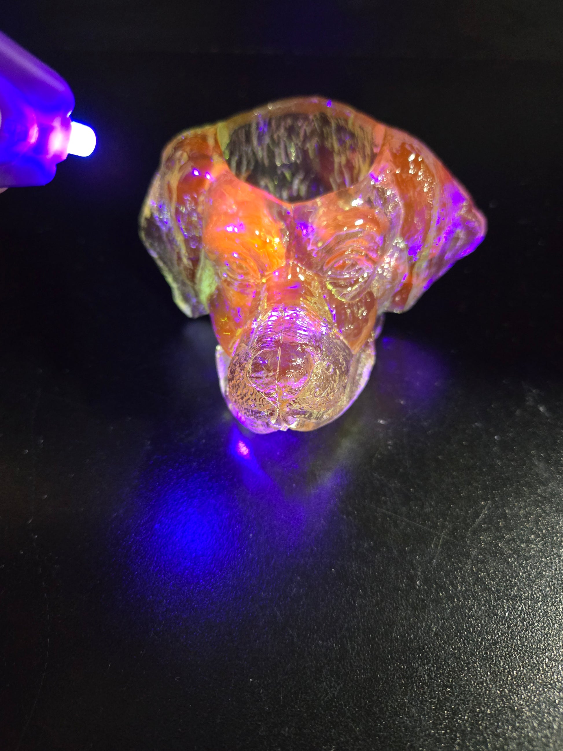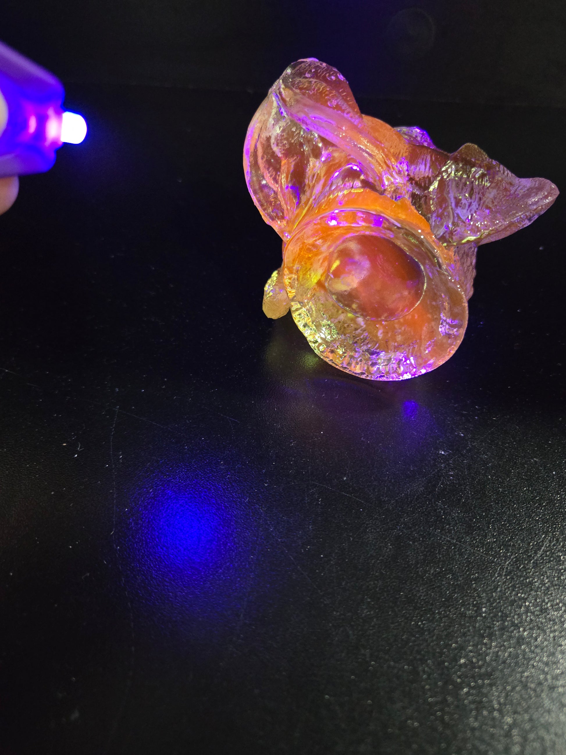Vintage Selenium dog toothpick holder that glows a lovely shade between orange & pink. This small dog is a rare find and looks amazing in natural light or under a blacklight. The pink is very bright under the blacklight. Refer to the pictures for the details and admire the work of this toothpick holder.