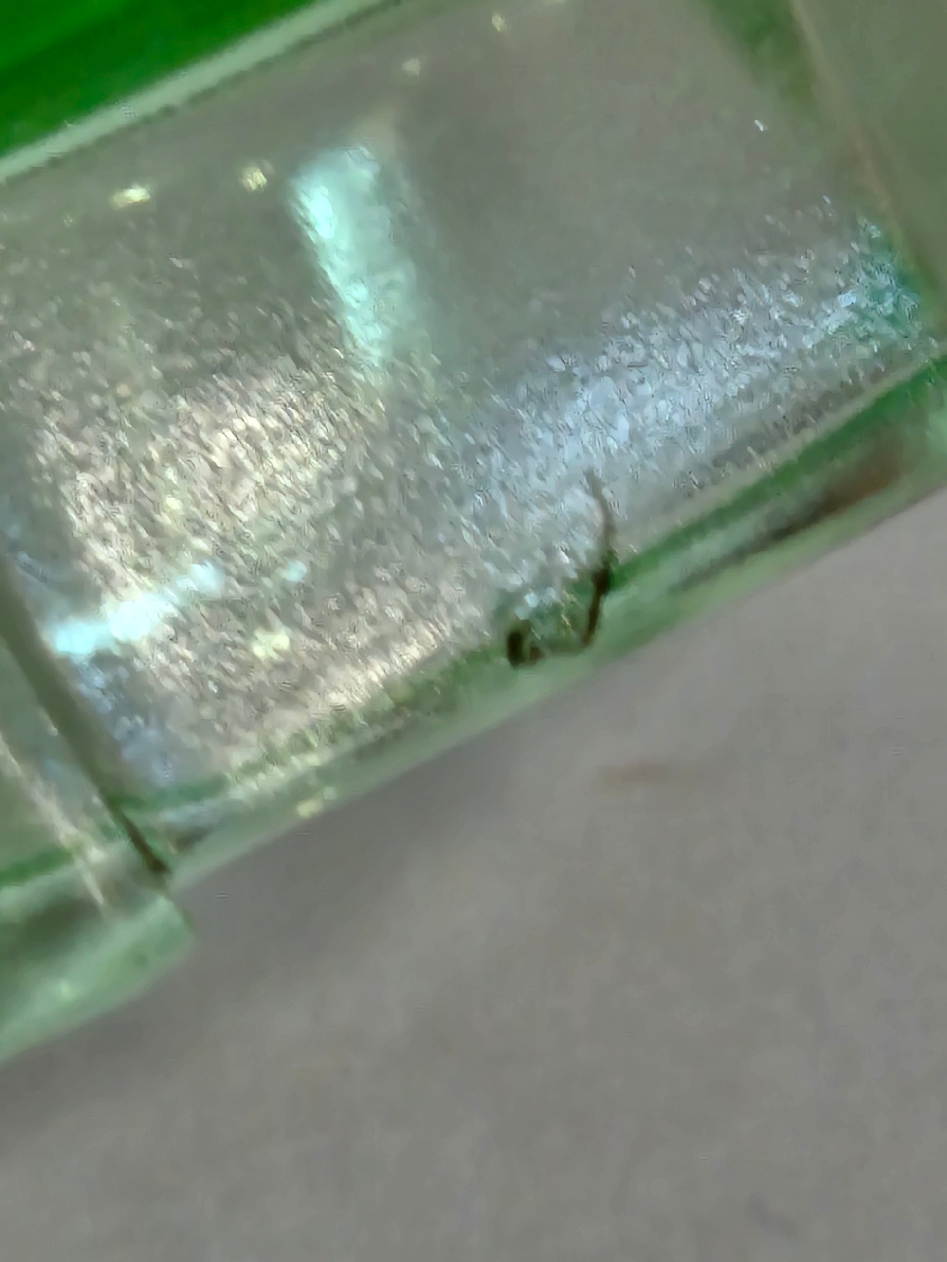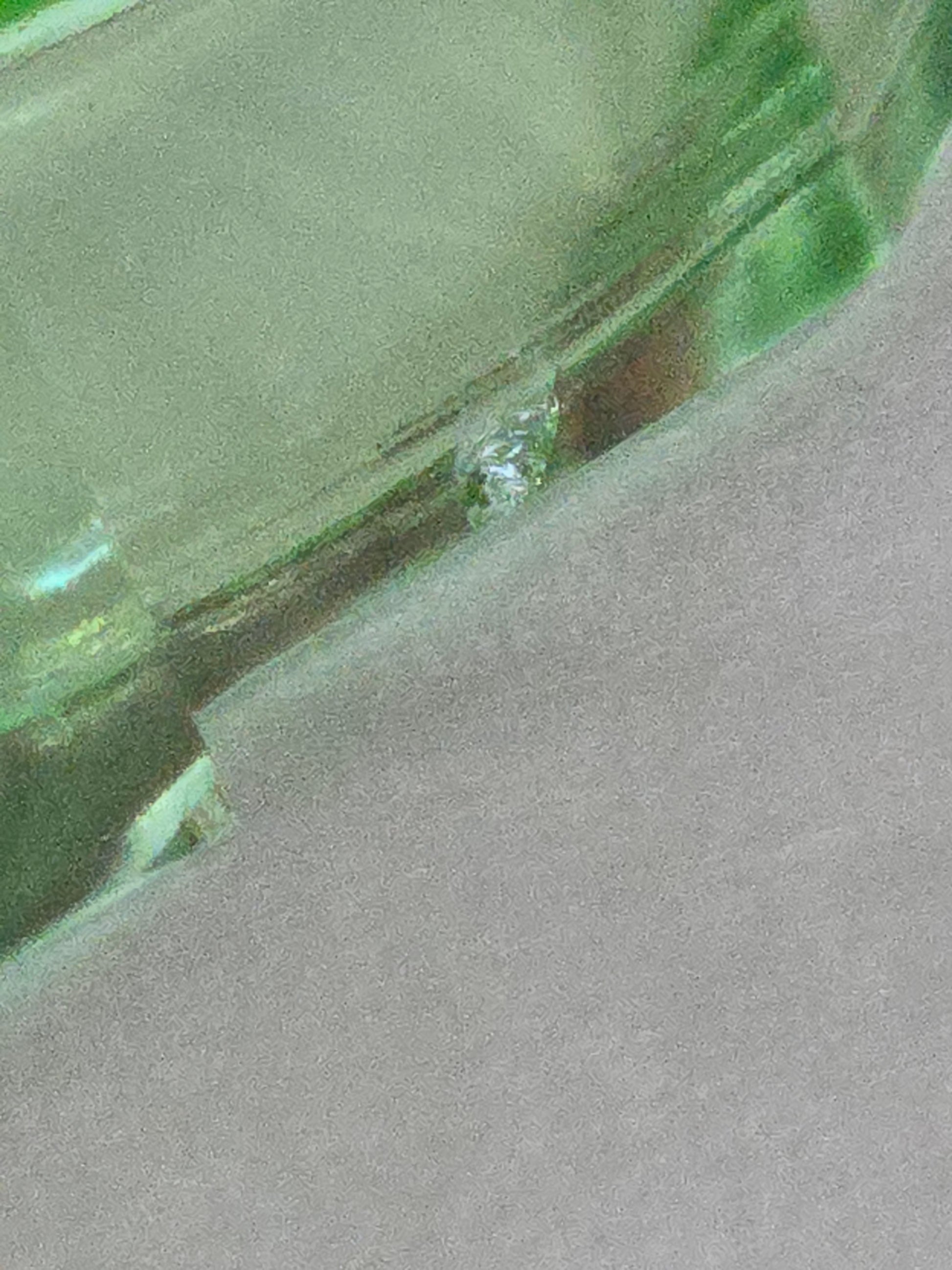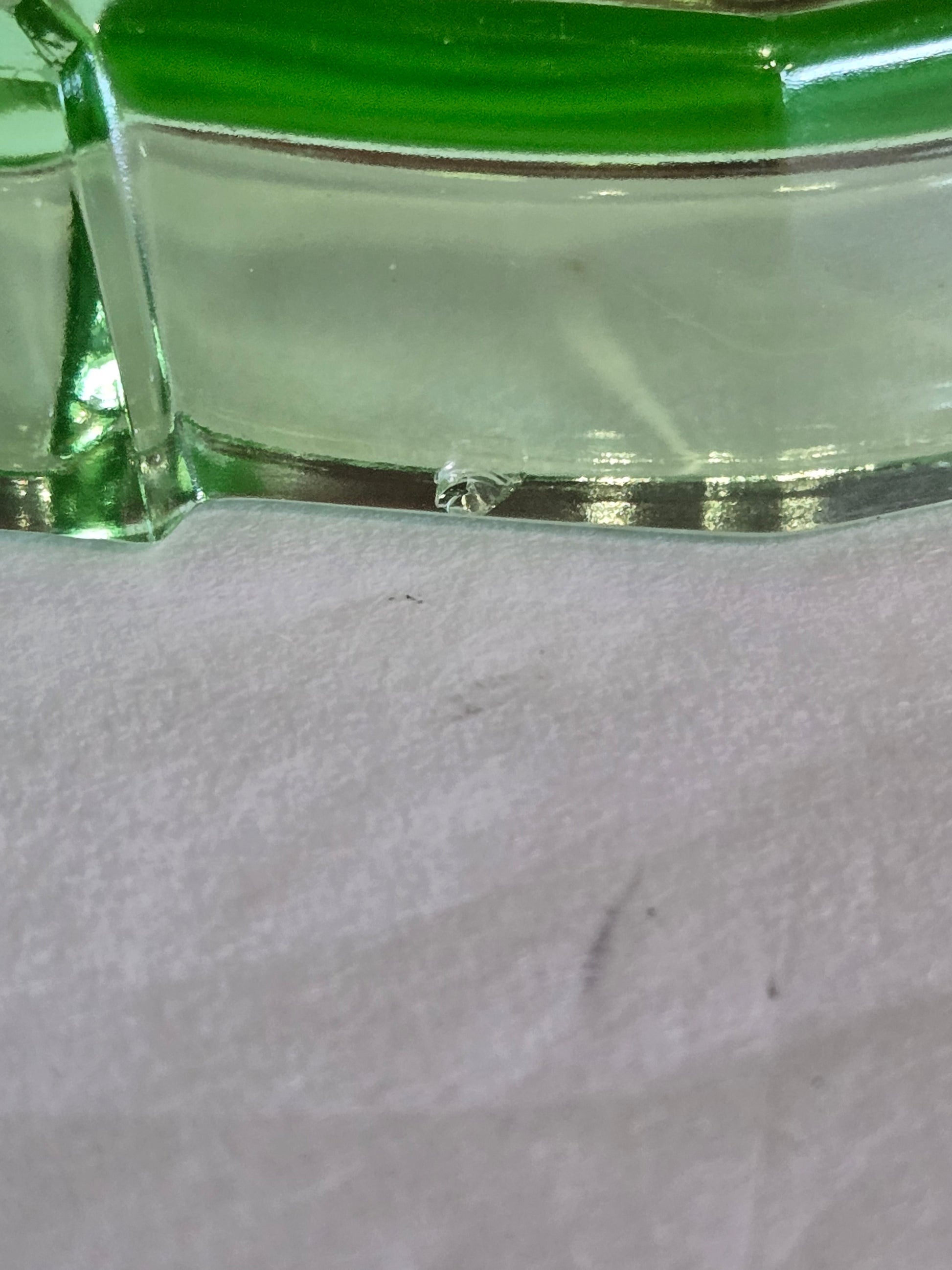 This beautiful set is a must have for collectors. This pattern is called Tea Room and it glows beautifully under a black light. There are no chips or cracks on the sugar & creamer, but there is a small chip on the bottom section of the caddy.