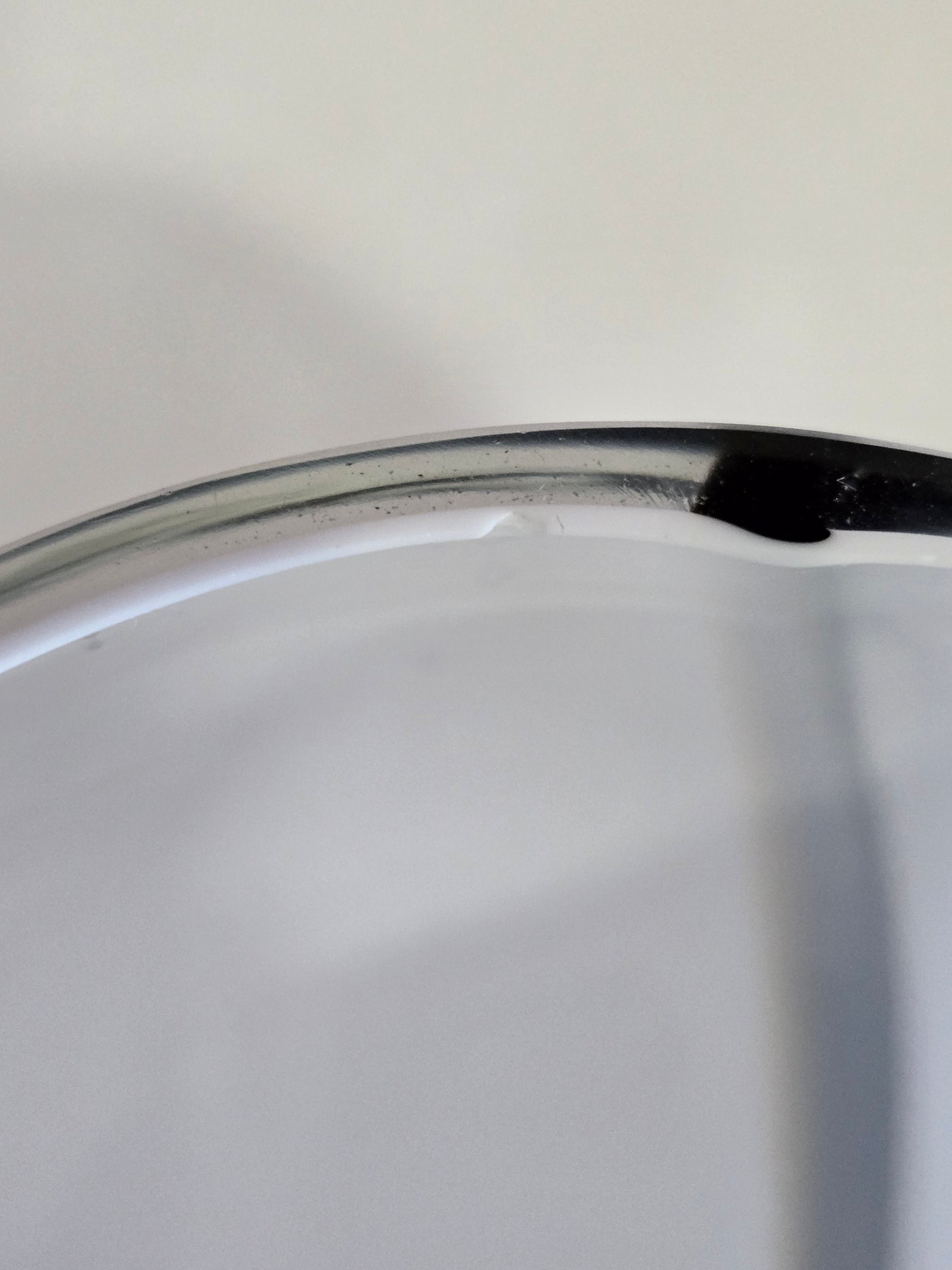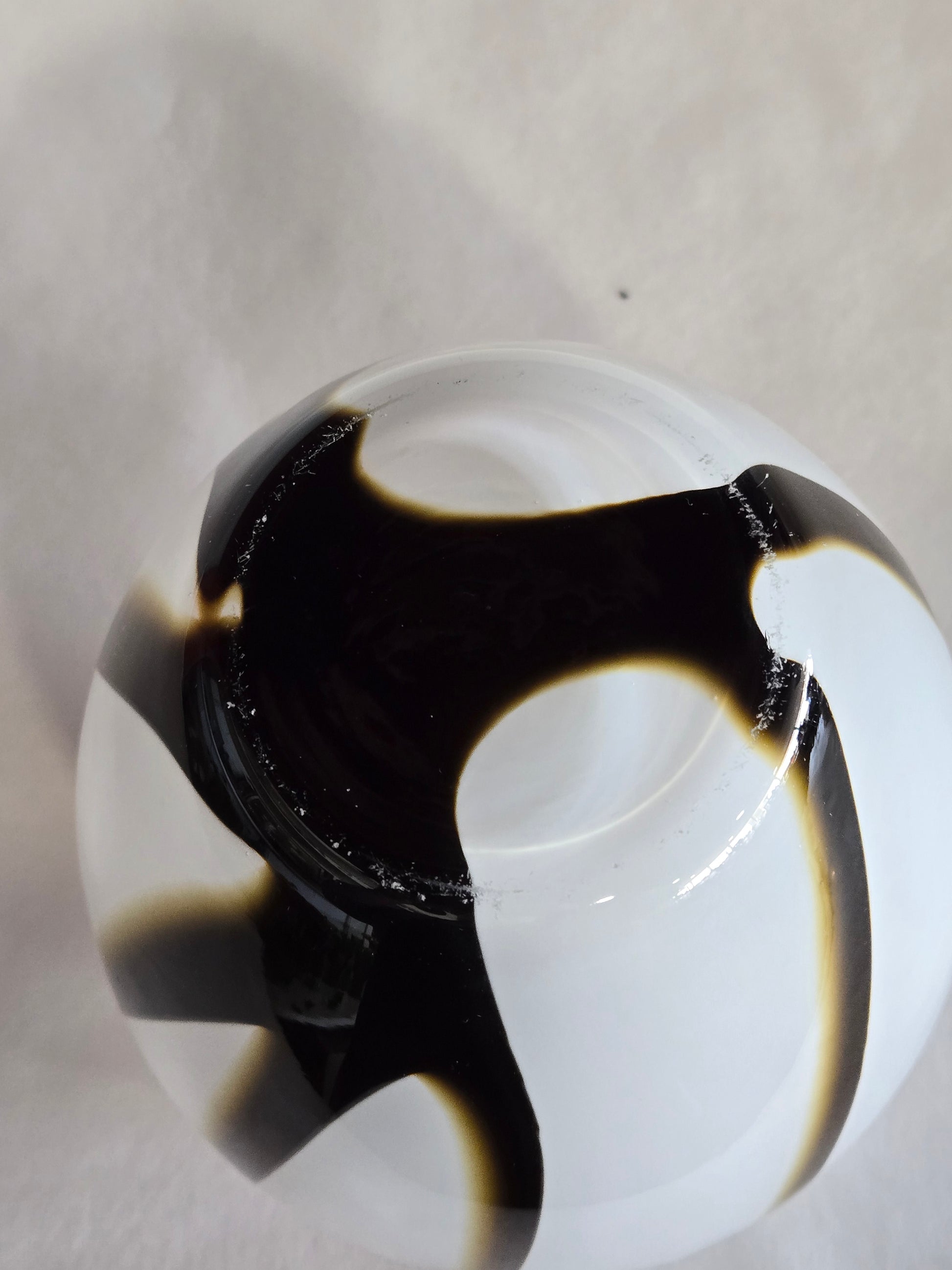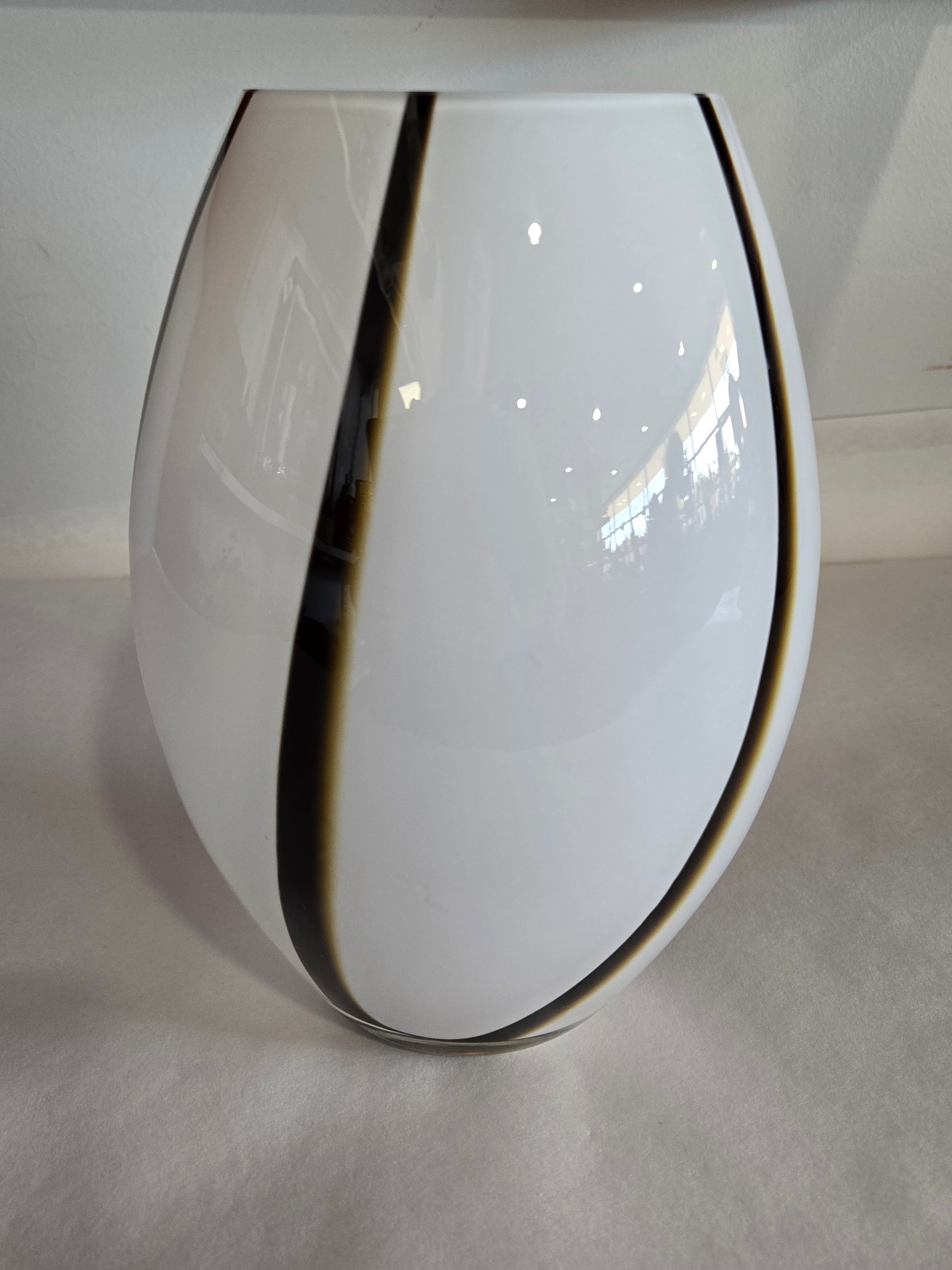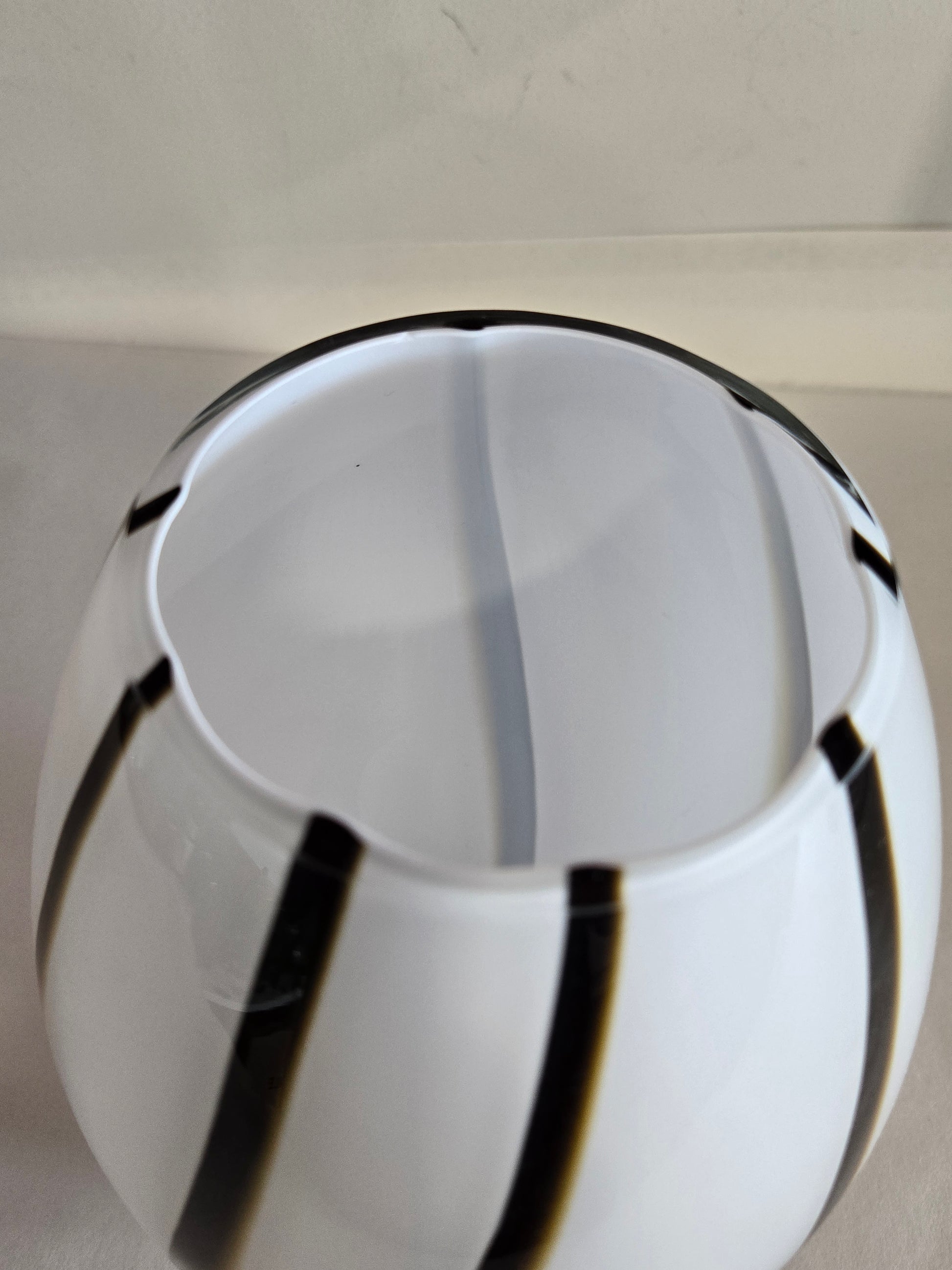 This lovely vase is white with brown vertical stripes encased in clear glass. The stripes are not symmetrical, adding fluidity to the design. There are no chips or cracks, but the top rim can feel a little sharp on the inside.