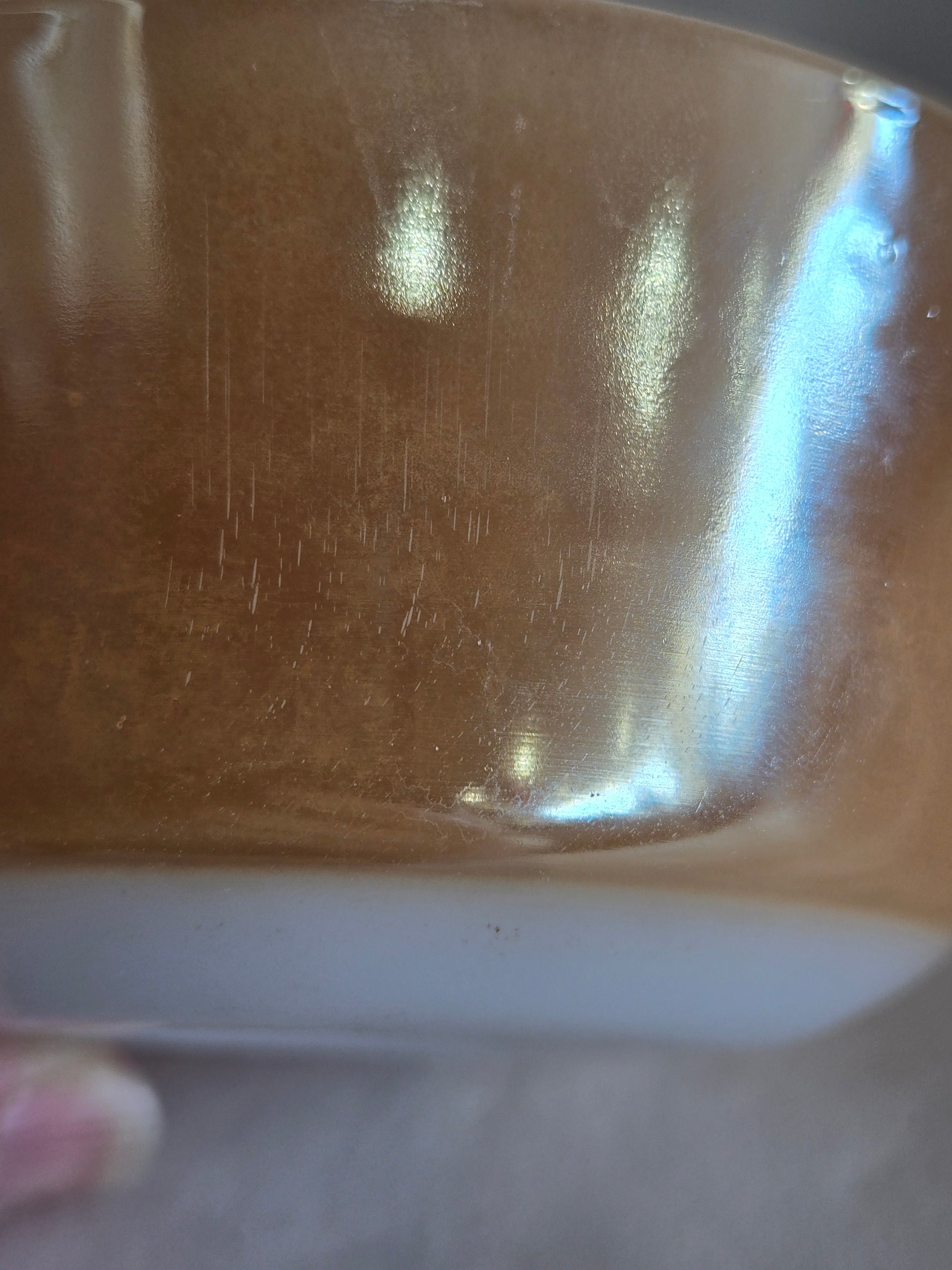 This vintage Fire King Peach Luster custard bowl showcases the timeless charm of mid-century glassware with its warm, iridescent finish. Despite visible paint loss and surface scratches, it remains a valuable collector’s piece, offering authentic character and nostalgic appeal. Ideal for enthusiasts who appreciate the history and unique imperfections of vintage Fire King collectibles.