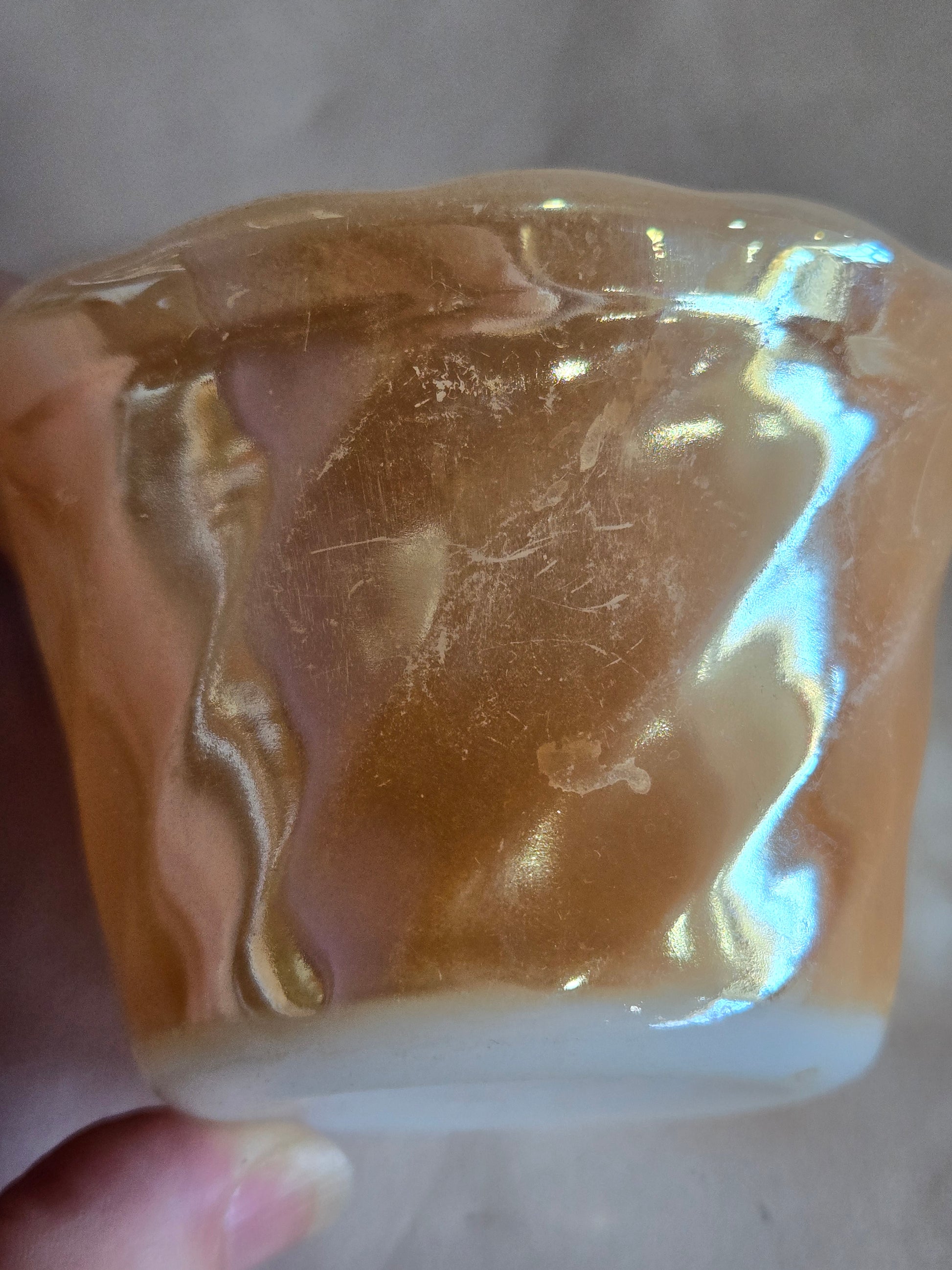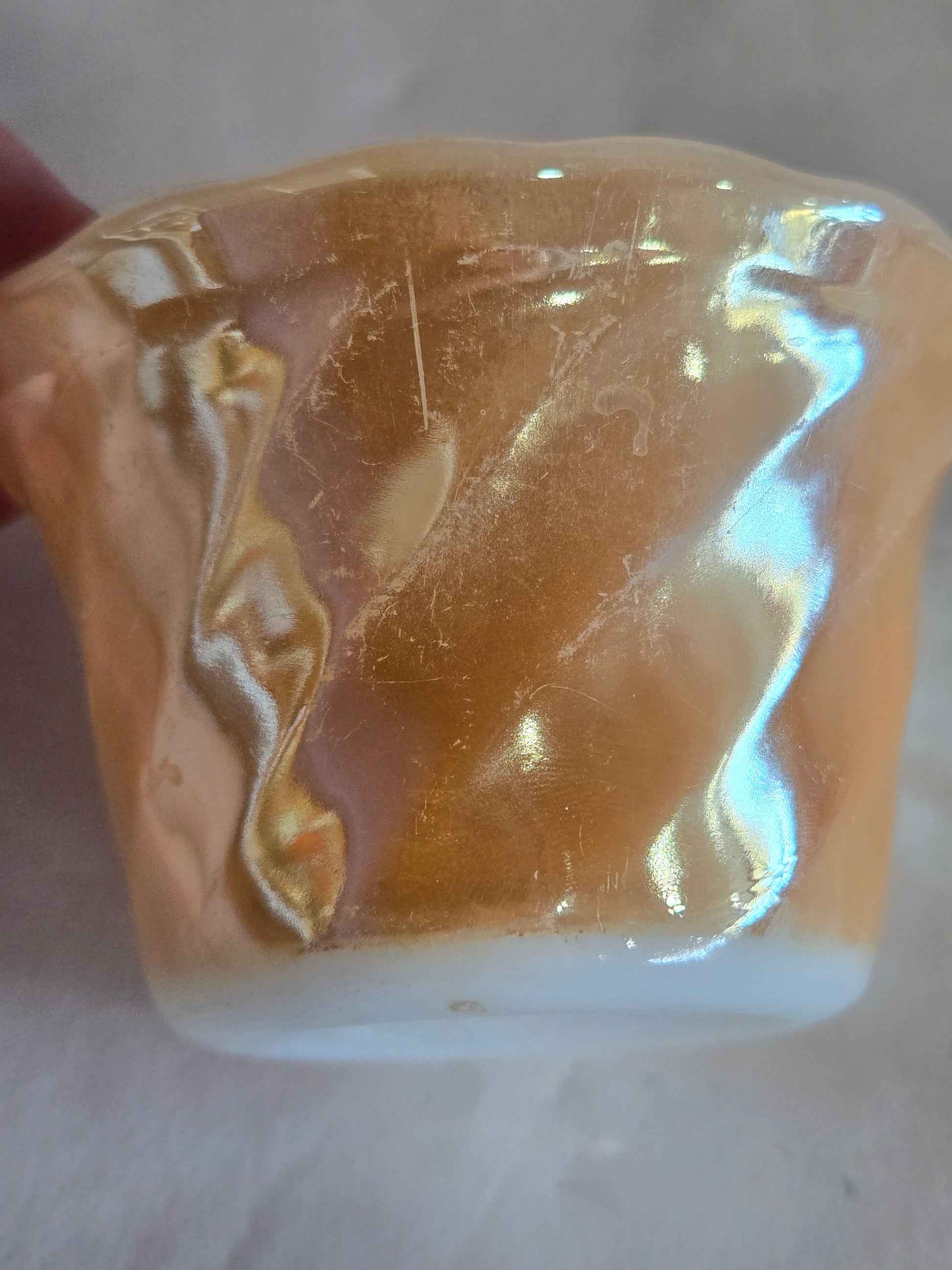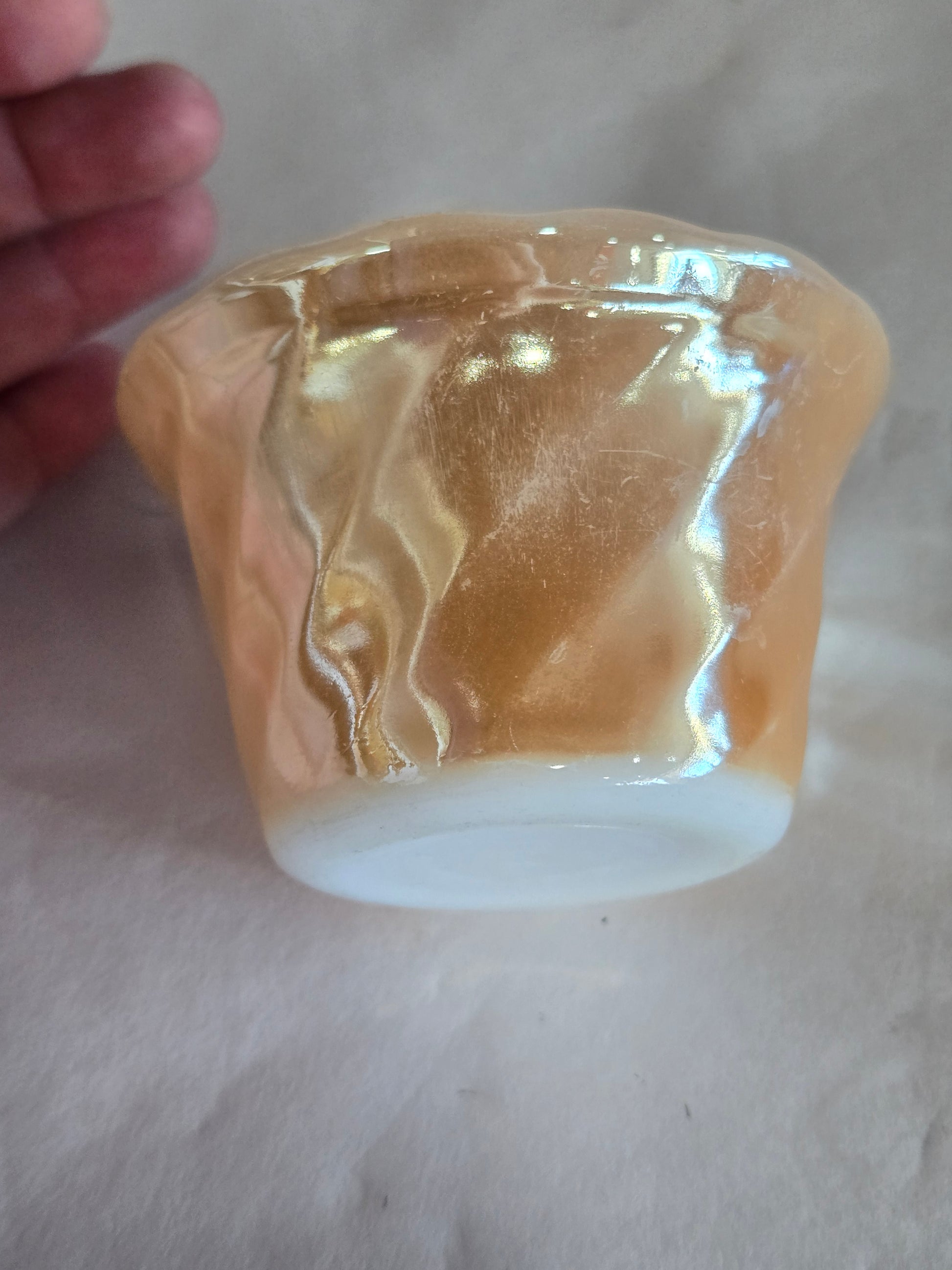 This vintage Fire King Peach Luster Swirl custard bowl offers a classic touch of mid-century charm with its distinctive peach luster finish and elegant swirl pattern. Crafted for durability and style, it reflects the iconic Fire King craftsmanship. Note that this piece shows signs of its age, including paint loss and scratches, which add character while reminding collectors of its authentic vintage origin. Ideal for collectors or enthusiasts seeking genuine mid-century glassware with a storied history.