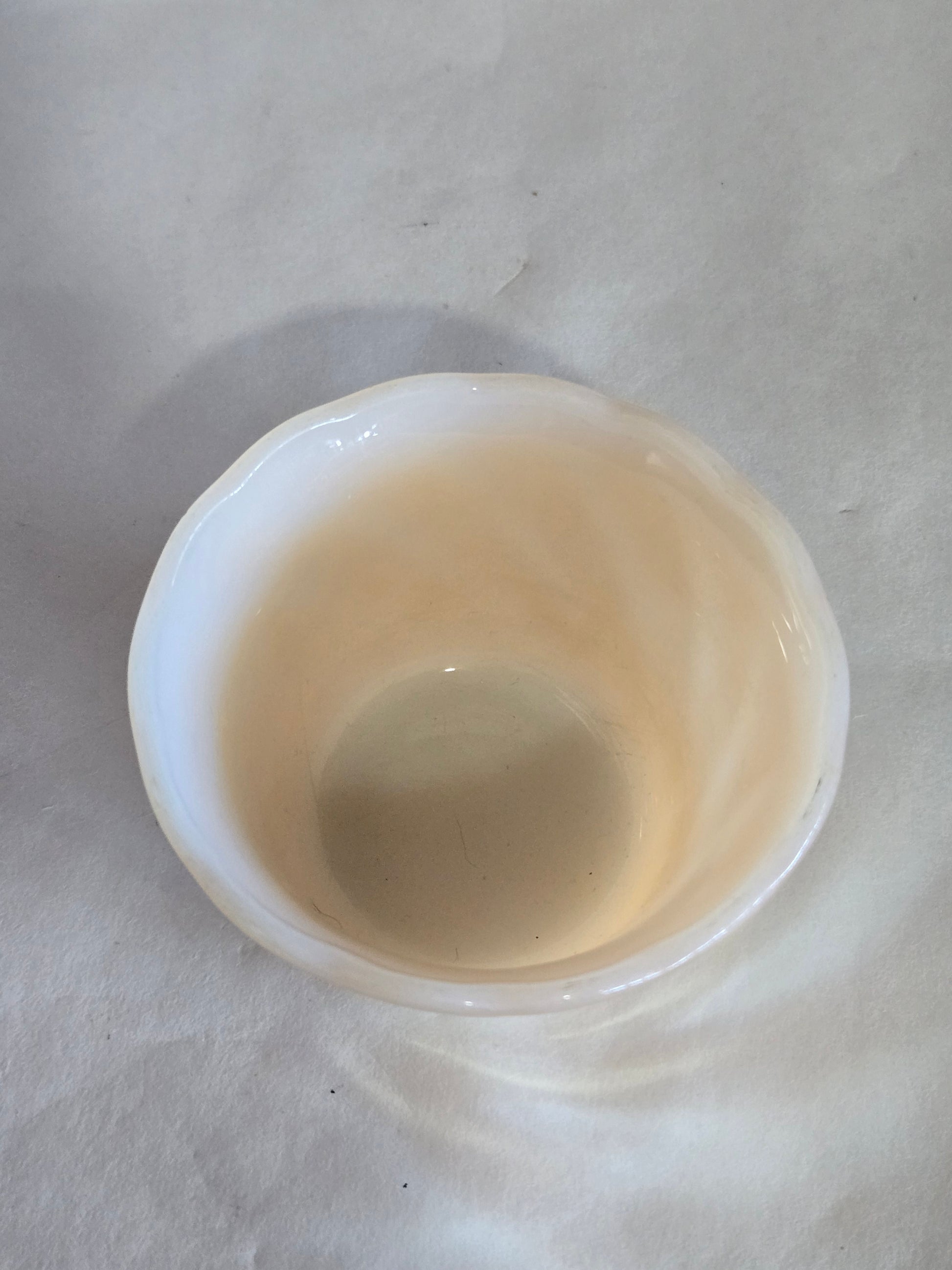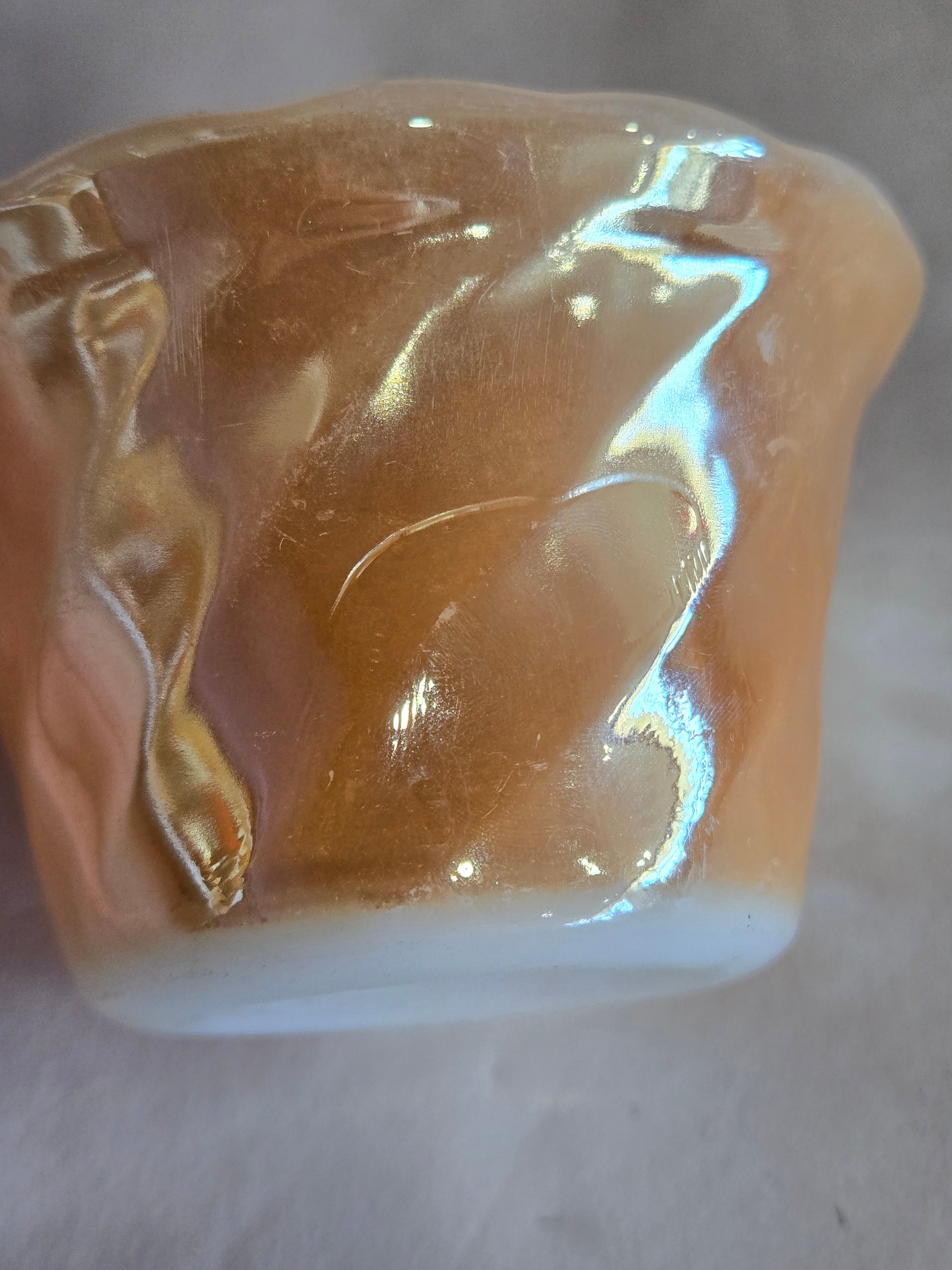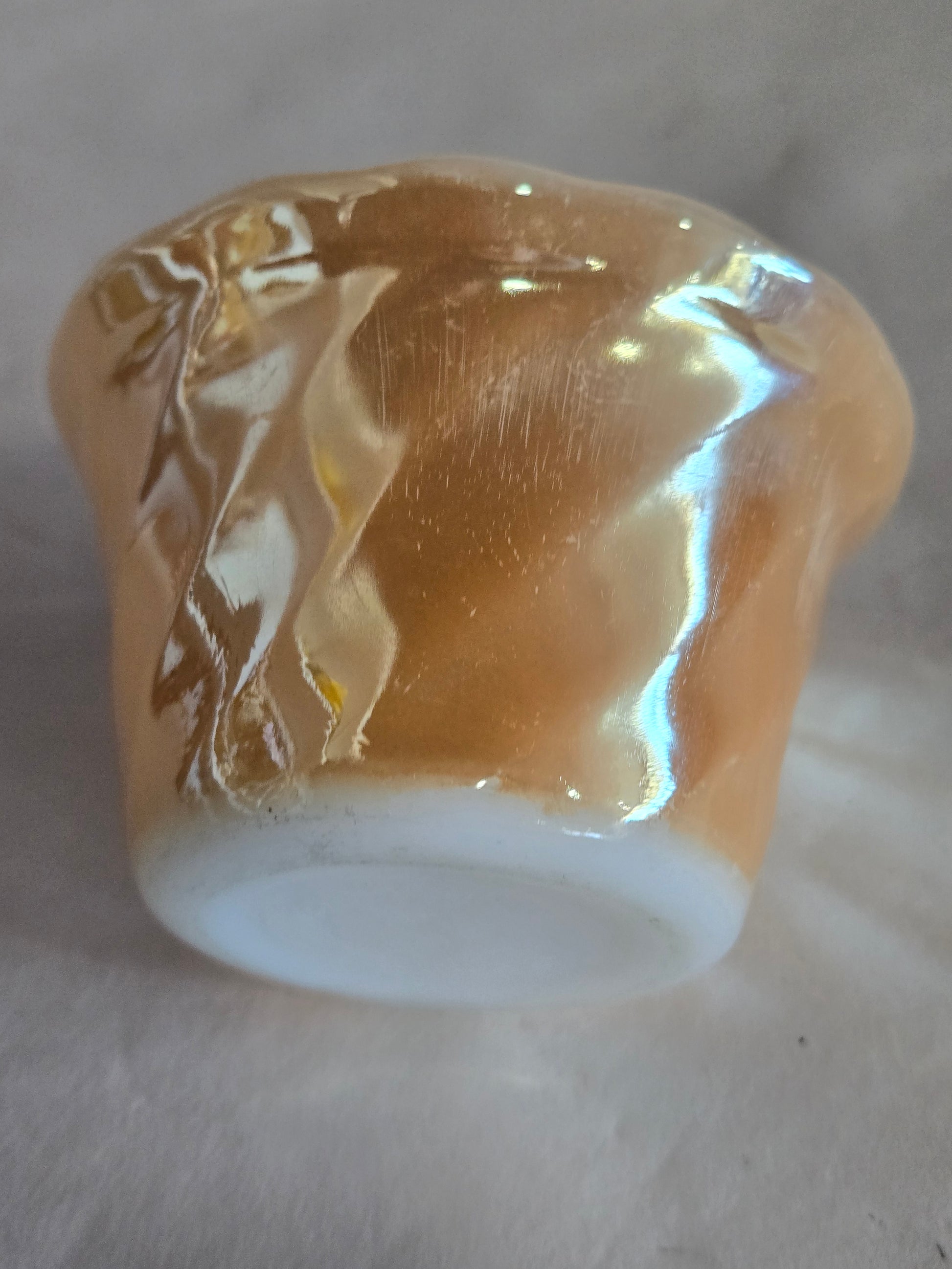 This vintage Fire King Peach Luster Swirl custard bowl offers a classic touch of mid-century charm with its distinctive peach luster finish and elegant swirl pattern. Crafted for durability and style, it reflects the iconic Fire King craftsmanship. Note that this piece shows signs of its age, including paint loss and scratches, which add character while reminding collectors of its authentic vintage origin. Ideal for collectors or enthusiasts seeking genuine mid-century glassware with a storied history.