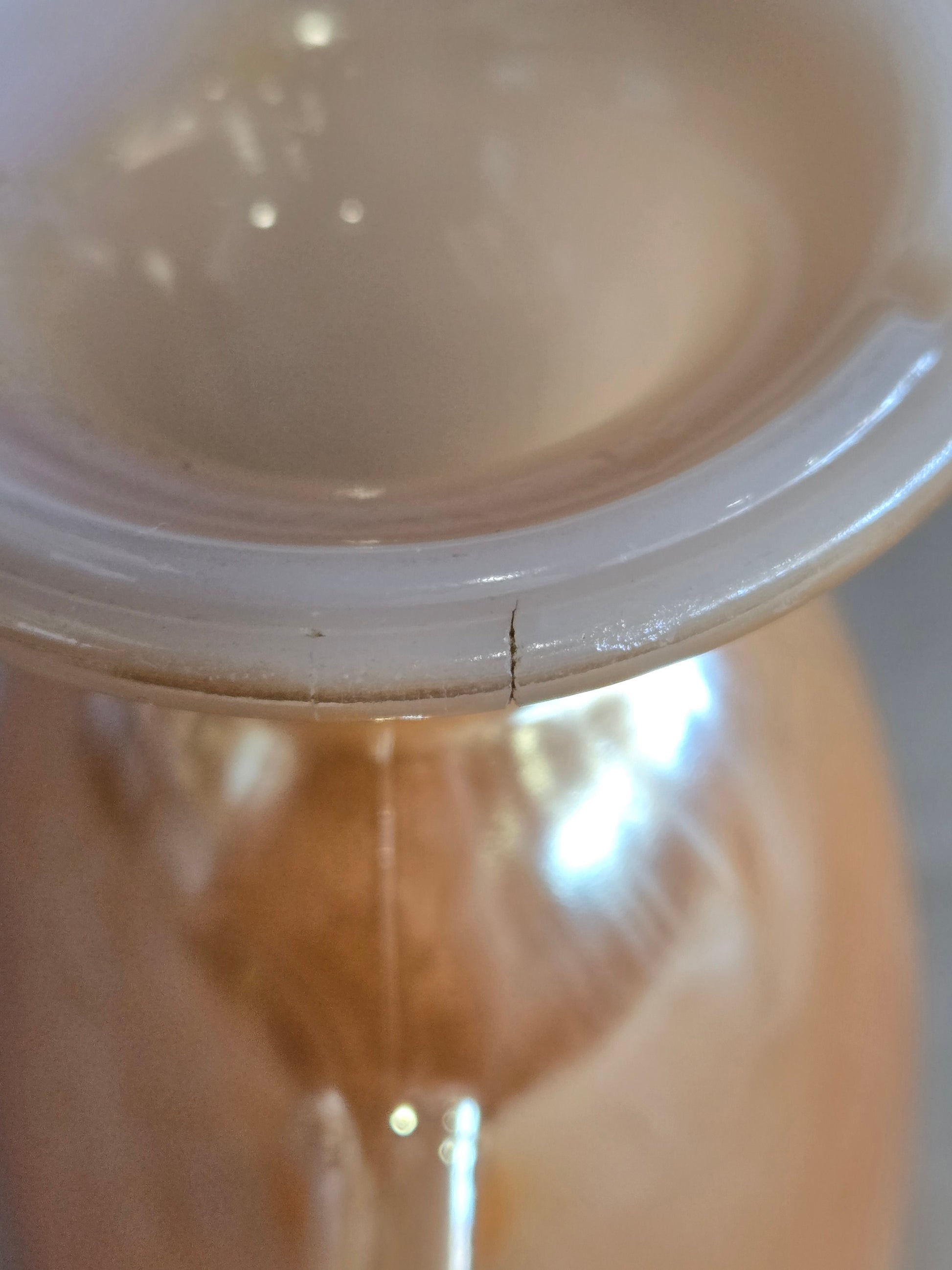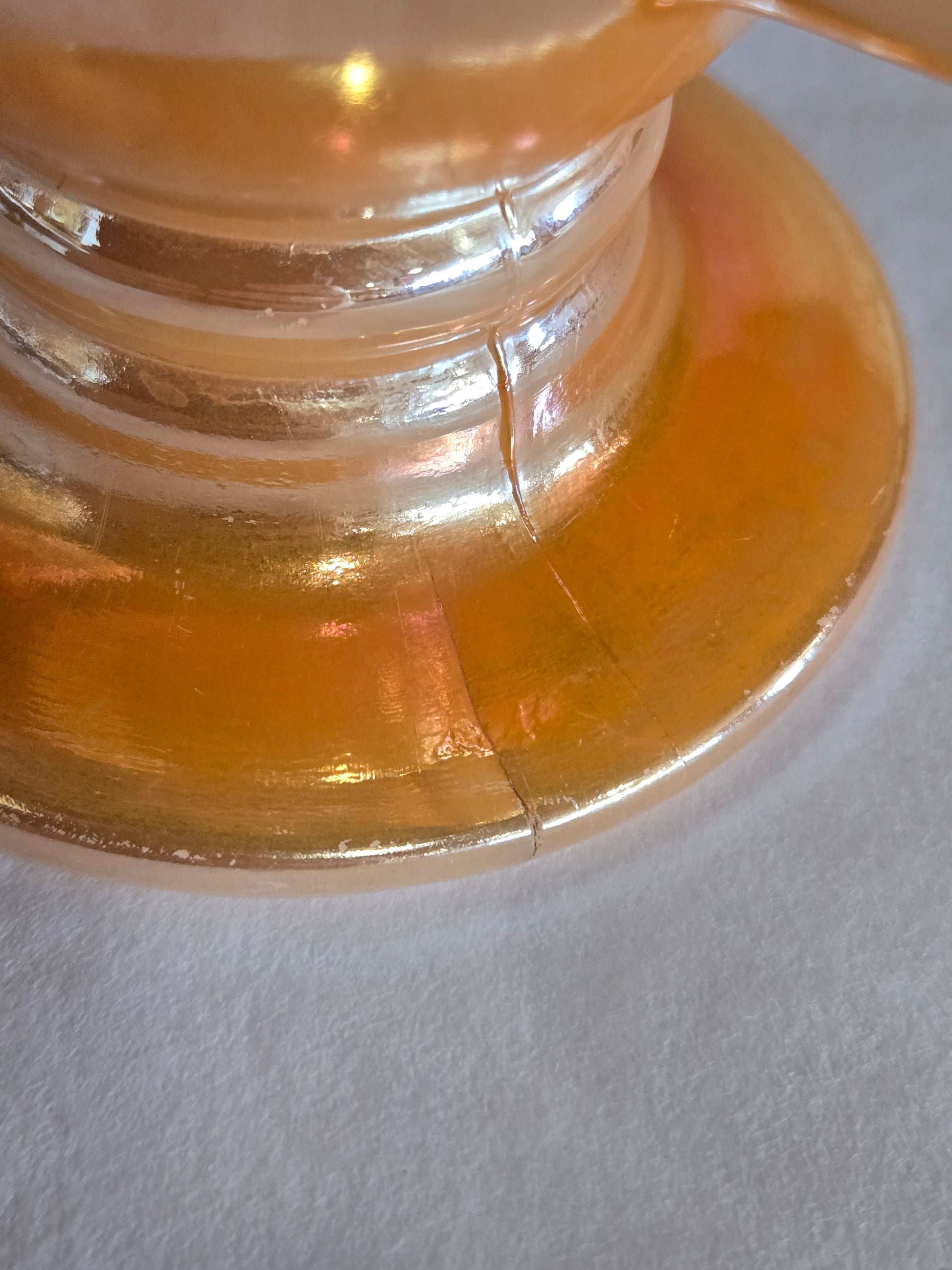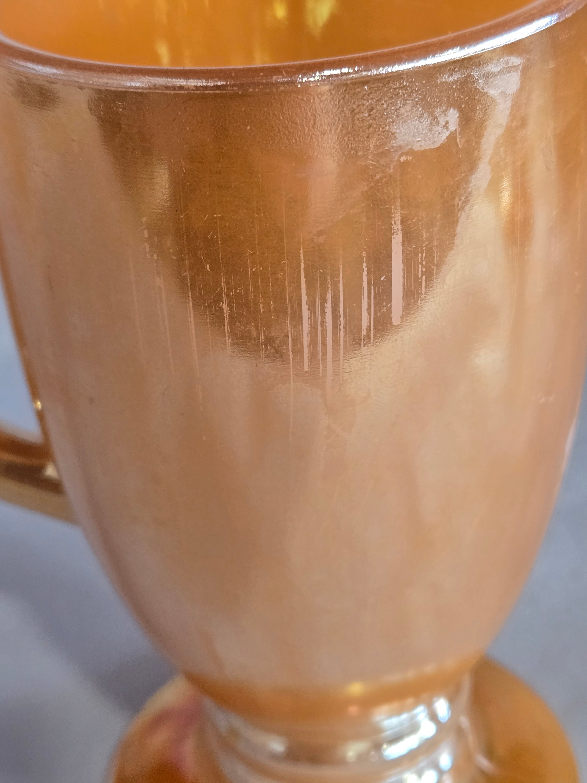 This vintage peach lusterware mug showcases a delicate shimmering finish characteristic of classic lusterware ceramics. Despite some visible cracks and scratches, it retains its nostalgic charm and makes an elegant addition for collectors or those appreciating antique tableware. Its unique aged patina offers a glimpse into the craftsmanship of earlier eras, making it a valued piece for vintage enthusiasts.